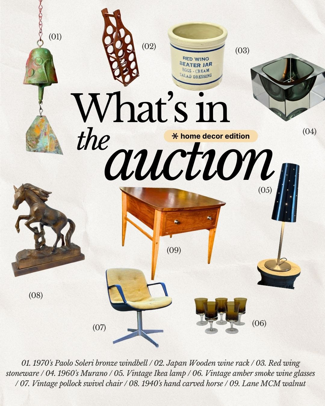 This Puyallup estate collection is a vibrant blend of mid-century design, colorful art glass, antique Americana, and standout collector pieces. From Lane walnut furniture and Pollock for Steelcase seating to Murano glass, Paolo Soleri bronze, and studio pottery, this sale brings together decades of design under one roof. Shoppers will discover Red Wing stoneware, Fire-King and Pyrex kitchen classics, hand-blown European glass, antique tools, whimsical folk art, vintage lighting, designer accessories, and rare decorative finds spanning the 1940s through the 1980s.With sculptural mirrors, art pottery, chalkware, antique primitives, and playful retro accents throughout, this is a layered, design-forward estate offering something for both serious collectors and nostalgic treasure hunters alike.