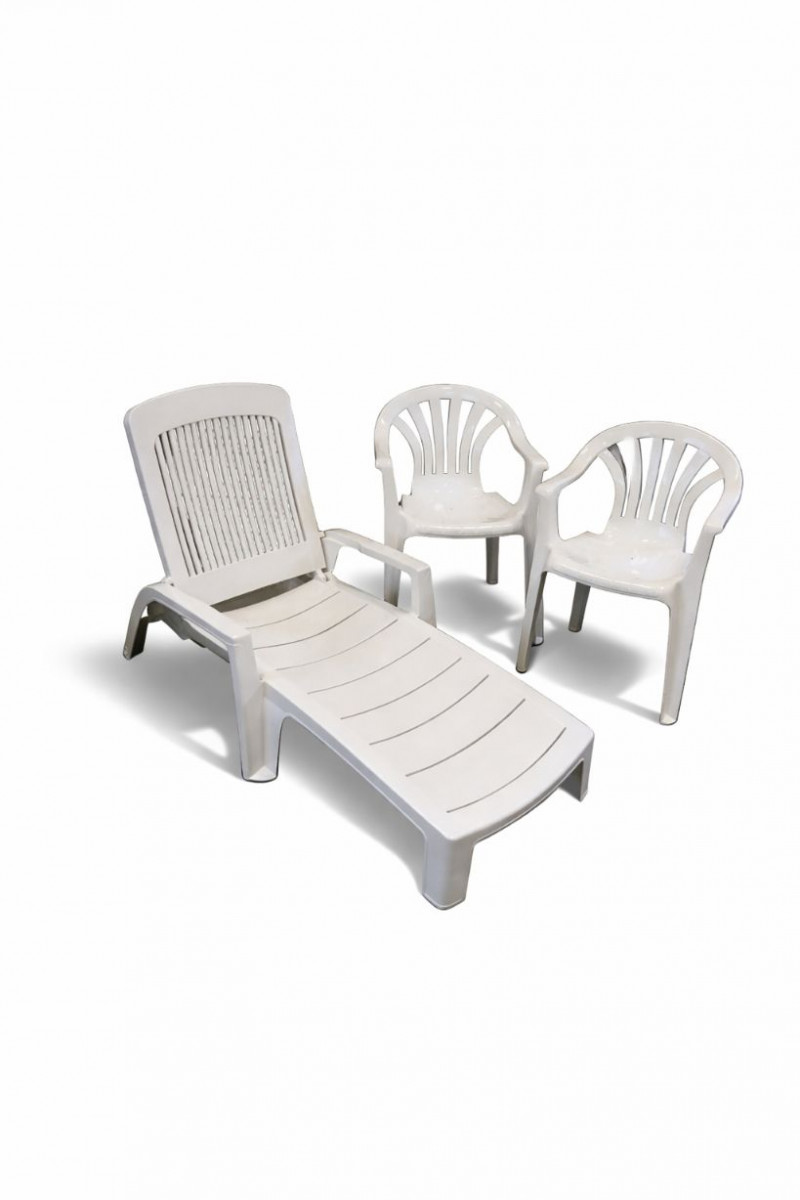 Lot # 13 - White Plastic Patio Chaise Lounge & 2 Outdoor Chairs Starting Bid: $ 5.00 Bids: This sale will end in: |