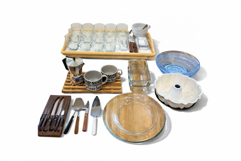 Kitchenware, cookware, glassware, storage items, and practical household goods useful for everyday living.