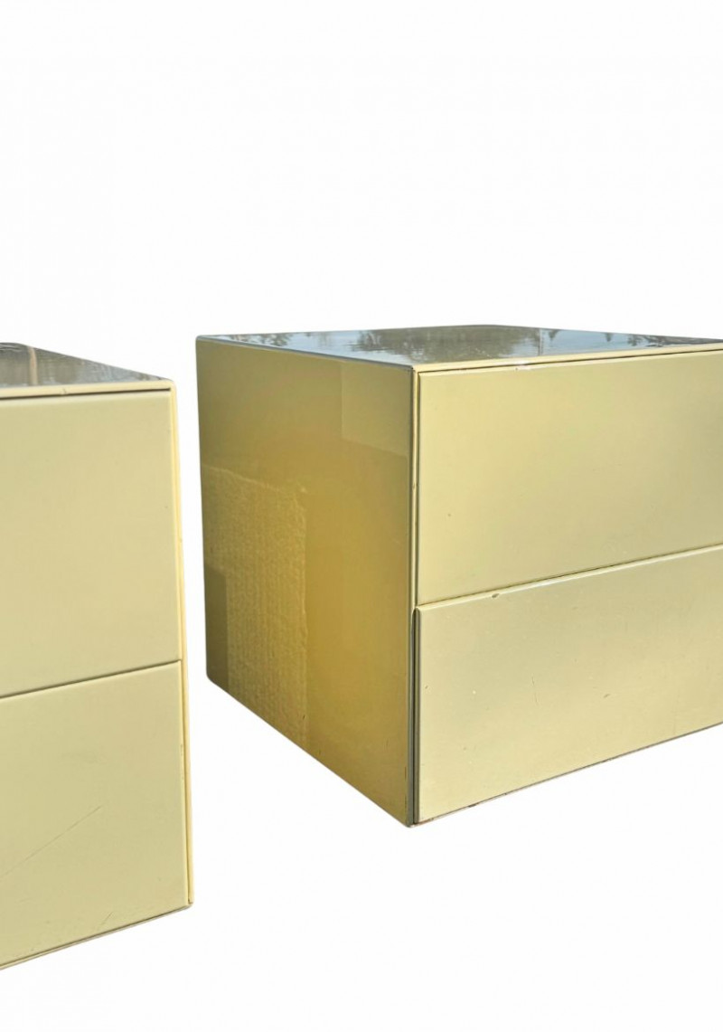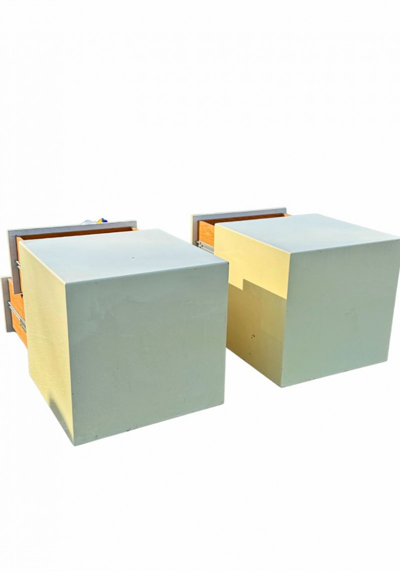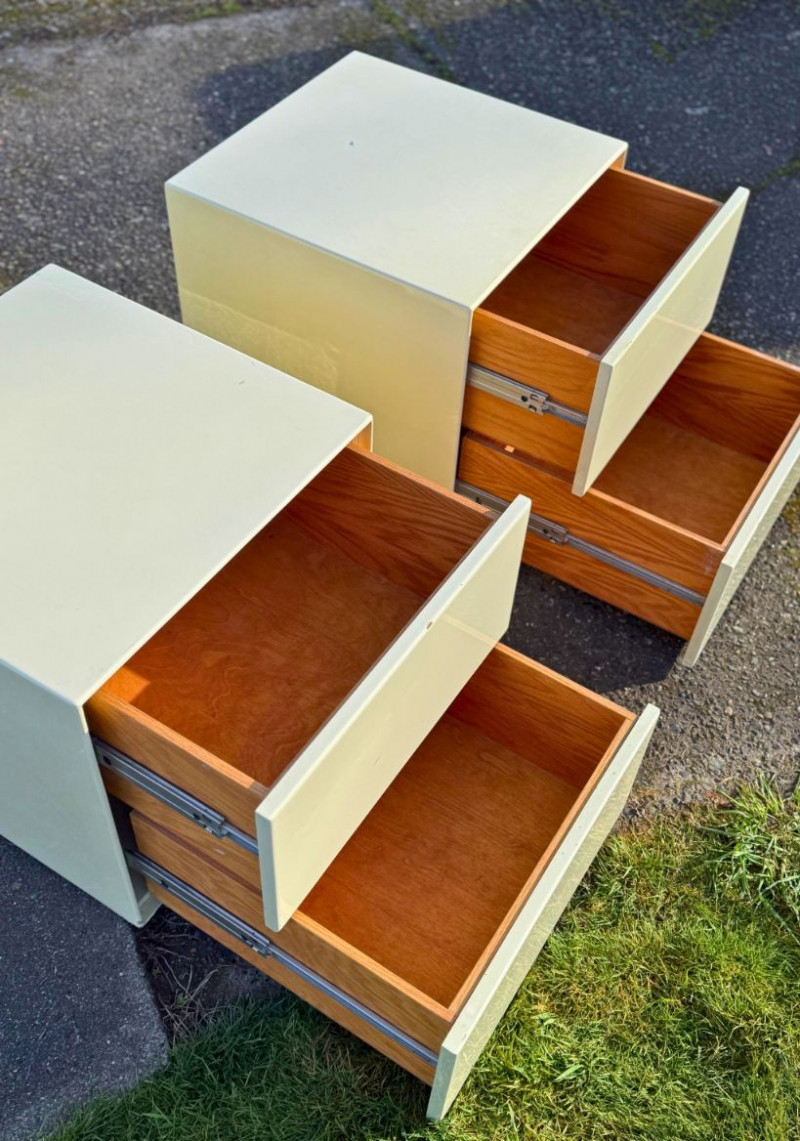 Vintage Light Yellow Lacquer Nightstands — Pair | Japanese Birch Veneer | Mid-Century Modern This striking pair of vintage nightstands features a soft light-yellow lacquered exterior paired with warm birch-veneered interiors. The clean, boxy silhouette and minimalist drawer fronts reflect classic mid-century modern design, while the subtle pastel tone gives them a fresh yet timeless presence. Each nightstand includes two spacious drawers with smooth metal glides and distinctive vintage push-latch hardware mounted inside, a detail commonly seen in mid-century Japanese furniture. An original interior label indicates birch veneered plywood manufactured in Hokkaido, Japan, offering a strong clue to their postwar Japanese production and quality craftsmanship. These pieces work beautifully as nightstands, end tables, or accent storage in a bedroom, living room, or studio space, blending seamlessly with both modern and vintage interiors. Measurements Materials Condition Origin / Maker