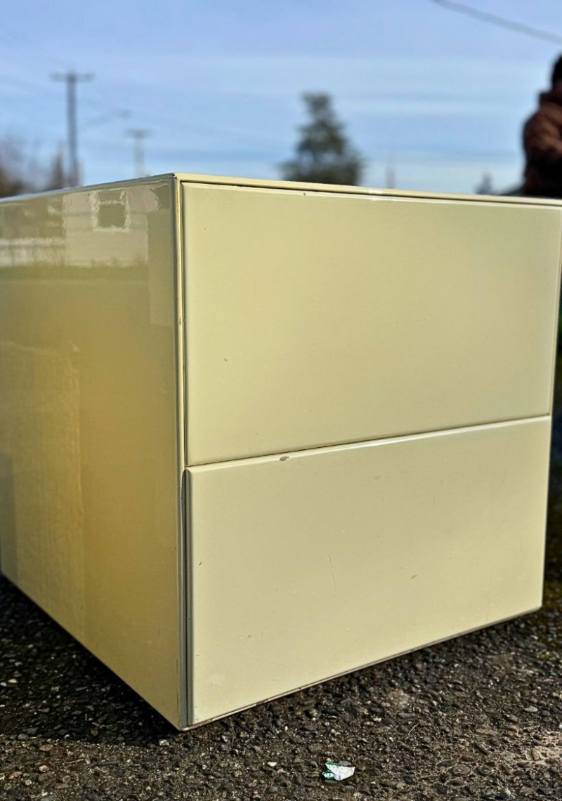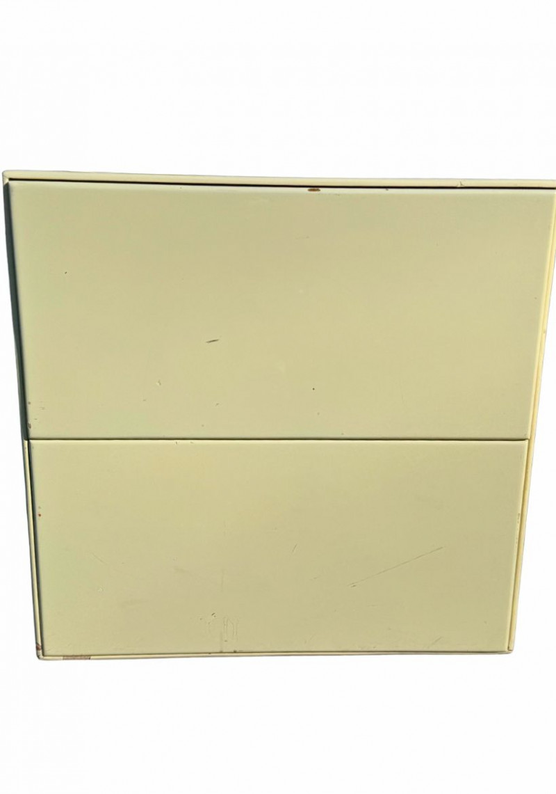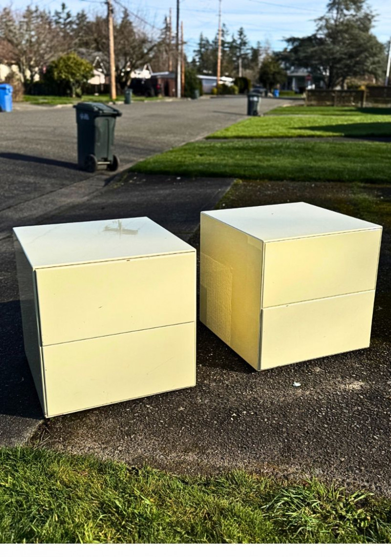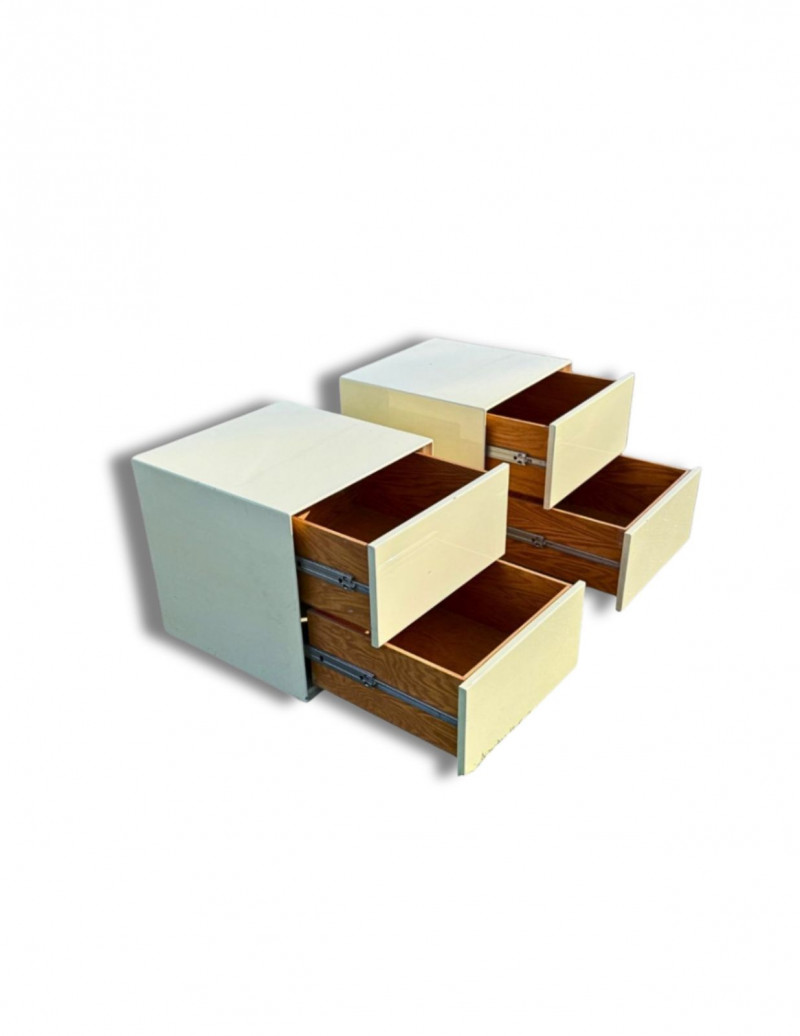 Vintage Light Yellow Lacquer Nightstands — Pair | Japanese Birch Veneer | Mid-Century Modern This striking pair of vintage nightstands features a soft light-yellow lacquered exterior paired with warm birch-veneered interiors. The clean, boxy silhouette and minimalist drawer fronts reflect classic mid-century modern design, while the subtle pastel tone gives them a fresh yet timeless presence. Each nightstand includes two spacious drawers with smooth metal glides and distinctive vintage push-latch hardware mounted inside, a detail commonly seen in mid-century Japanese furniture. An original interior label indicates birch veneered plywood manufactured in Hokkaido, Japan, offering a strong clue to their postwar Japanese production and quality craftsmanship. These pieces work beautifully as nightstands, end tables, or accent storage in a bedroom, living room, or studio space, blending seamlessly with both modern and vintage interiors. Measurements Materials Condition Origin / Maker