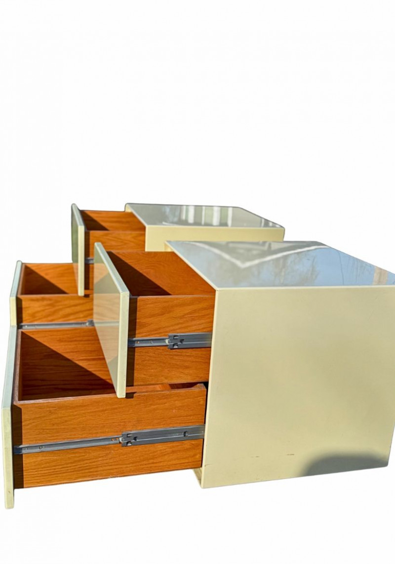 Good vintage condition with age-appropriate wear. There are light superficial scratches, small scuffs, and minor edge wear to the lacquered surfaces, consistent with normal use over time. No structural issues. Drawers open and close smoothly. Please review photos closely for condition details.
