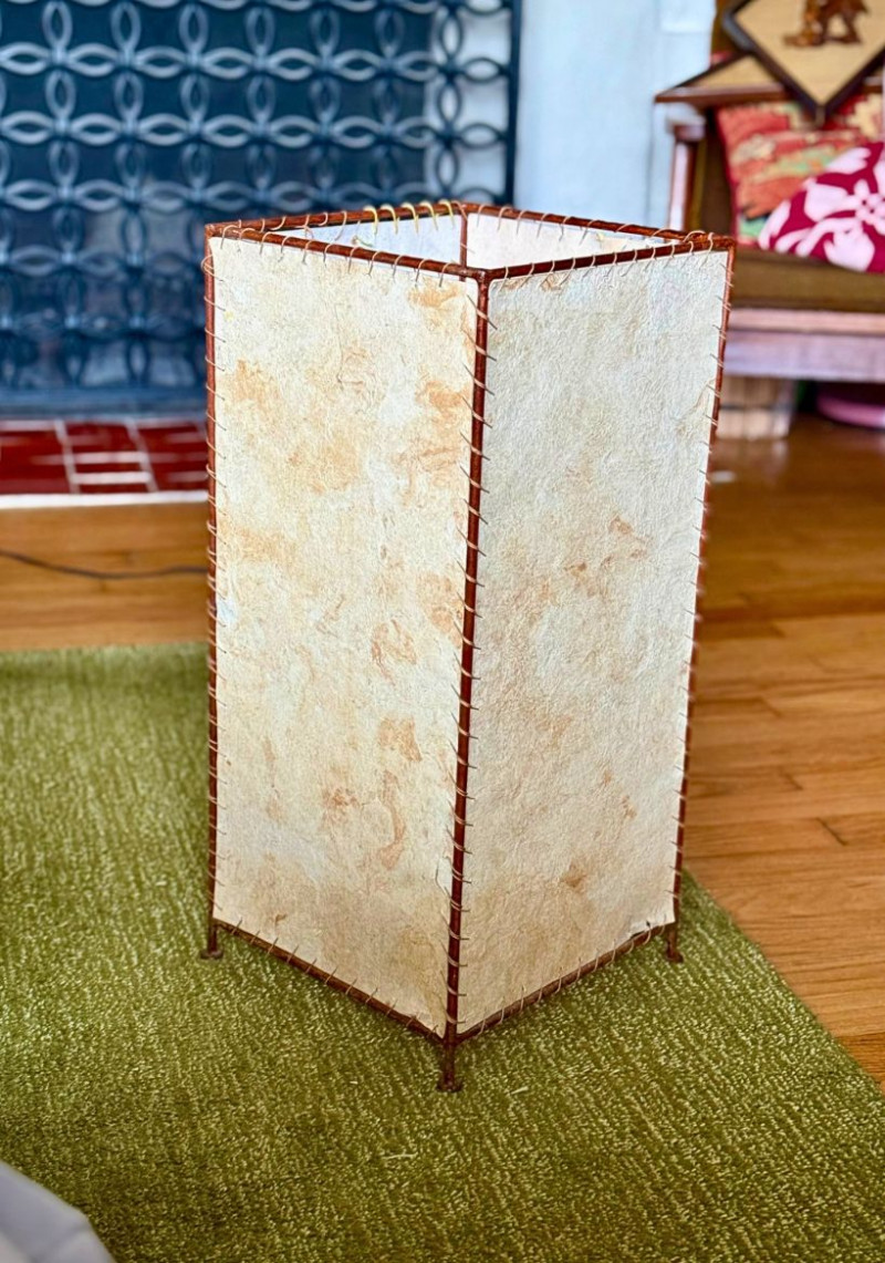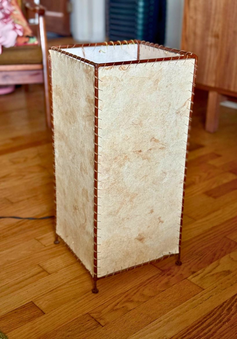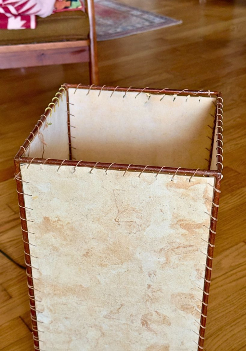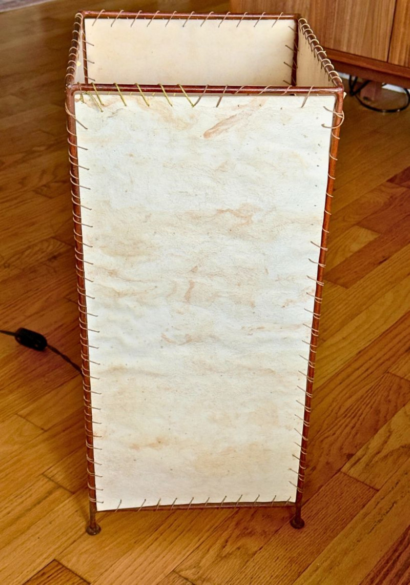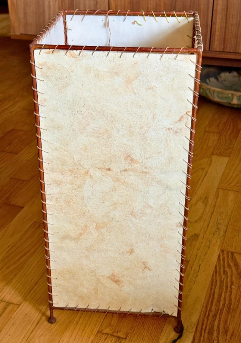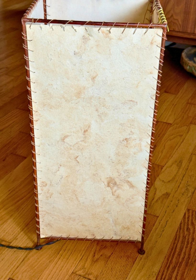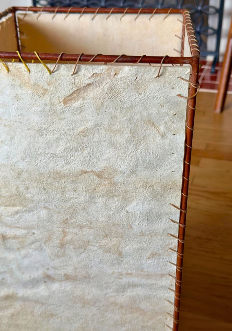 Vintage Hand-Stitched Parchment Panel Floor Lamp / Lighted Sculptural Shade This striking vintage floor lamp features a tall rectangular form constructed from a slender metal frame wrapped in hand-stitched parchment-style panels. The warm, organic material diffuses light beautifully, creating a soft ambient glow that feels both sculptural and architectural. The exposed stitching and patinated frame give the piece a distinctly handmade, studio-crafted character commonly associated with mid-century and post-war modern interiors. The lamp stands on four small metal feet and functions as both lighting and art, making it an ideal statement piece for a living room, reading nook, or bedroom. When illuminated, the parchment panels glow warmly, highlighting the natural variations in the material and emphasizing its artisanal construction. Measurements (Please note measurements are approximate.) Materials Condition All condition details are visible in the provided photographs and contribute to the piece’s vintage character. Style / Period Notes