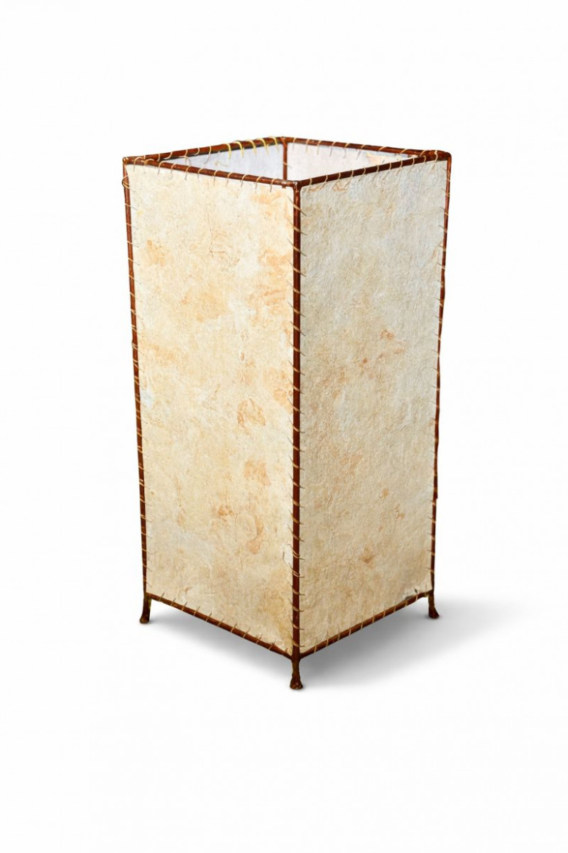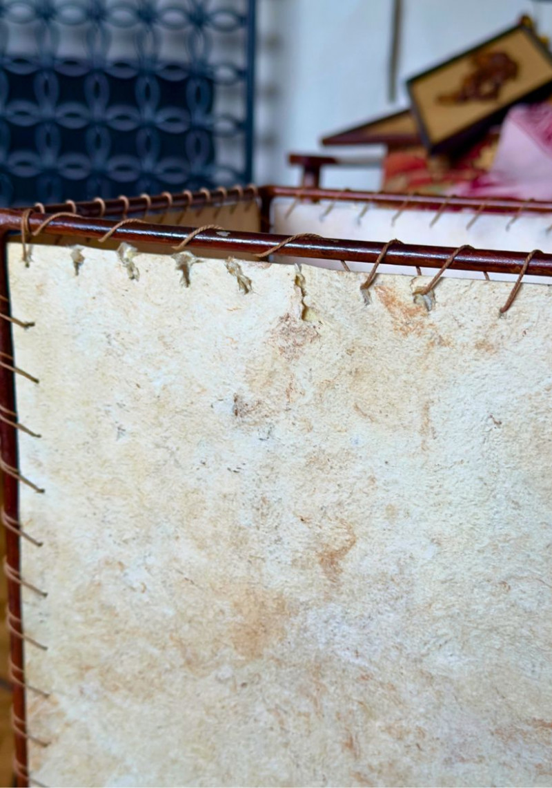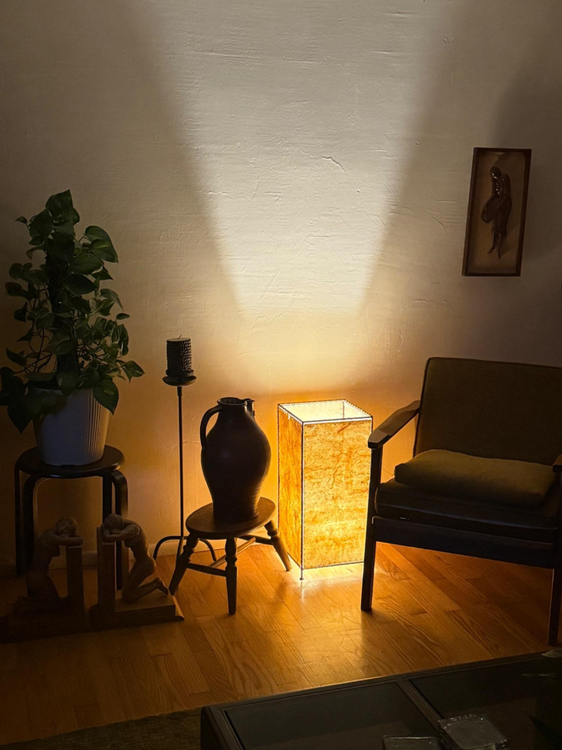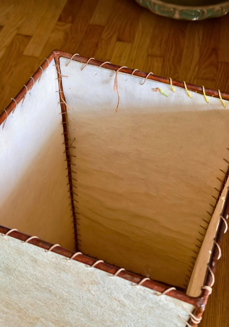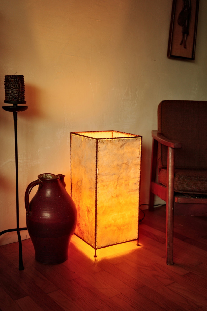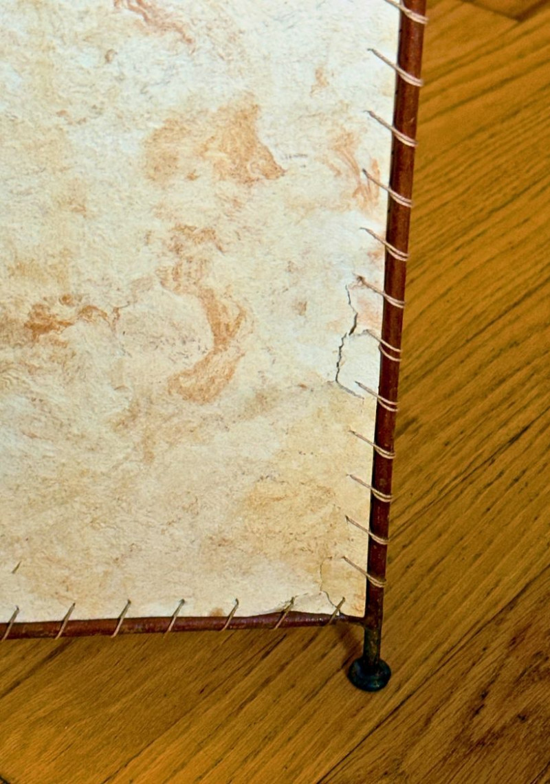 Vintage Hand-Stitched Parchment Panel Floor Lamp / Lighted Sculptural Shade This striking vintage floor lamp features a tall rectangular form constructed from a slender metal frame wrapped in hand-stitched parchment-style panels. The warm, organic material diffuses light beautifully, creating a soft ambient glow that feels both sculptural and architectural. The exposed stitching and patinated frame give the piece a distinctly handmade, studio-crafted character commonly associated with mid-century and post-war modern interiors. The lamp stands on four small metal feet and functions as both lighting and art, making it an ideal statement piece for a living room, reading nook, or bedroom. When illuminated, the parchment panels glow warmly, highlighting the natural variations in the material and emphasizing its artisanal construction. Measurements (Please note measurements are approximate.) Materials Condition All condition details are visible in the provided photographs and contribute to the piece’s vintage character. Style / Period Notes