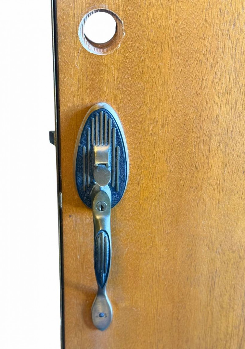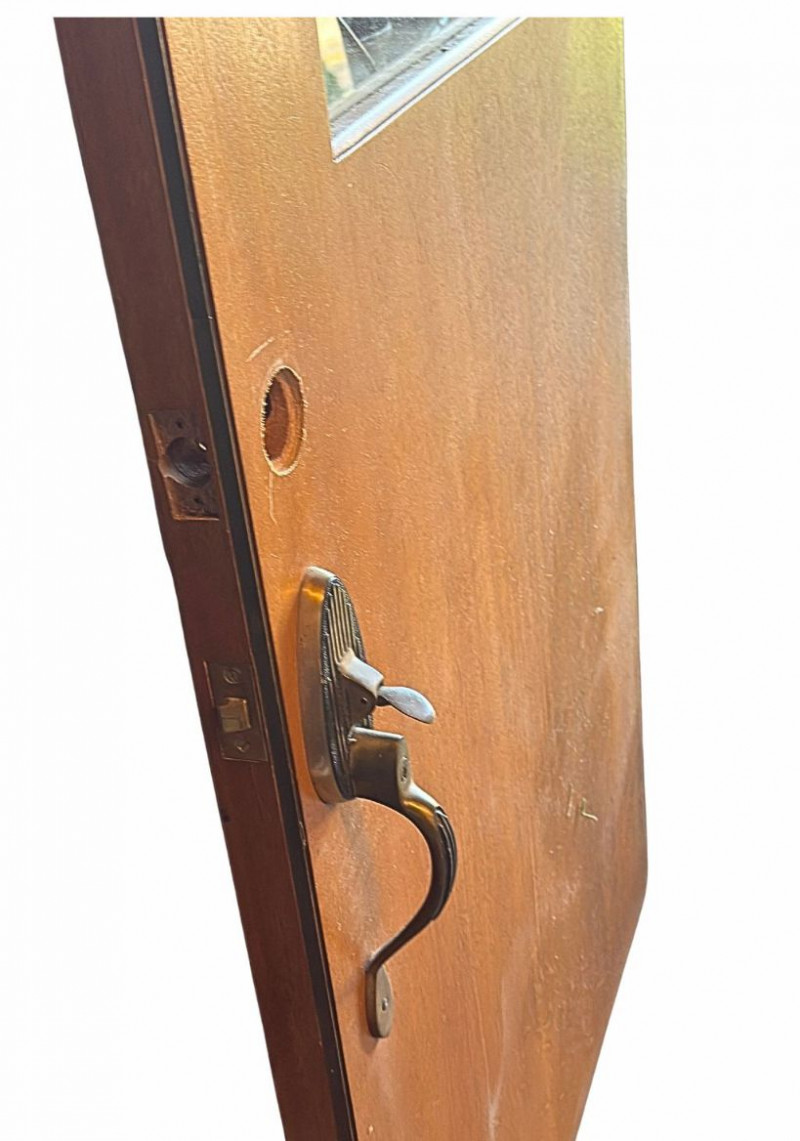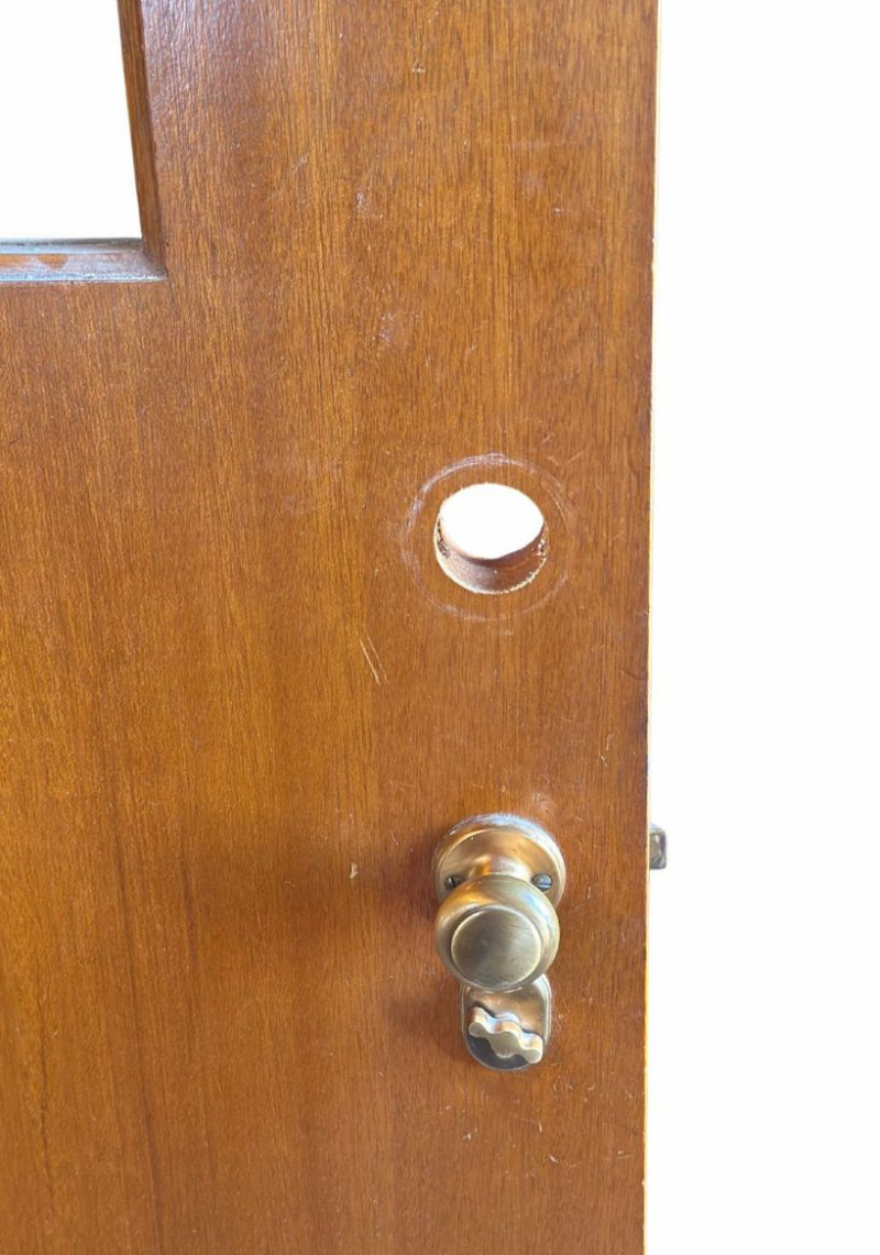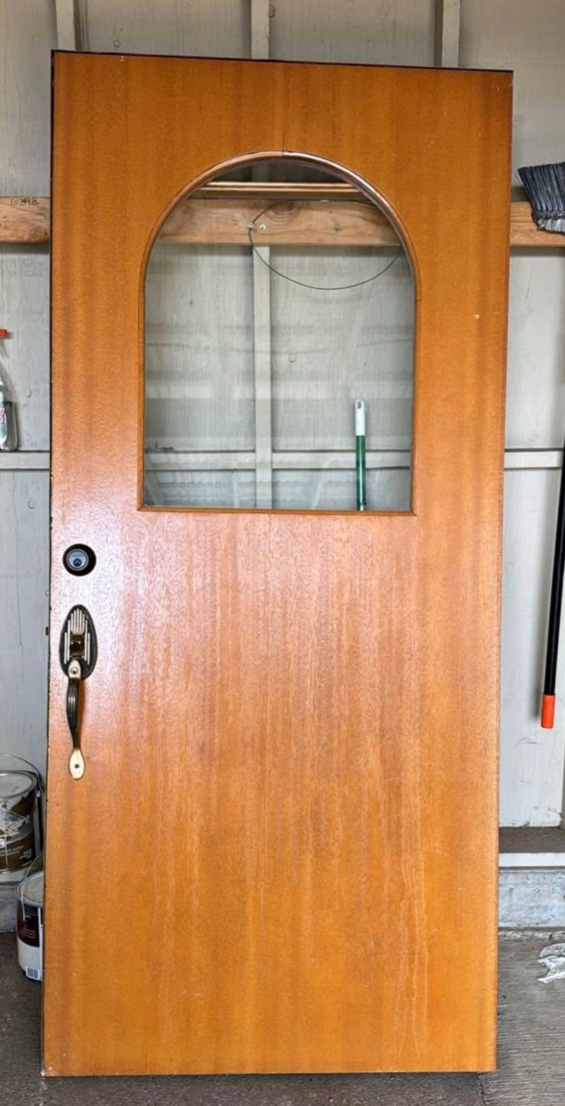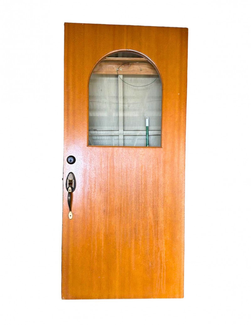 This vintage interior door features a warm wood finish accented by a distinctive arched glass window, adding architectural interest and period charm. The clean rectangular form paired with the softened arch detail reflects classic mid-century interior design, making it a standout statement piece. Ideal for use as an interior door, office or studio entry, pantry door, or repurposed as a sliding or decorative architectural element. The glass panel allows light to pass through while maintaining separation between spaces, offering both function and visual appeal. Dimensions: Condition:Vintage Interior Solid Wood Door with Arched Glass Panel — 36" W x 79" H