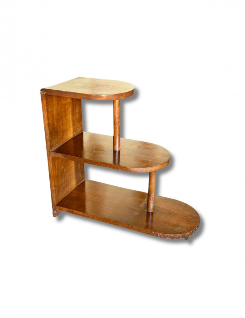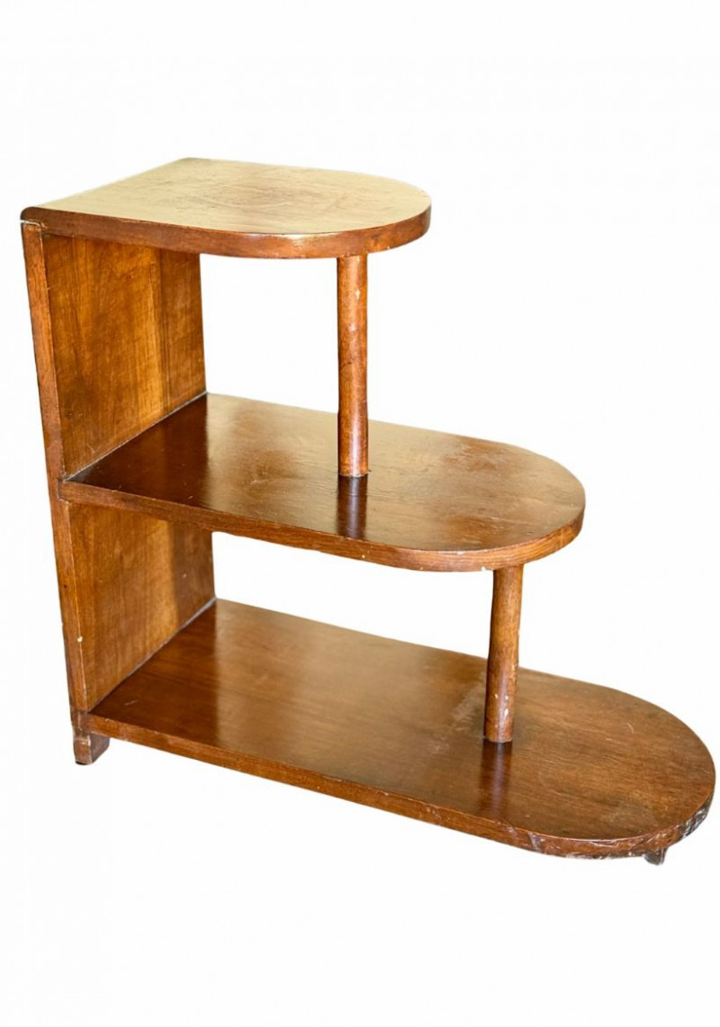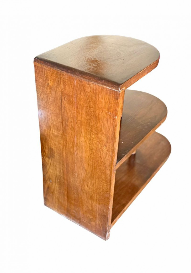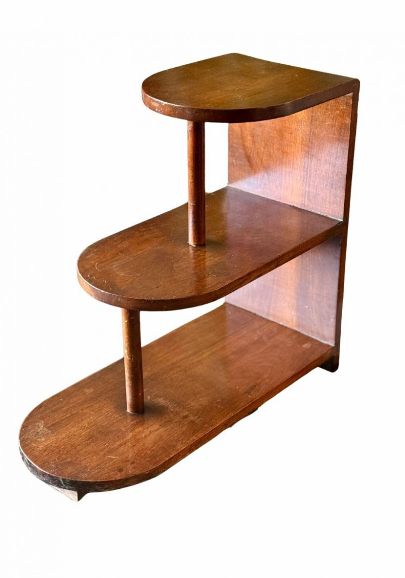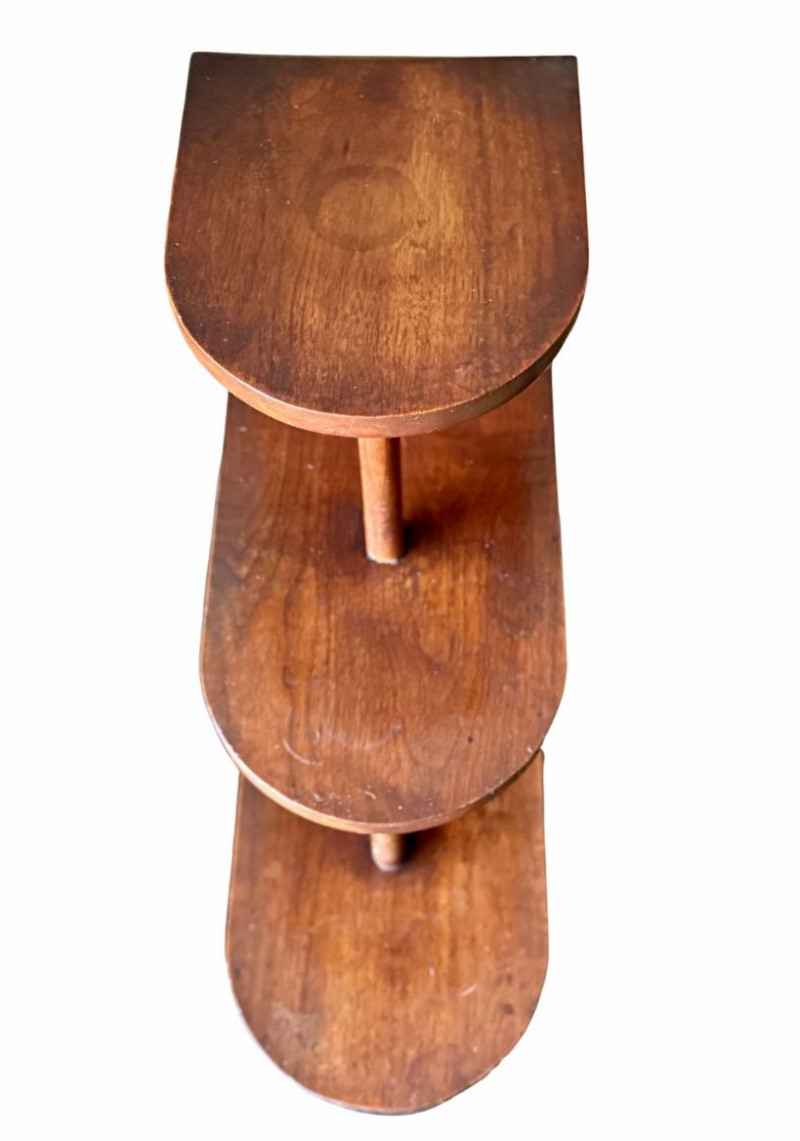 Vintage Art Deco Walnut Three-Tier Side Table Likely 1930's This vintage Art Deco three-tier side table showcases classic stepped geometry and streamlined form characteristic of early 20th-century design. Crafted in warm walnut with rounded edges and offset tiers, the piece balances functionality with sculptural presence, making it an ideal accent table, lamp stand, or display surface. The asymmetrical, tiered layout reflects the Art Deco movement’s emphasis on modernity and architectural form. Its compact footprint and vertical design allow for versatile placement in living rooms, bedrooms, entryways, or reading nooks, while the rich wood tone adds warmth and timeless appeal. Dimensions Condition Historical Note Estimated Value