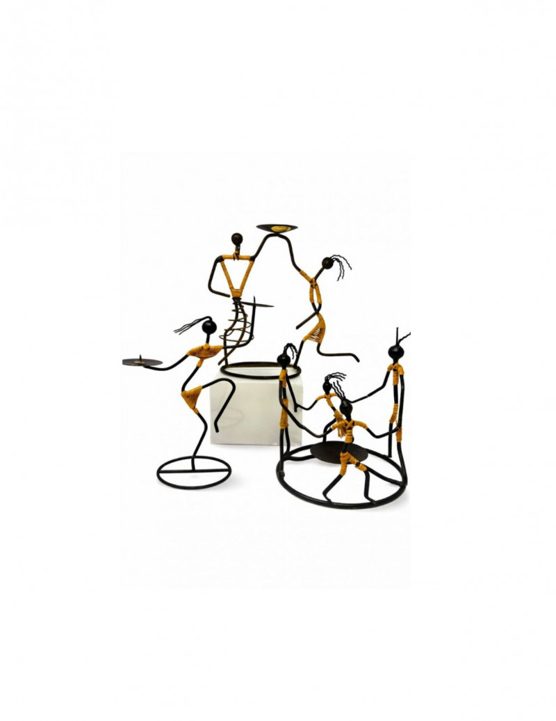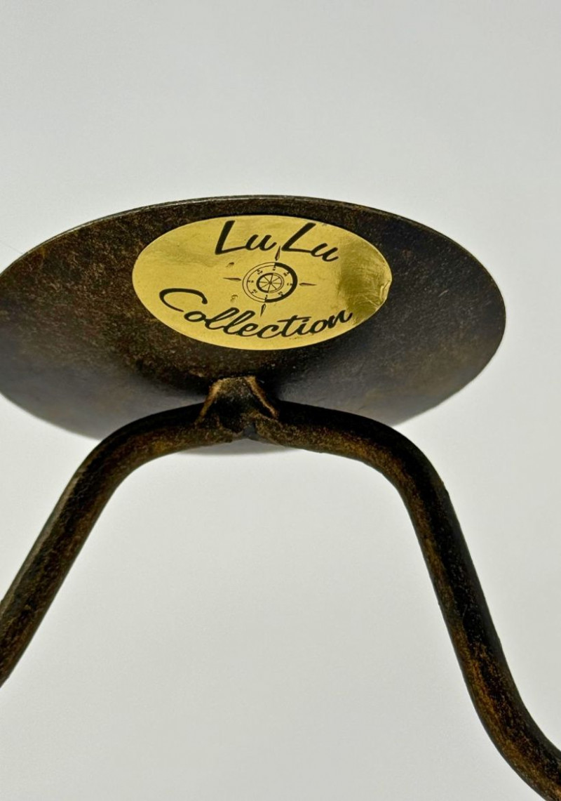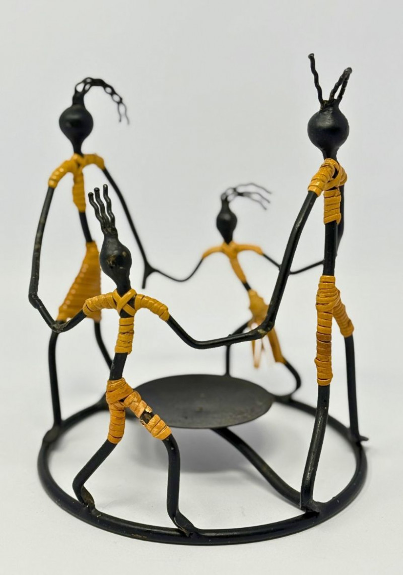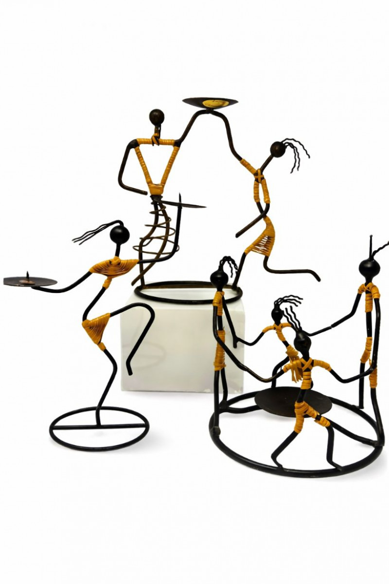 Vintage Mid-Century Danish Iron & Cane String Figurative Candleholder Lot – Lulu Collection, 1960s This sculptural mid-century Danish candleholder lot features a group of expressive iron figures wrapped in woven cane “string” detailing, characteristic of Scandinavian modern design from the 1960s. The figures are rendered in dynamic, playful poses, each incorporating candle cups into the composition, blurring the line between functional object and sculptural art. The set includes multiple individual figurative candleholders and one multi-figure circular arrangement, all sharing the same blackened iron framework, organic wire forms, and warm cane wrapping. One piece retains its original “Lulu Collection” label, confirming period production and collectible design provenance. These pieces make a striking display when grouped together and are equally strong styled individually. Dimensions Condition Historical Note
