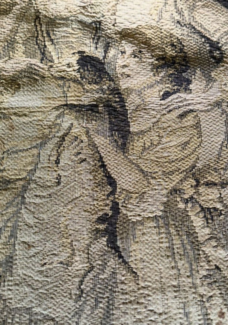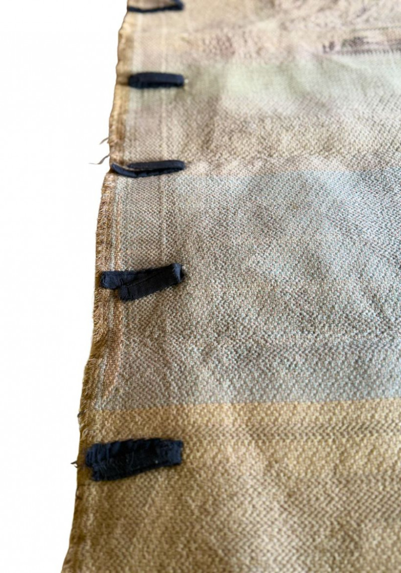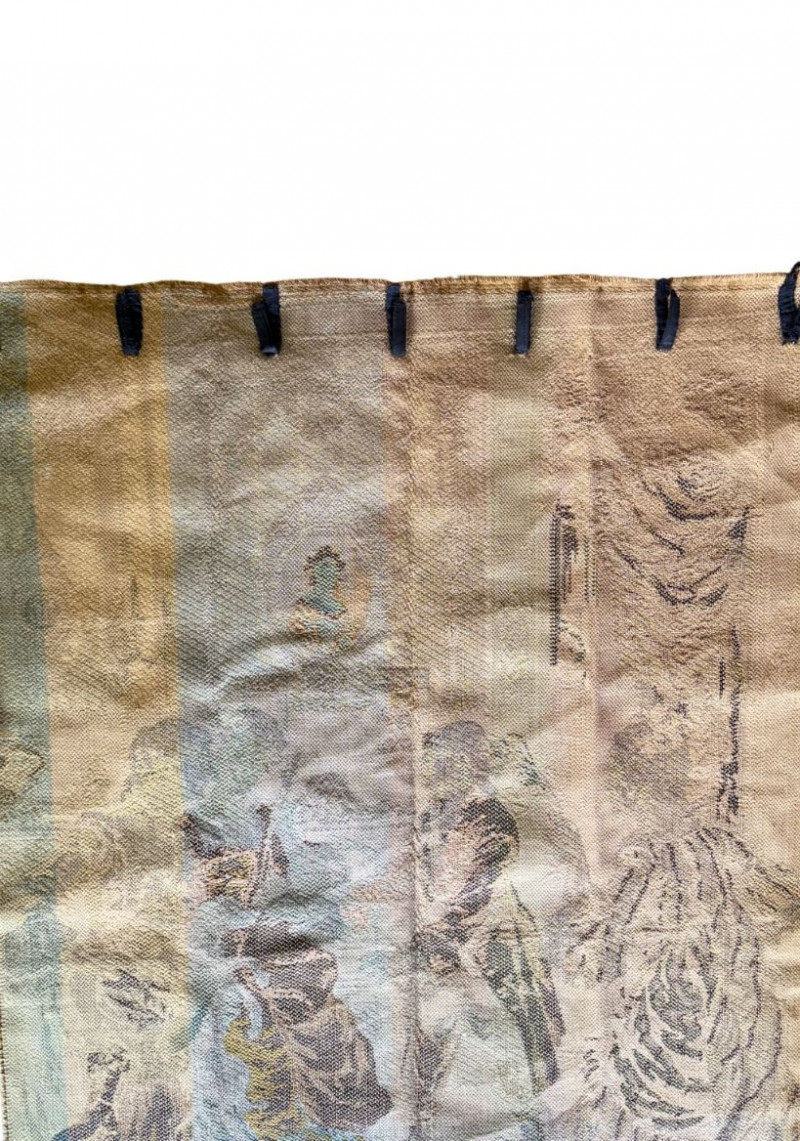 Good vintage condition with age-appropriate wear. Visible discoloration, light fading, and spotting consistent with age and storage. Minor fraying along edges and corners. Hanging tabs present along the top with a few needing to be reattached. Presents beautifully with rich texture and detailed woven imagery.