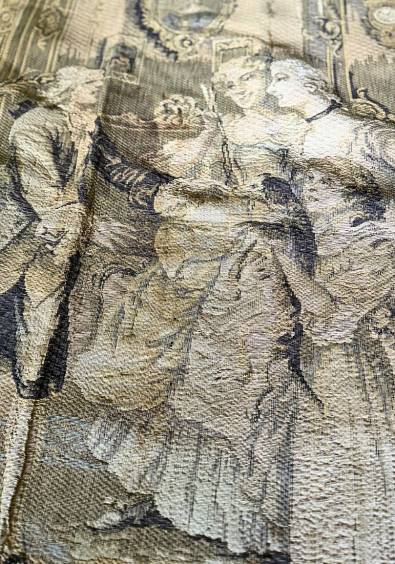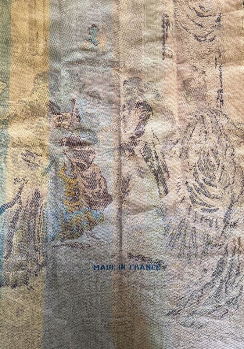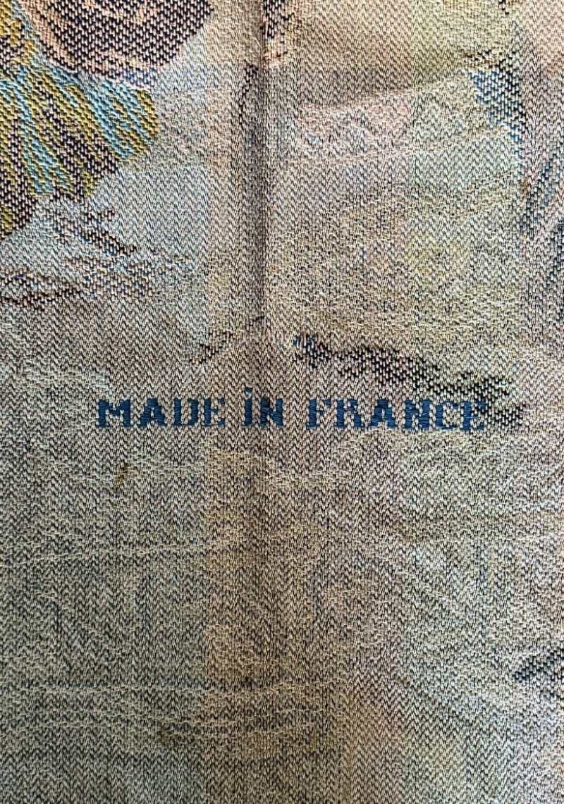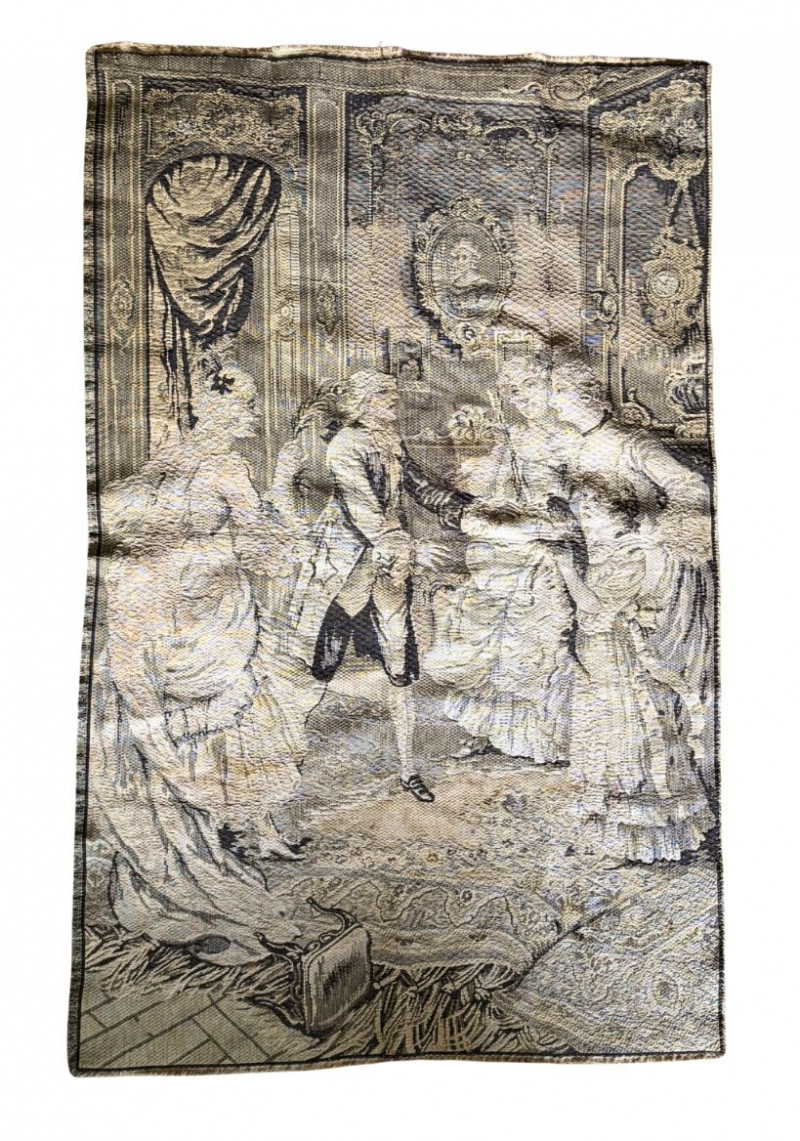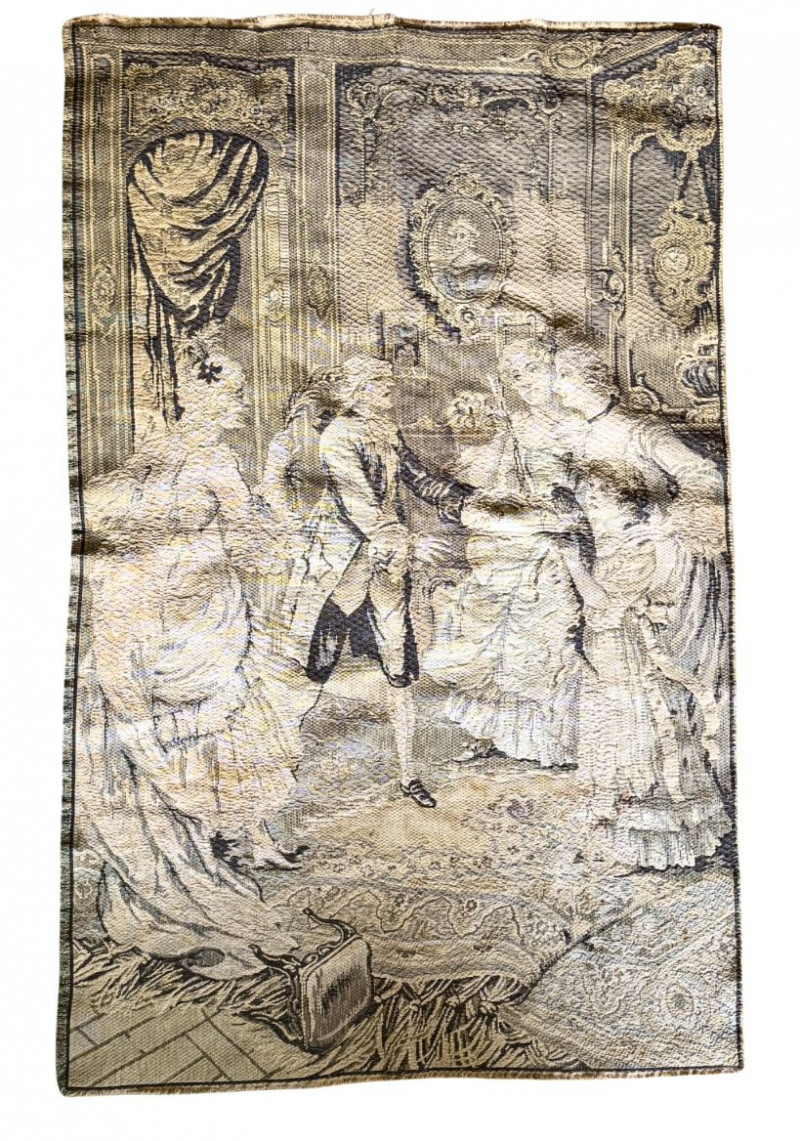 Vintage French Figural Tapestry Wall Hanging — Made in France Rococo Court Scene Textile Elegant vintage French woven tapestry wall hanging featuring a romantic Rococo-style courtship scene rendered in a soft neutral palette. This textile depicts finely dressed aristocratic figures in an ornate interior complete with period furnishings, drapery, and decorative detailing reminiscent of 18th-century European salon art. The woven construction offers beautiful depth, texture, and tonal variation, giving the piece a timeless old-world aesthetic ideal for traditional, French country, Parisian, or eclectic interiors. Back marked “Made in France,” confirming European production and craftsmanship. Can be displayed as a wall hanging, layered textile décor, or repurposed for upholstery or creative design use. Measurements: Condition: Historical Note: