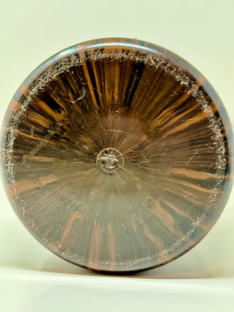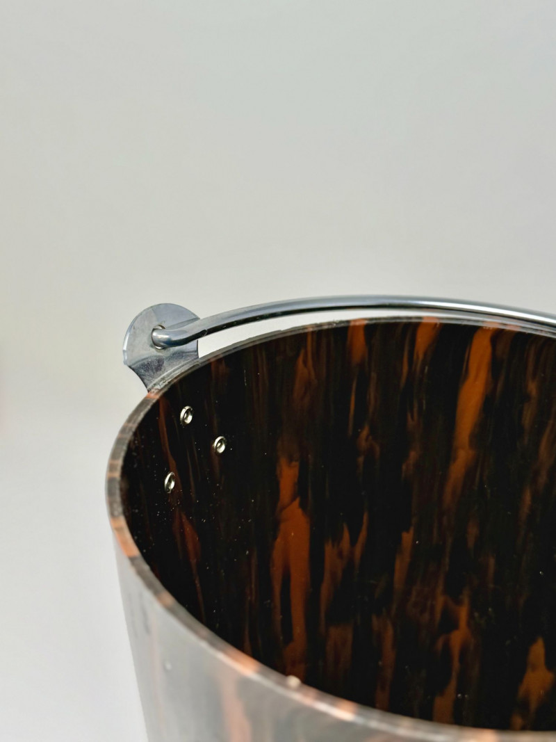 Vintage Brown Marbled Bakelite Ice Bucket with Chrome Handle, Art Deco Mid Century Barware, 1940s Cocktail Ice Pail Vintage marbled brown Bakelite ice bucket dating to the mid-20th century, featuring a rich tortoiseshell-style swirl pattern and a classic chrome swing handle with riveted mounts. This piece exemplifies Art Deco to early Mid-Century barware design, prized for its sculptural form, warm coloration, and iconic Bakelite material. The cylindrical body tapers subtly toward the base, creating an elegant silhouette well suited for cocktail service, bar carts, or display. The Bakelite exterior displays deep chocolate and amber marbling, while the interior remains smooth and clean, suitable for ice or liner use. The metal handle adds contrast and function, allowing for easy carrying and enhancing the overall period aesthetic. Pieces like this were commonly produced in the 1930s–1940s and are now sought after for both functional use and decorative appeal. This example works beautifully as an ice bucket, bar accessory, wine or bottle cooler, or statement object in a Mid-Century, Art Deco, or vintage bar setting. Dimensions: Approximately 10.5" H x 8.5" W x 8.5" D Condition: Good vintage condition with light surface wear and small scuffs/scratches consistent with age and use. Marbling remains vibrant and glossy. Metal handle shows minor oxidation and patina, adding character. No cracks or structural damage observed. Please review photos for full condition details. Notes: Bakelite barware has become increasingly collectible due to its durability, unique coloration, and association with early modern design. Marbled examples with intact handles are especially desirable and display well in both traditional and contemporary interiors.