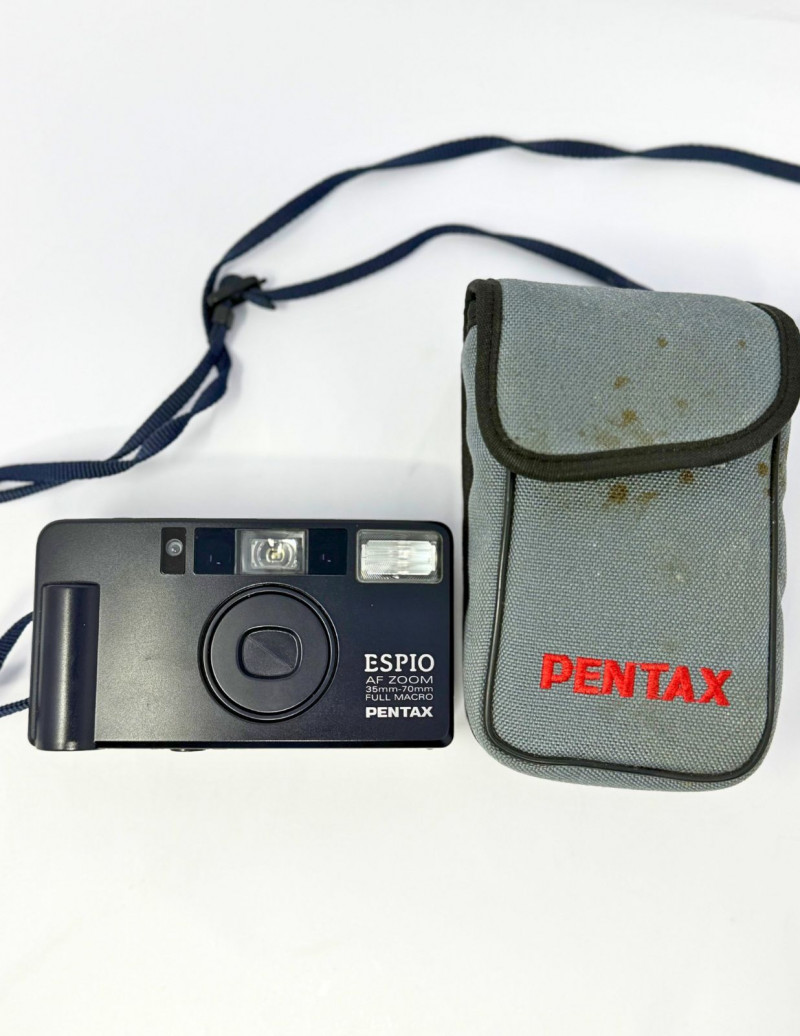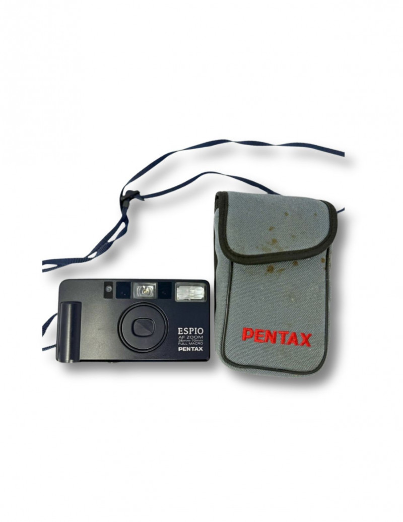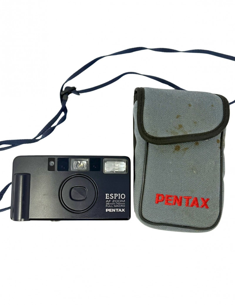 Compact vintage Pentax Espio AF Zoom 35mm film camera featuring automatic focus, built-in flash, and 35mm–70mm zoom lens with macro capability. A sleek and reliable point-and-shoot from Pentax, perfect for film photography enthusiasts, collectors, or anyone looking to capture authentic 35mm images. Includes original Pentax carrying case with shoulder strap.