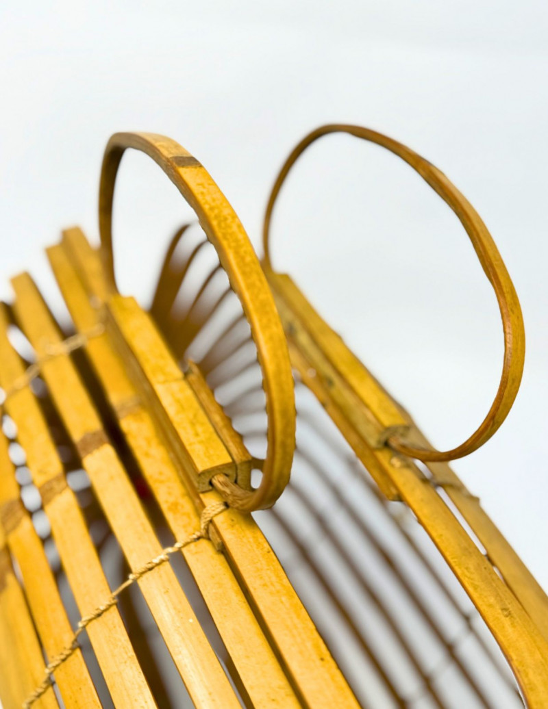 Japanese bamboo lobster cage baskets were traditionally used by fishermen and later adapted into decorative and fashion pieces during the early to mid-20th century. By the 1940s–1960s, these sculptural baskets became popular export items and are now sought after for their craftsmanship, organic form, and crossover appeal as décor or handbag.