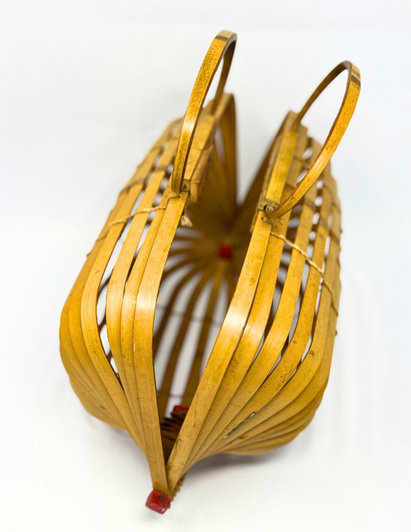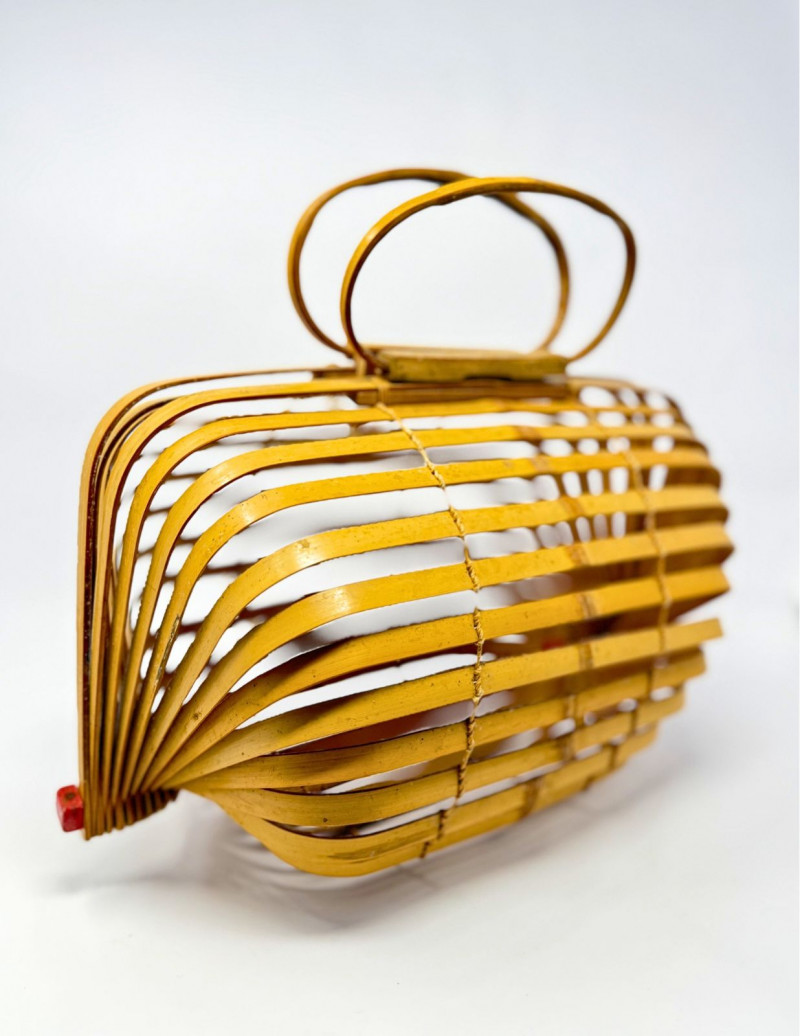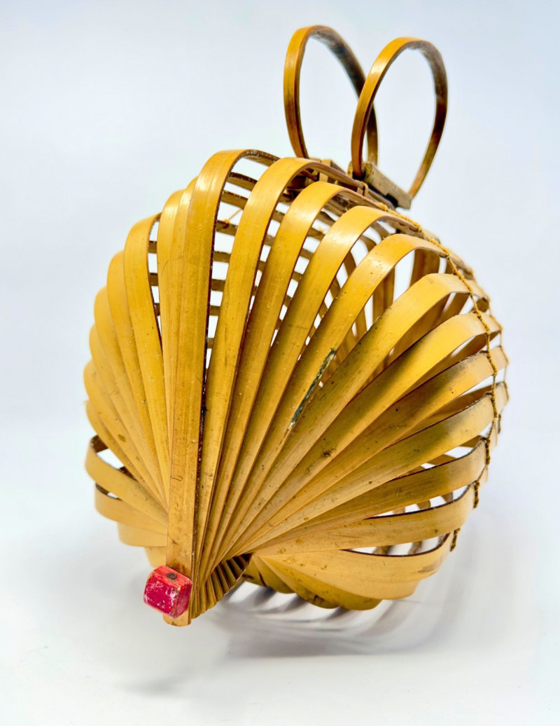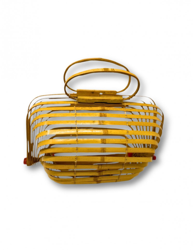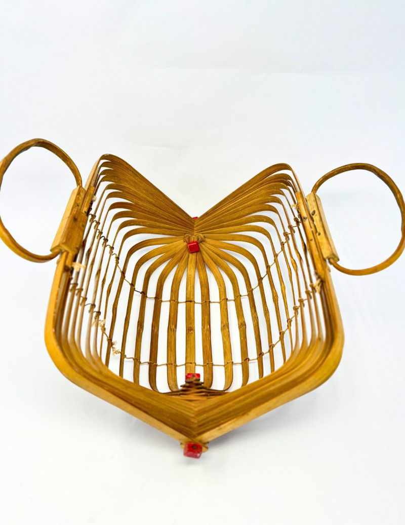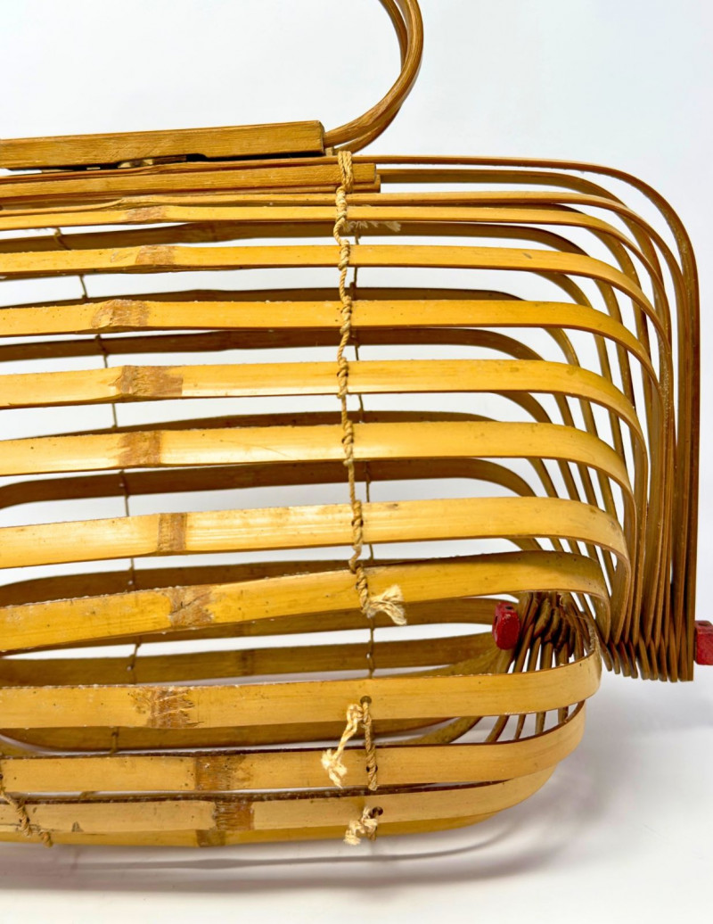 1940s Japanese Bamboo Lobster Cage Basket/Purse Offered is a rare 1940s-1950s Japanese "Lobster Cage" basket purse. While there is genius engineering in the artisan crafted construction, this piece is beautiful when opened and used, or when closed and stored. It features bent wood bamboo slats that are roped together like a fan, and can be spread and opened, or folded backwards and stored flat. It's inspired by the functional lobster traps in use at the time, basket style in a curved barrel shape, the slats are anchored along dowels on each side capped with squared ends painted red, and topped with double handles and clever interlocking closure. Measurements: Condition: Historical Note: Value: