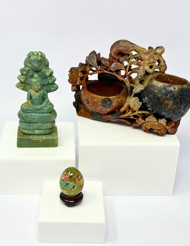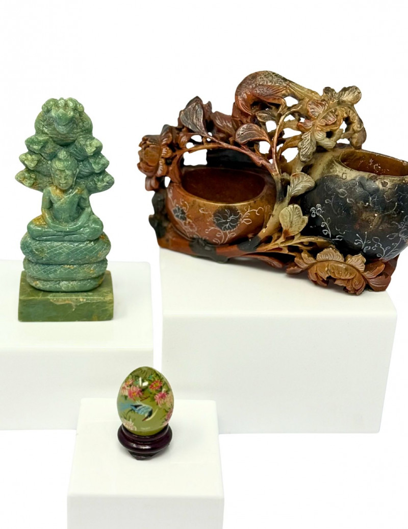 Asian Carved Hardstone Décor Lot — Possible Jade Buddha, Soapstone Brush Pot & Hand-Painted Oriental Egg