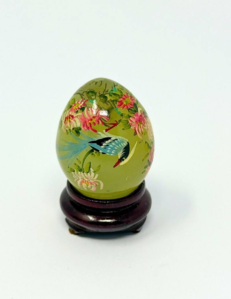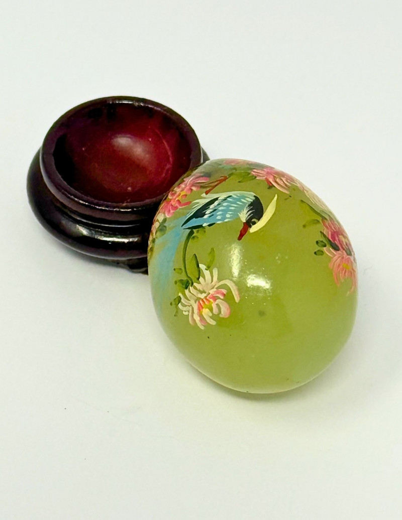 A beautifully curated trio of Asian decorative pieces featuring a carved green hardstone Buddha figure (possibly jade or serpentine), an intricately carved soapstone double brush pot with figural and floral detailing, and a delicate hand-painted Oriental decorative egg on stand. Each piece showcases traditional craftsmanship and makes a striking grouping for collectors of Asian décor, meditation spaces, or layered vintage interiors.