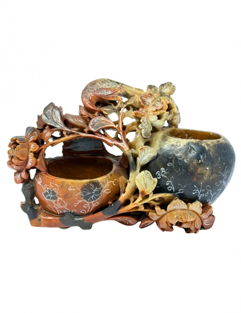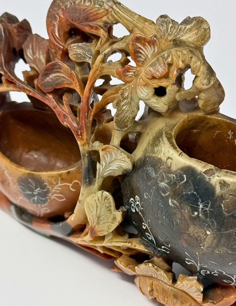 Carved hardstone and soapstone decorative objects have long been produced across China and Southeast Asia for export and domestic use, often featuring symbolic imagery such as Buddha figures, florals, and nature scenes representing peace, longevity, and prosperity. Pieces like these became popular mid-20th century among Western collectors and remain sought after for their craftsmanship and decorative presence.