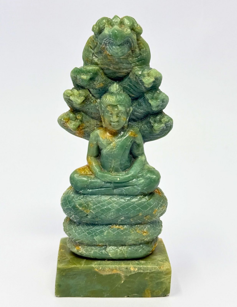 Overall good vintage condition with natural stone variations, surface wear consistent with age, and minor scuffs. Stone Buddha shows natural inclusions and color variation typical of carved hardstone and may be jade or serpentine. Brush pot displays expected age wear and minor surface markings. Egg and stand in good display condition.