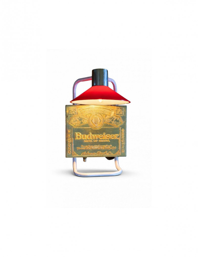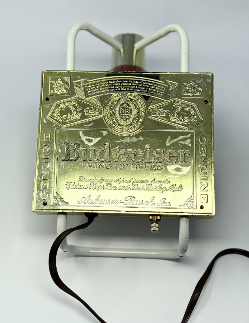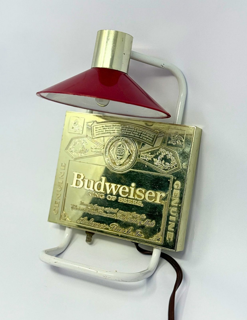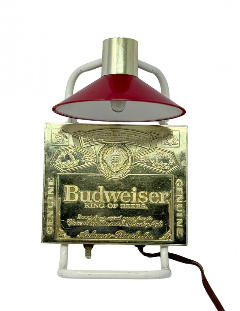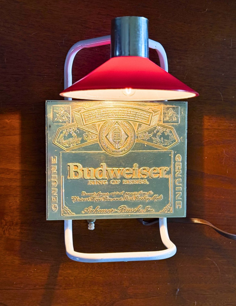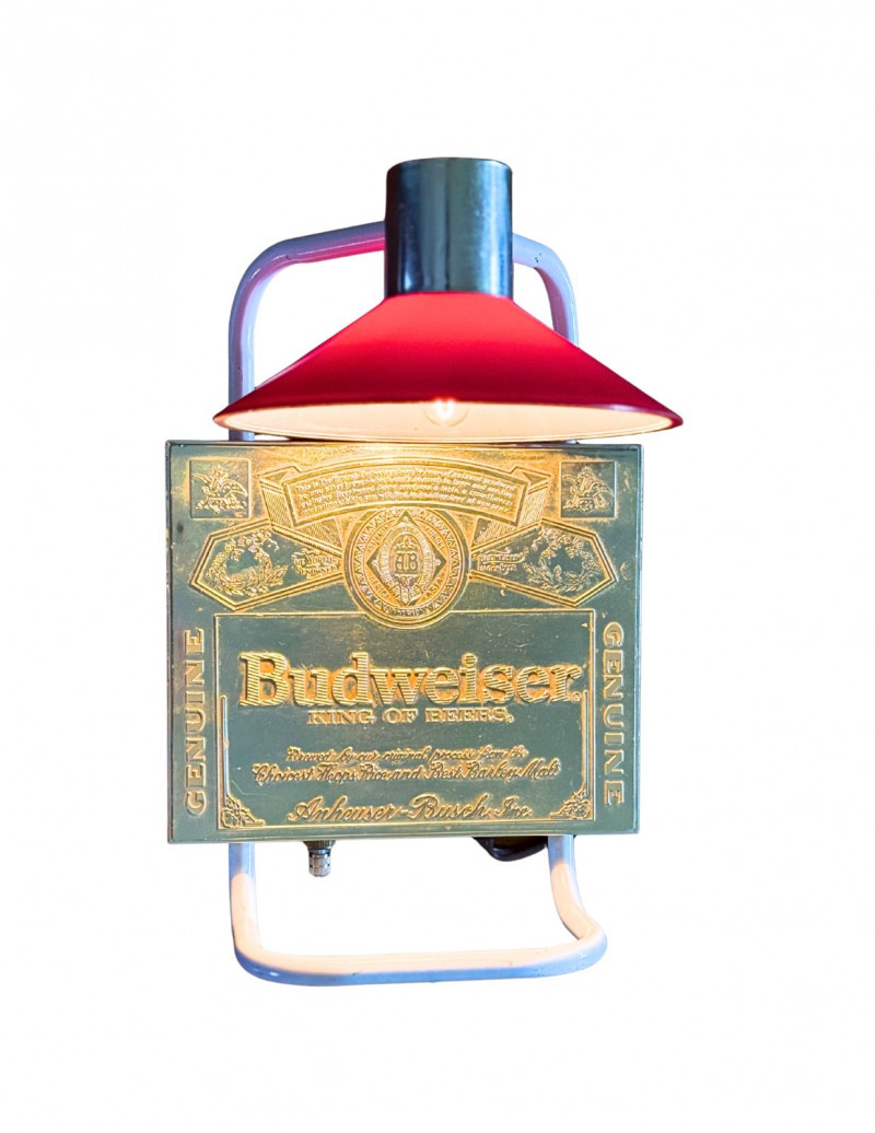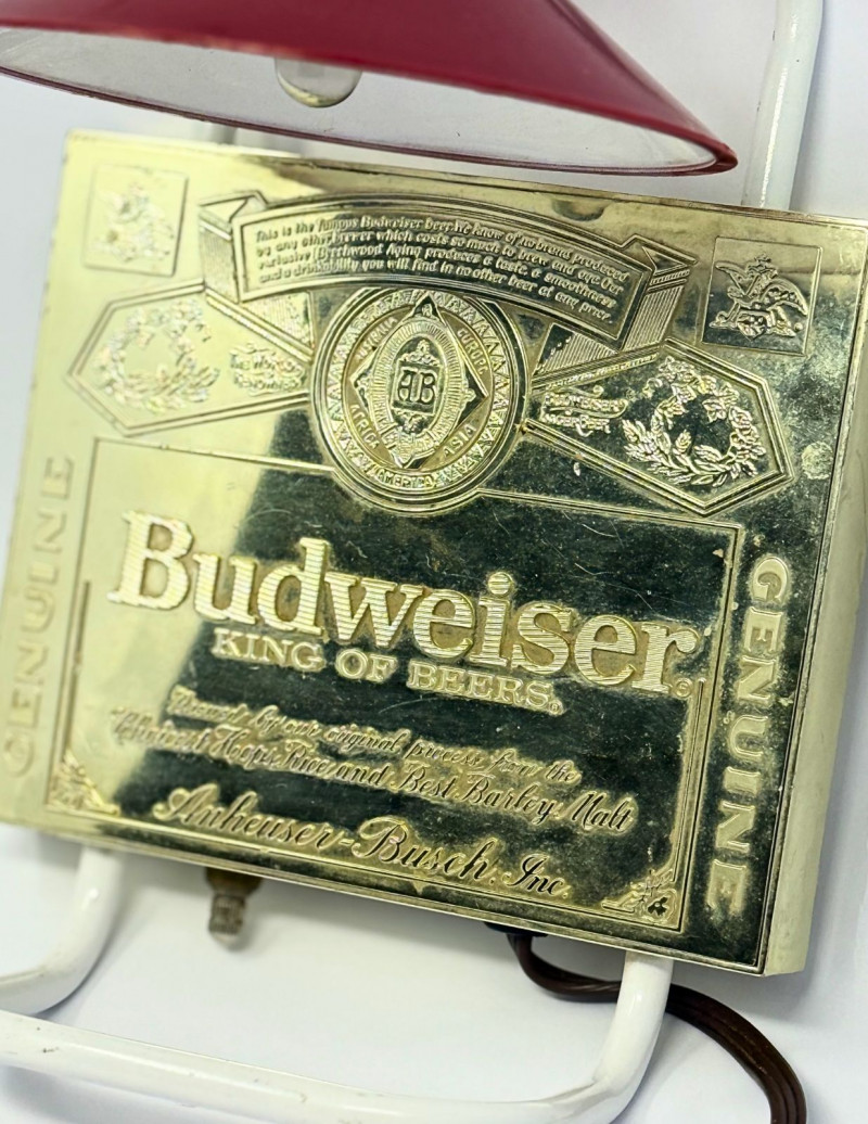 Vintage Budweiser Light-Up Bar Wall Sconce Beer Advertising Lamp Classic Budweiser “King of Beers” light-up wall sconce featuring an embossed brass-tone advertising plaque with red metal shade and white metal frame. A striking vintage bar décor piece that illuminates beautifully when plugged in, showcasing the iconic Anheuser-Busch branding and historic Budweiser crest details. Perfect for home bar, man cave, garage, or breweriana collectors. Measurements: Condition: Historical Note: Value: