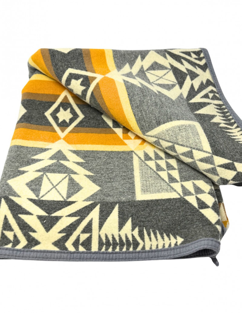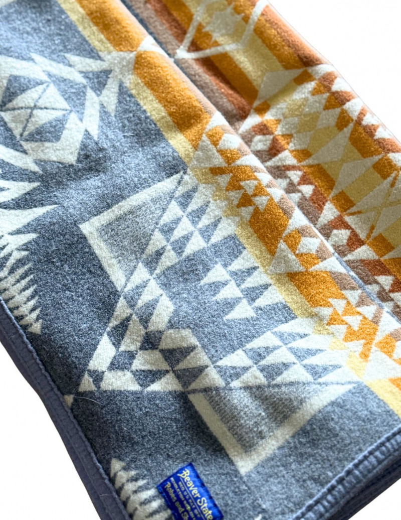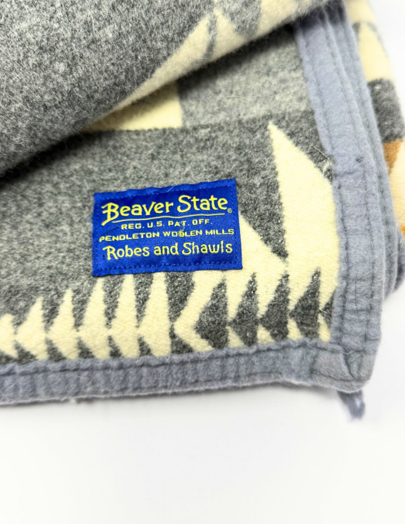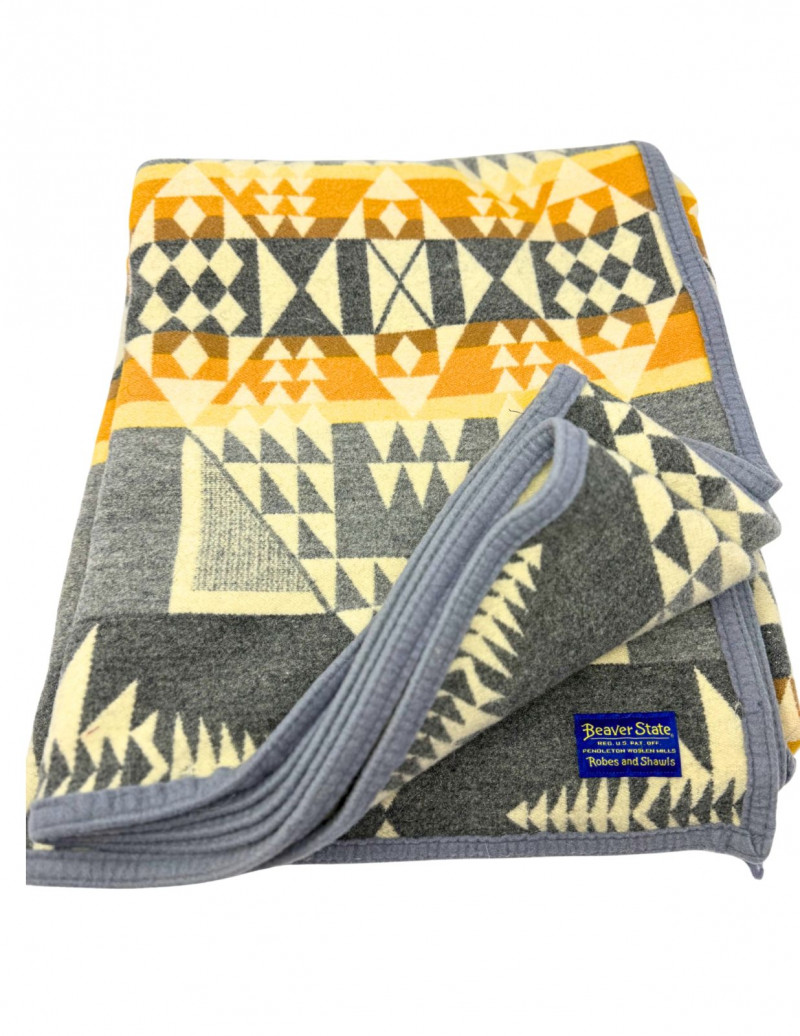 Vintage Pendleton Beaver State Jacquard Arrowhead Wool Blanket – Grey, Gold & Cream Classic vintage Pendleton “Beaver State” jacquard wool blanket featuring a bold geometric arrowhead pattern in grey, cream, and golden tones. Crafted by Pendleton Woolen Mills and made in the USA, this iconic reversible design honors traditional Native American-inspired motifs and remains a highly collectible and functional textile. A beautiful statement piece for cabin, lodge, or modern western décor. Measurements: Condition: Historical Note: