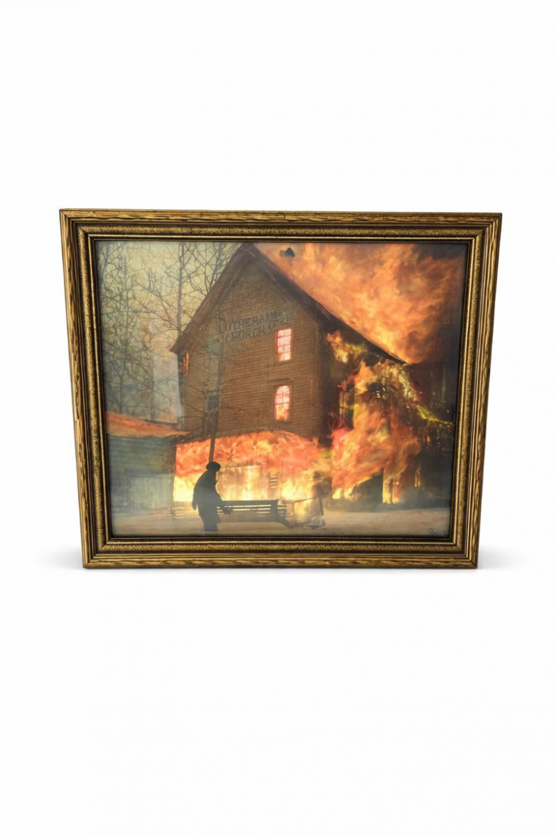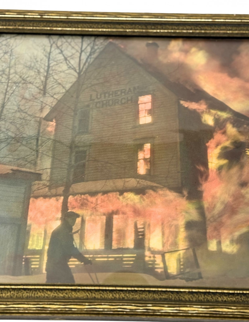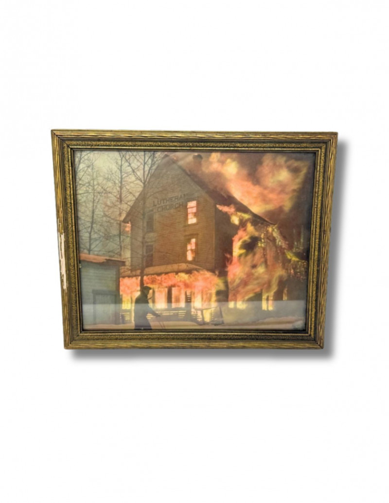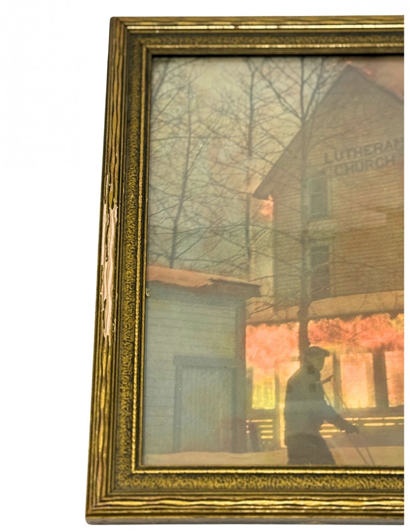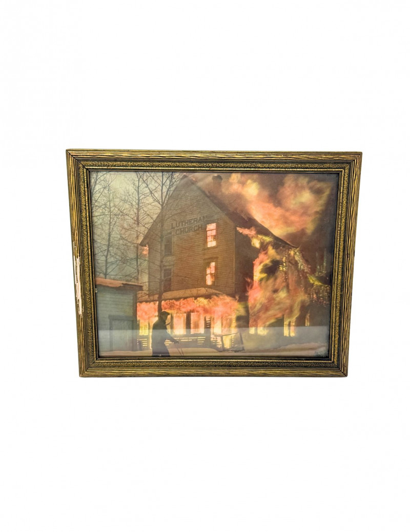 1937 Framed Photograph – Lutheran Church Fire, Douglas Island – February 23, 1937 Striking and historically compelling framed photograph depicting the Lutheran Church fire on Douglas Island, dated February 23, 1937. The dramatic image captures the church engulfed in flames, with a silhouetted figure in the foreground and the building clearly marked “Lutheran Church.” A powerful piece of Alaskan history preserved in a vintage gilt wood frame. Handwritten notations on the reverse include: “1937” “Fire at Douglas – February 23, 1937” “Douglas Island” Additional handwritten wording referencing the Lutheran Church fire (see photos) This is an original vintage photograph, not a modern reproduction, with period handwriting and mounting consistent with the late 1930s. Measurements: Condition: Historical Note: Value: