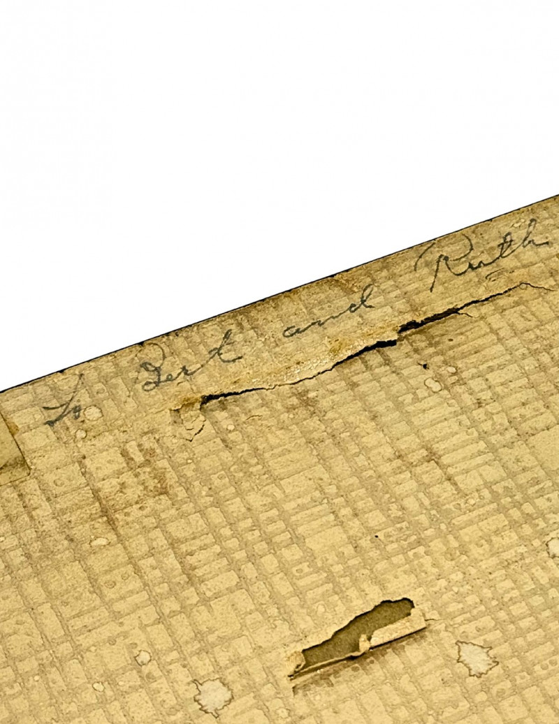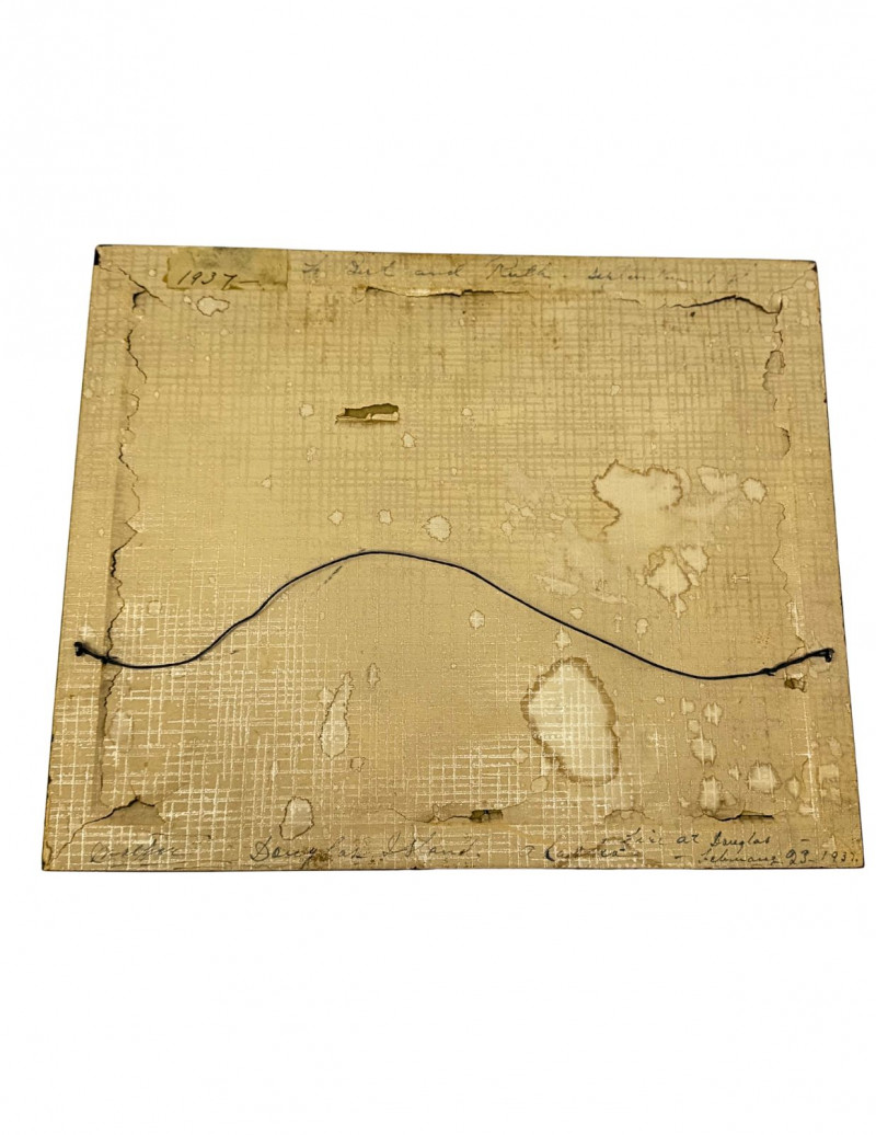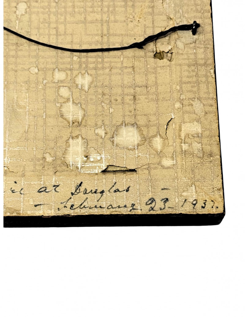 Good vintage condition considering age (1937). Frame shows surface wear, finish loss, and edge scuffing. Backing paper is heavily aged with staining, peeling, tears, and water marks consistent with age. Original wire hanger intact. Photograph displays well from the front with some age-related fading and light surface wear visible under glass. Please review all photos carefully.