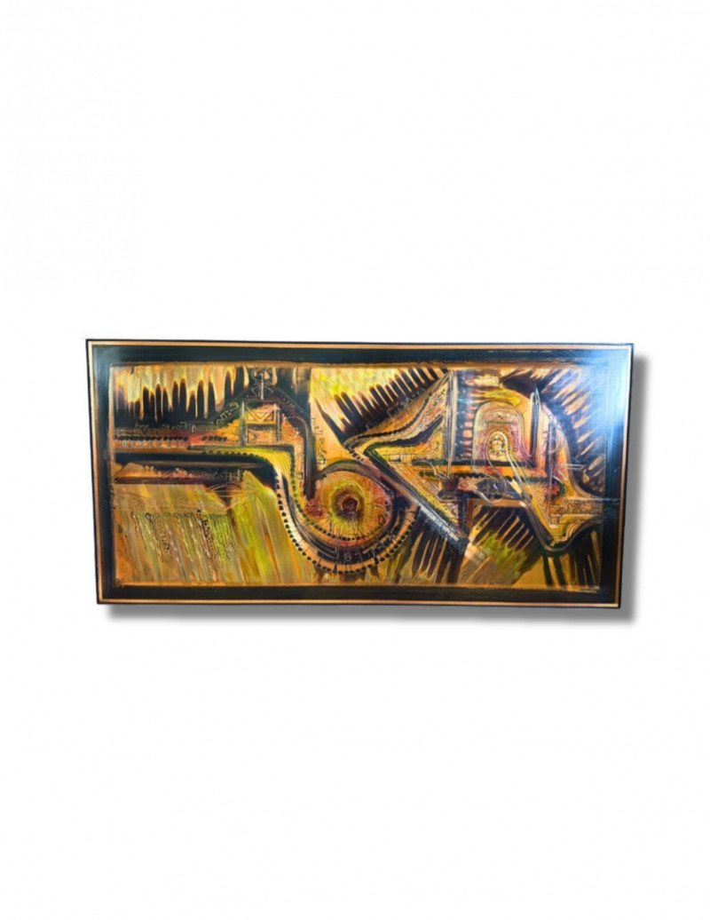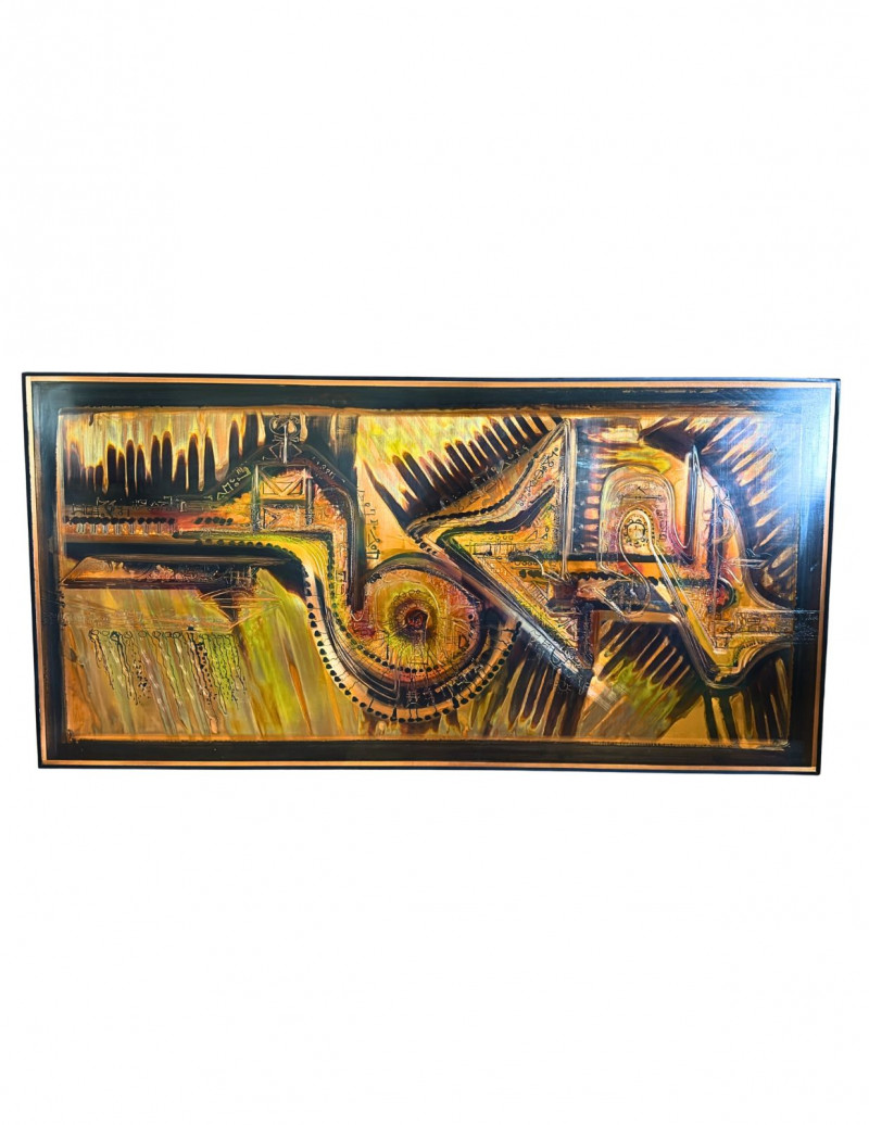 Bernhard Rohne 1973 Etched Brass Wall Art with Enamel Detail – Brutalist Mid-Century Modern A striking and highly collectible original 1973 etched brass wall panel by renowned German-Canadian artist Bernhard Rohne. This dynamic Brutalist composition features intricate etched linework, architectural abstraction, and dimensional detailing accented with rich enamel elements. The warm brass tones and industrial aesthetic make this a powerful statement piece for collectors of mid-century modern and studio metal art. Measurements: Condition: Historical Note: Value: