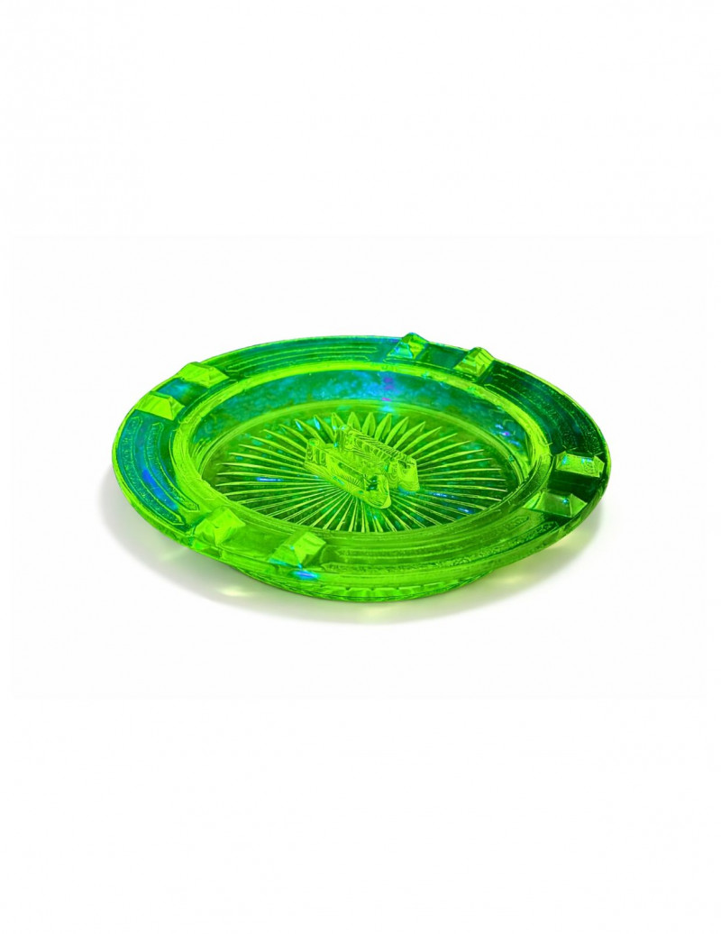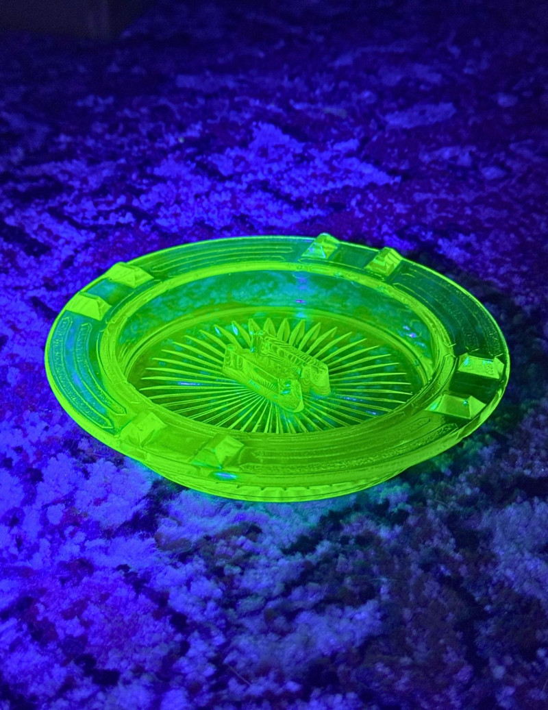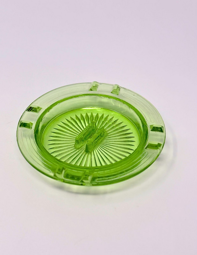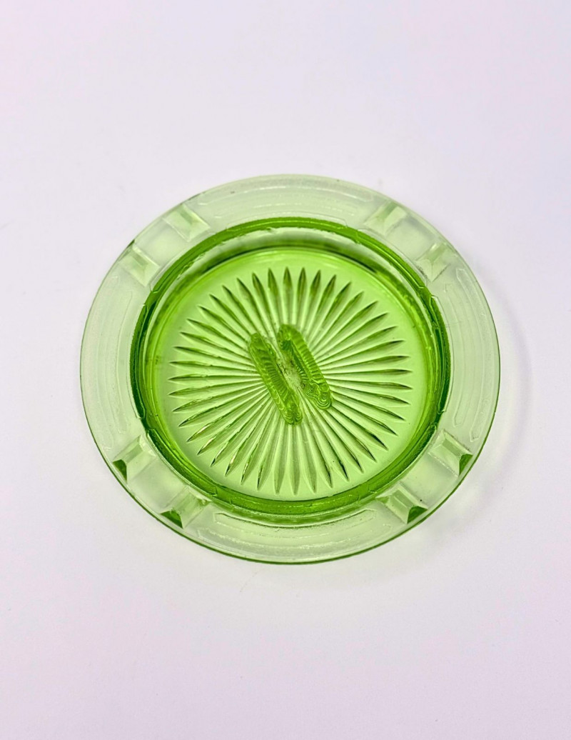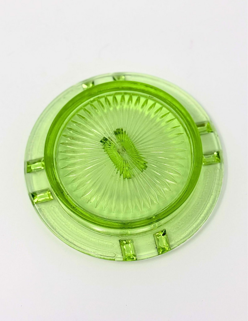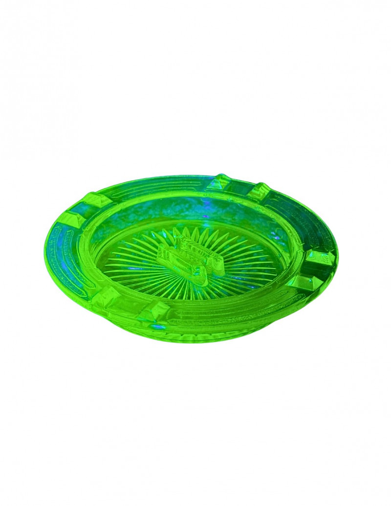 Hazel Atlas Checkerboard Uranium Glass Ashtray with Matchbook Holder Authentic vintage Hazel Atlas “Checkerboard” pattern ashtray crafted in vibrant green uranium (Vaseline) glass, produced in the 1930s. This classic Depression-era piece features a molded checkerboard pattern on the underside and a built-in center matchbook holder, along with four geometric cigarette rests along the rim. Under UV light, the glass fluoresces with a brilliant neon green glow, making it equally desirable for both smoking memorabilia collectors and uranium glass enthusiasts. Measurements: Approximately 5.5–5.75” diameter, 1–2” tall Condition: Very good vintage condition. No visible cracks noted. Light surface wear consistent with age and prior use. Historical Note: Hazel Atlas Glass Company was one of the leading American glass manufacturers during the Depression era. The “Checkerboard” pattern is a recognized 1930s design and remains highly collectible, especially in uranium glass variations due to their signature blacklight glow. Value: $95