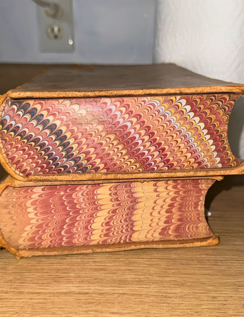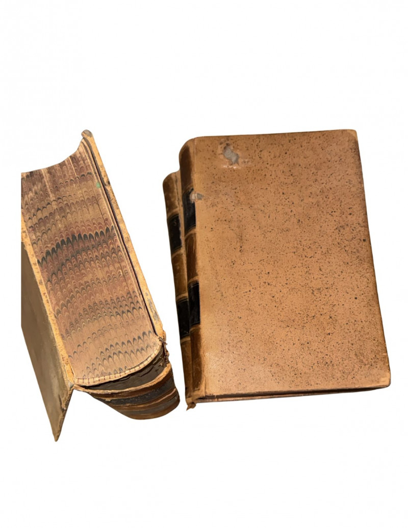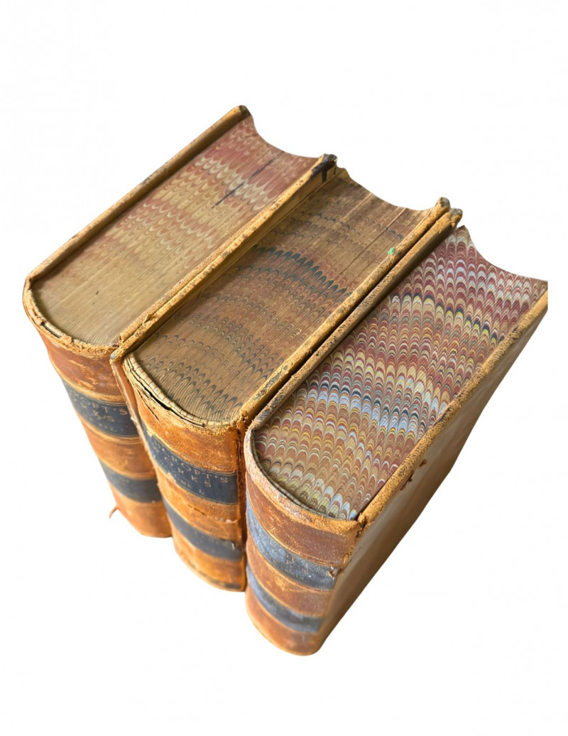 Condition: Antique condition with significant age-related wear. Leather bindings show surface wear, rubbing, and edge loss consistent with late 19th-century use. One volume has a detached rear cover, and another shows a loose spine label requiring reattachment or conservation. Pages show typical age toning but remain largely intact and readable. Structurally stable overall despite binding wear.