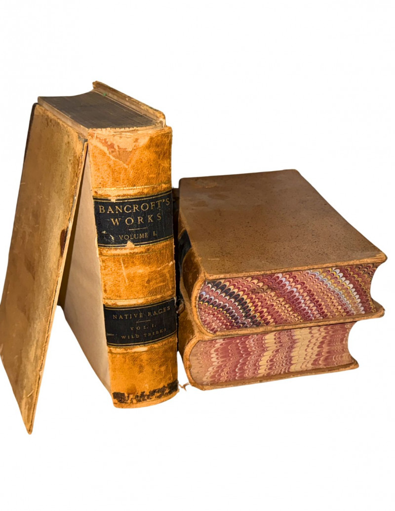 Antique first edition volumes from “The Works of Hubert Howe Bancroft,” a landmark 19th-century historical series documenting the history and cultures of the American West. This lot includes three leather-bound volumes published in San Francisco by The History Company and A.L. Bancroft & Company in the 1880s. Titles include “History of Oregon, Vol. I (1834–1848),” “History of Oregon, Vol. II (1848–1888),” and “The Native Races, Vol. I – Wild Tribes.” Bound in original tan leather with black and gilt spine labels and marbled page edges. Bancroft’s monumental multi-volume set remains one of the earliest comprehensive historical records of the Pacific Coast, Native cultures, and western expansion.