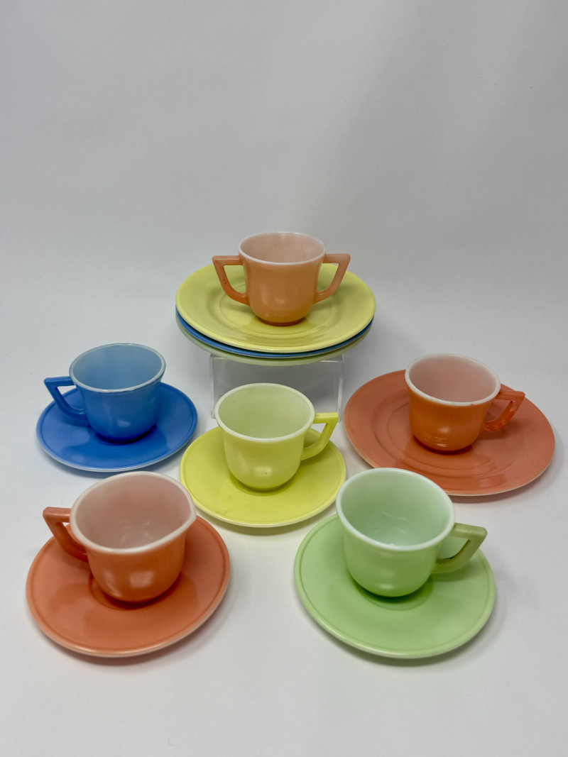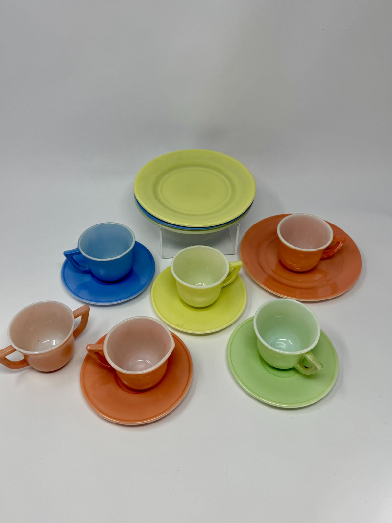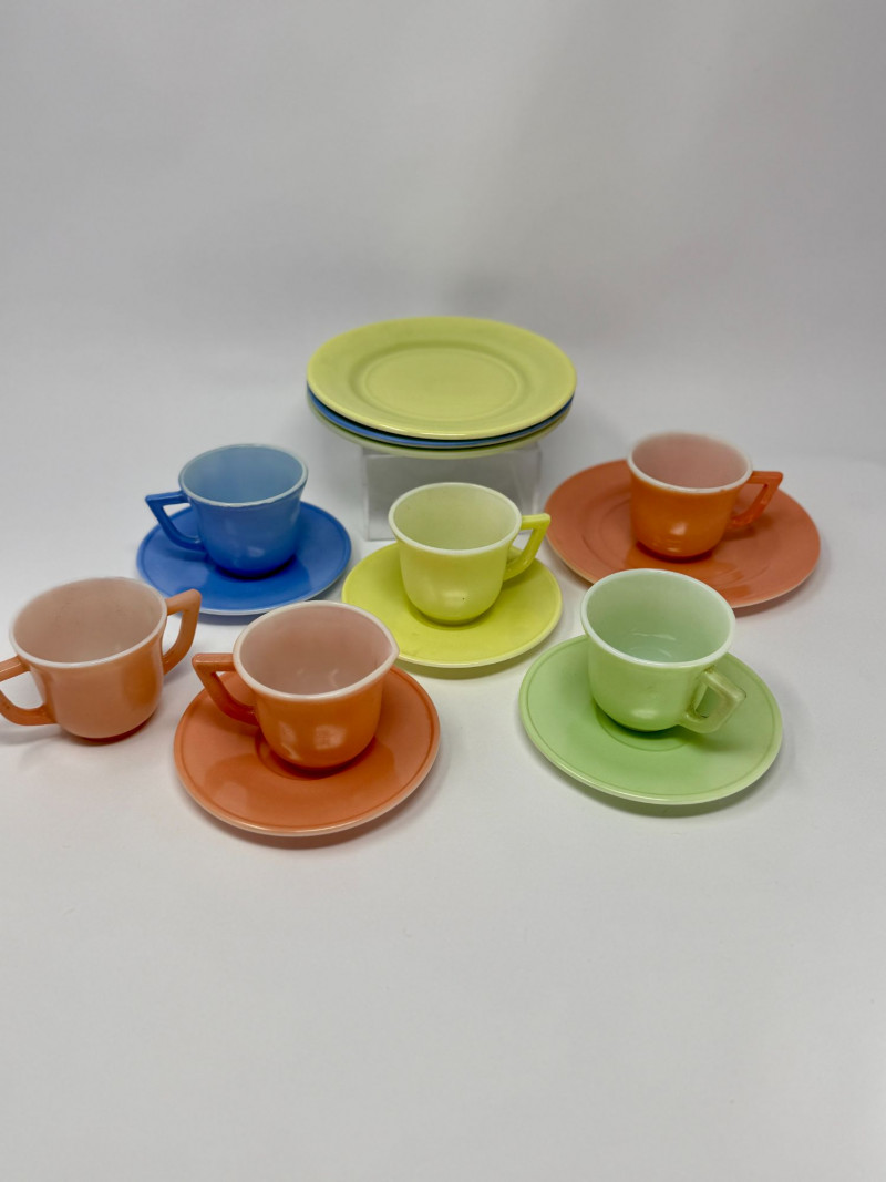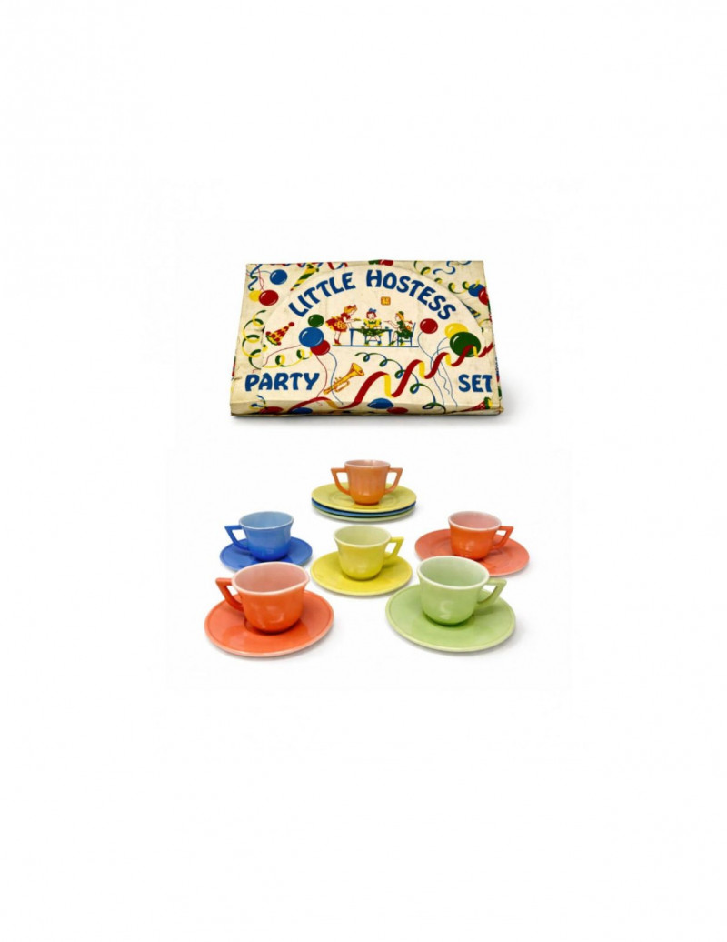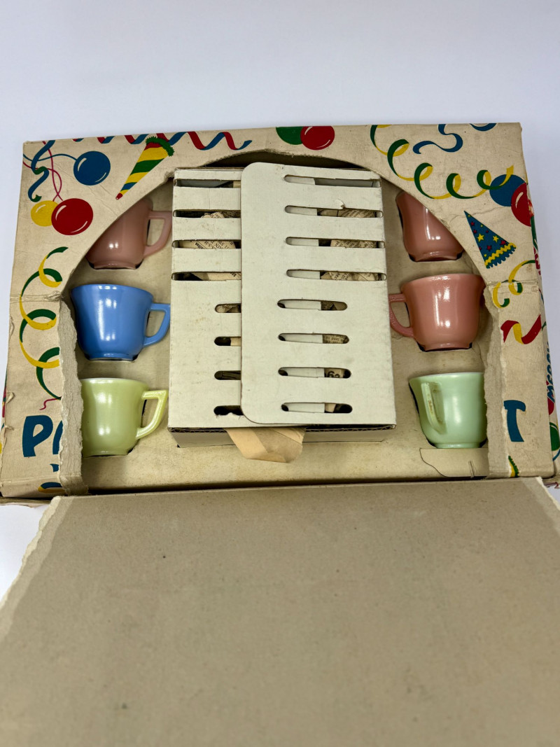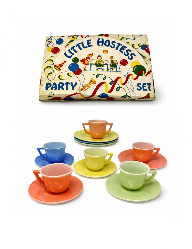 Vintage Little Hostess Party Set Children’s Tea Set with Original Box – Mid-Century Toy Dish Set Details: Charming vintage “Little Hostess Party Set” children’s tea set featuring brightly colored cups and saucers in classic mid-century pastel tones including yellow, green, blue, coral, and orange. The set includes miniature teacups with matching saucers designed for children’s tea parties and imaginative play. The original illustrated box features playful party graphics with balloons, streamers, and children hosting a tea party, adding nostalgic display appeal. Sets like this were commonly produced in the mid-20th century and were often made of molded plastic or melamine to mimic adult dishware in child-friendly sizes. Complete sets with the original box are increasingly desirable among collectors of vintage toys, children’s dish sets, and mid-century kitchen collectibles. Measurements (Approximate): Condition: Vintage condition with light surface wear consistent with age and play. Original box shows visible wear, creasing, and edge wear but remains structurally intact and displays well. Historical Note: Children’s tea sets became extremely popular in the 1940s–1960s, reflecting the era’s fascination with domestic play and social entertaining. These miniature sets were designed to replicate adult tableware and were commonly given as birthday or holiday gifts. Brightly colored plastic examples like this reflect the post-war boom in plastics manufacturing and mid-century design aesthetics.