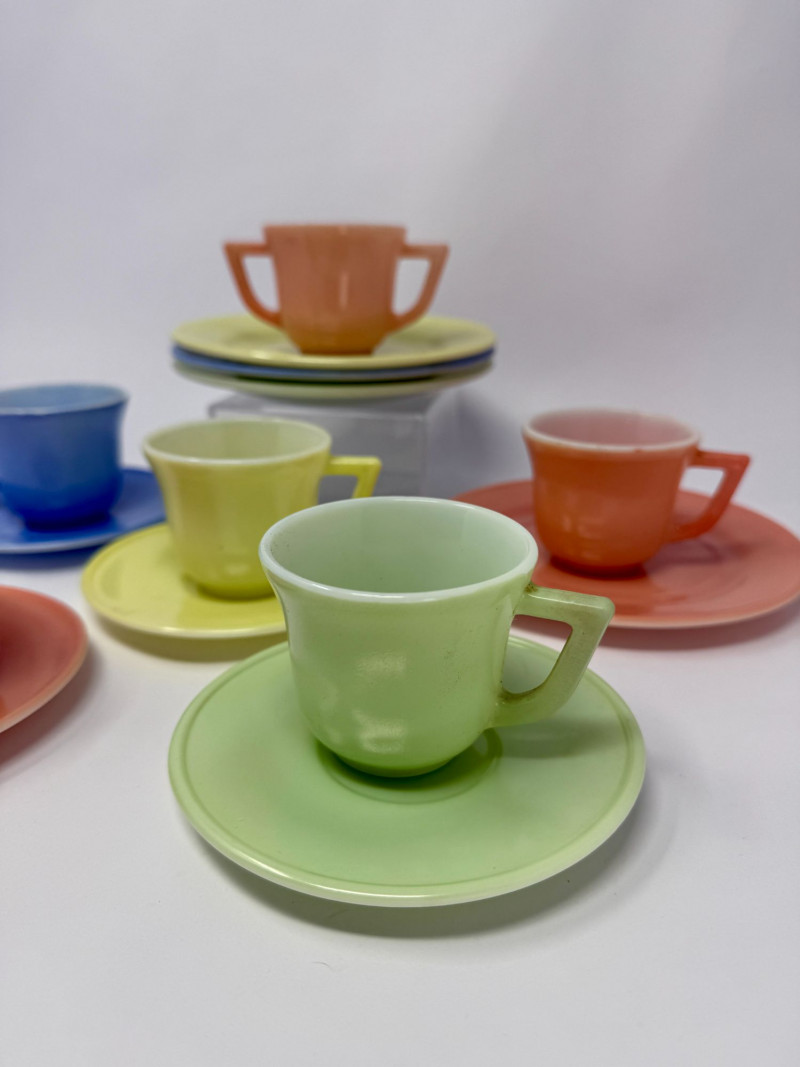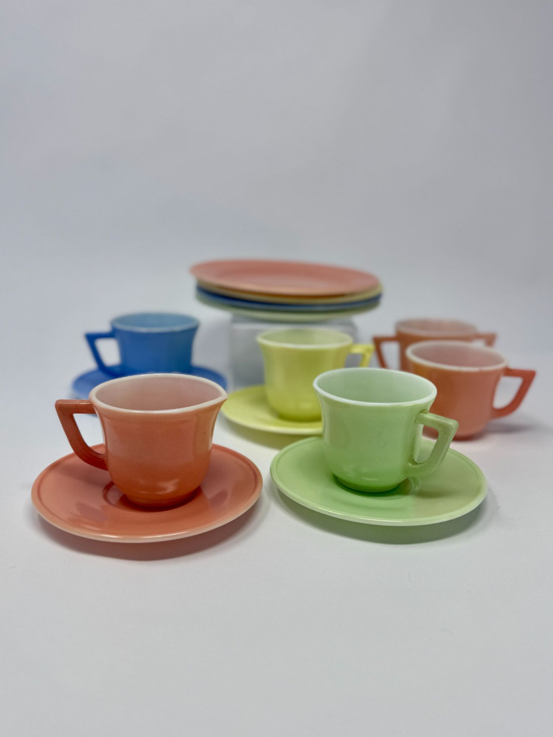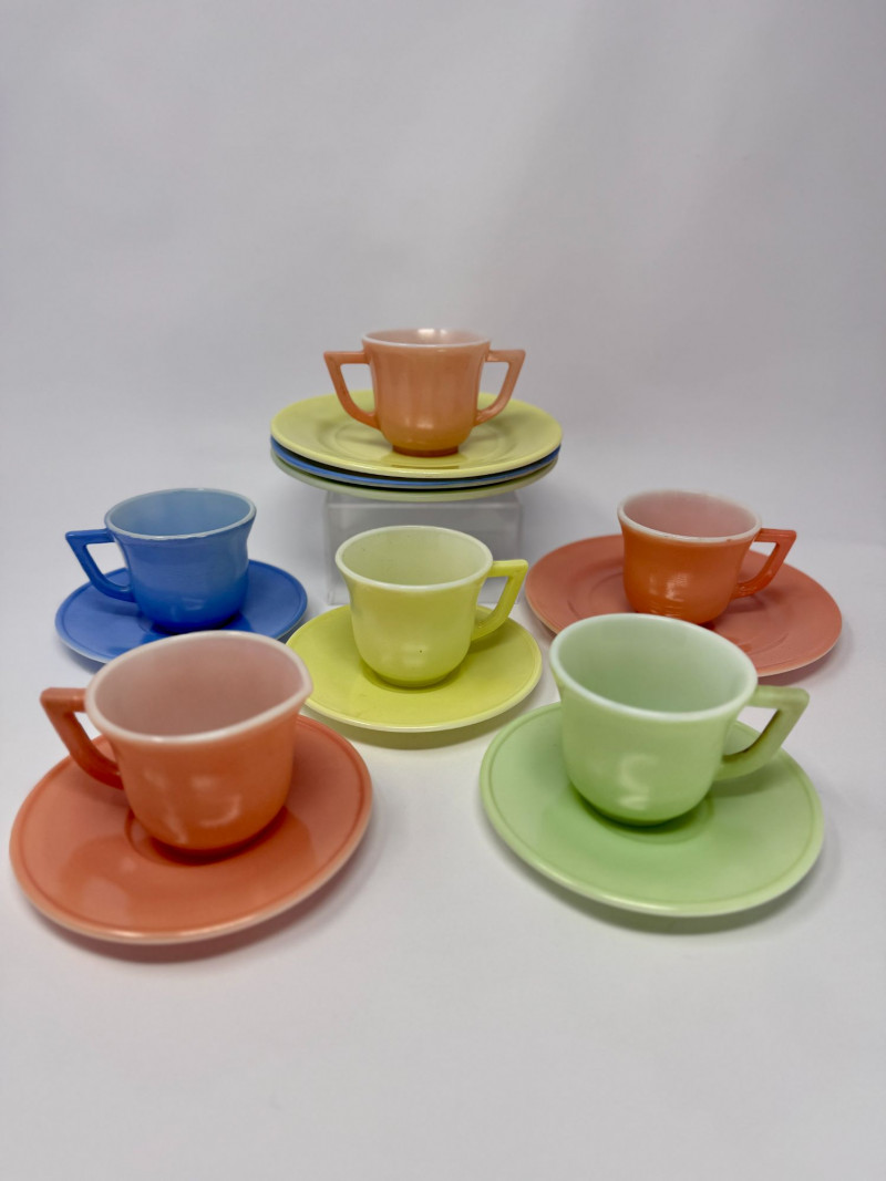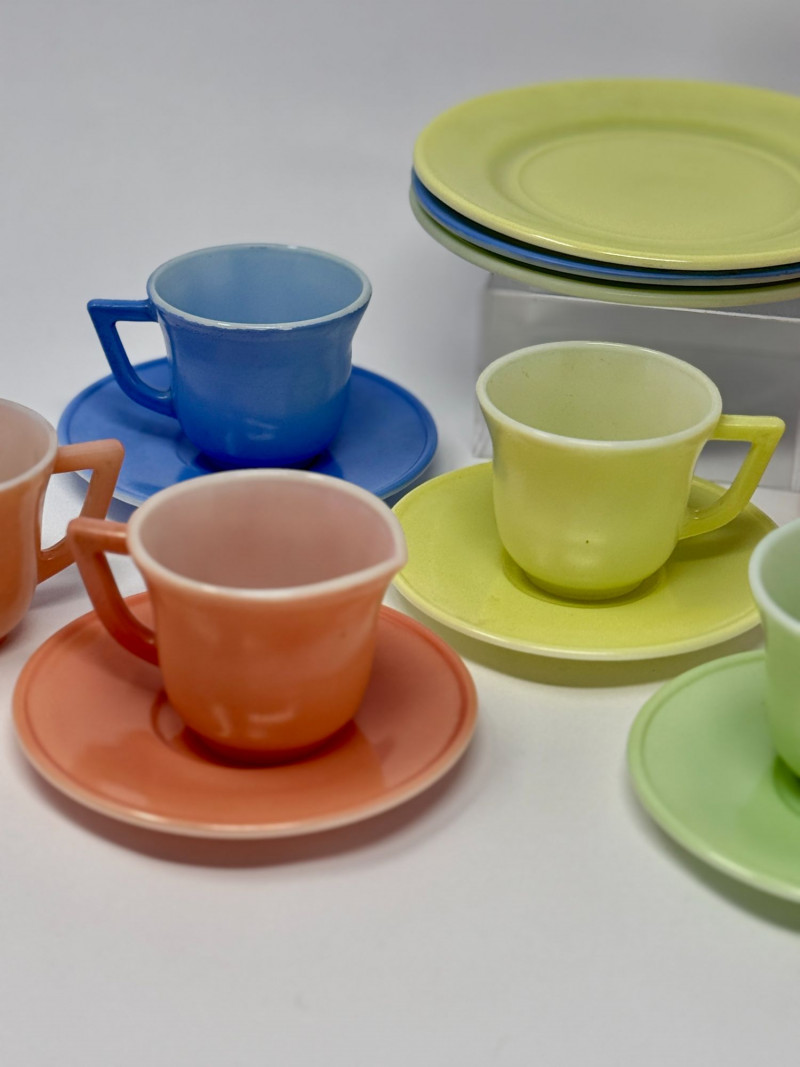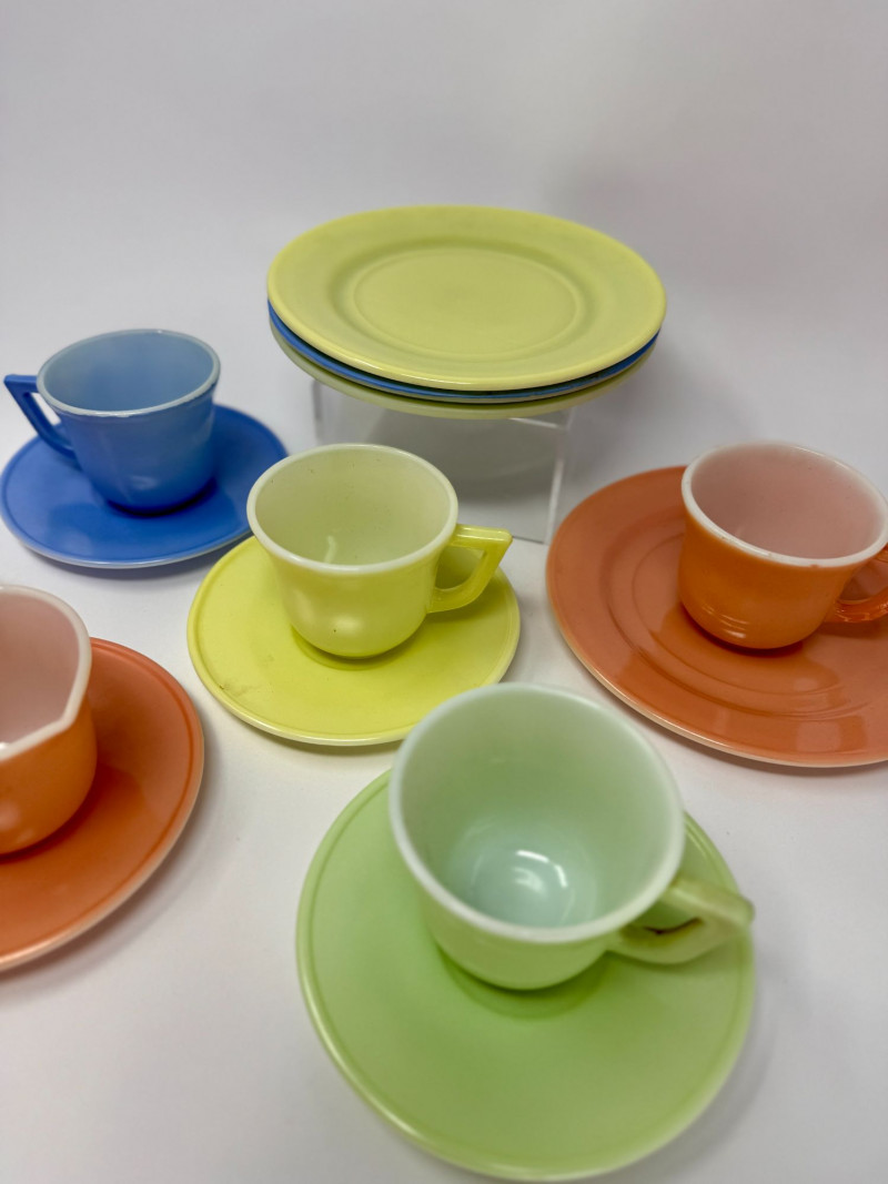 Vintage Little Hostess Party Set Children’s Tea Set with Original Box – Mid-Century Toy Dish Set Details: Charming vintage “Little Hostess Party Set” children’s tea set featuring brightly colored cups and saucers in classic mid-century pastel tones including yellow, green, blue, coral, and orange. The set includes miniature teacups with matching saucers designed for children’s tea parties and imaginative play. The original illustrated box features playful party graphics with balloons, streamers, and children hosting a tea party, adding nostalgic display appeal. Sets like this were commonly produced in the mid-20th century and were often made of molded plastic or melamine to mimic adult dishware in child-friendly sizes. Complete sets with the original box are increasingly desirable among collectors of vintage toys, children’s dish sets, and mid-century kitchen collectibles. Measurements (Approximate): Condition: Vintage condition with light surface wear consistent with age and play. Original box shows visible wear, creasing, and edge wear but remains structurally intact and displays well. Historical Note: Children’s tea sets became extremely popular in the 1940s–1960s, reflecting the era’s fascination with domestic play and social entertaining. These miniature sets were designed to replicate adult tableware and were commonly given as birthday or holiday gifts. Brightly colored plastic examples like this reflect the post-war boom in plastics manufacturing and mid-century design aesthetics.