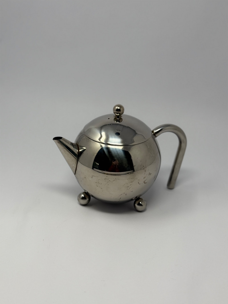 • Chrome Atomic Teapot: 7–9” wide, 5–6” tall