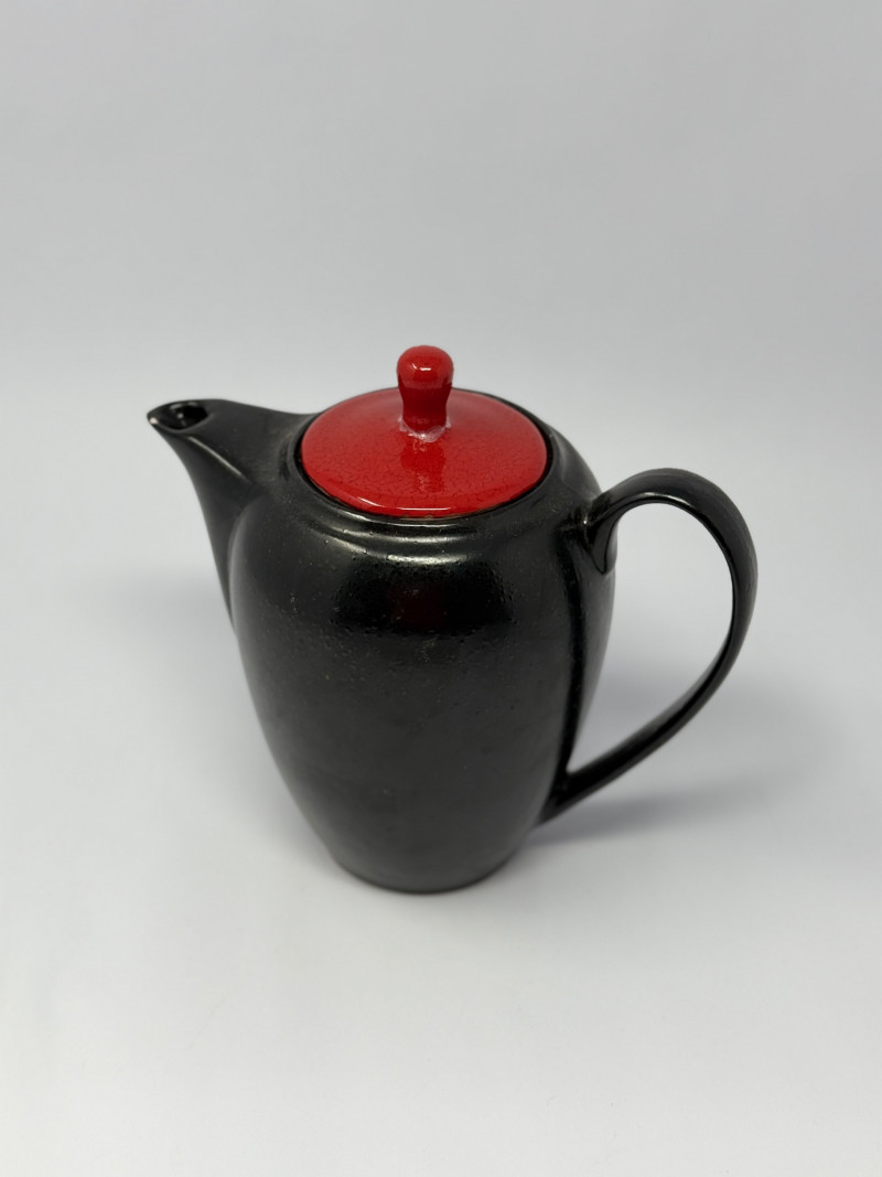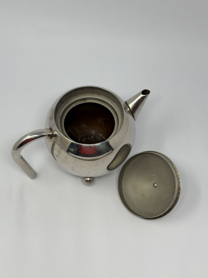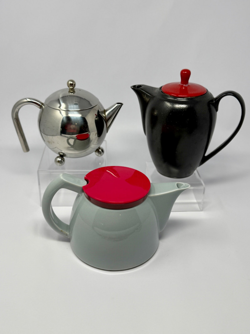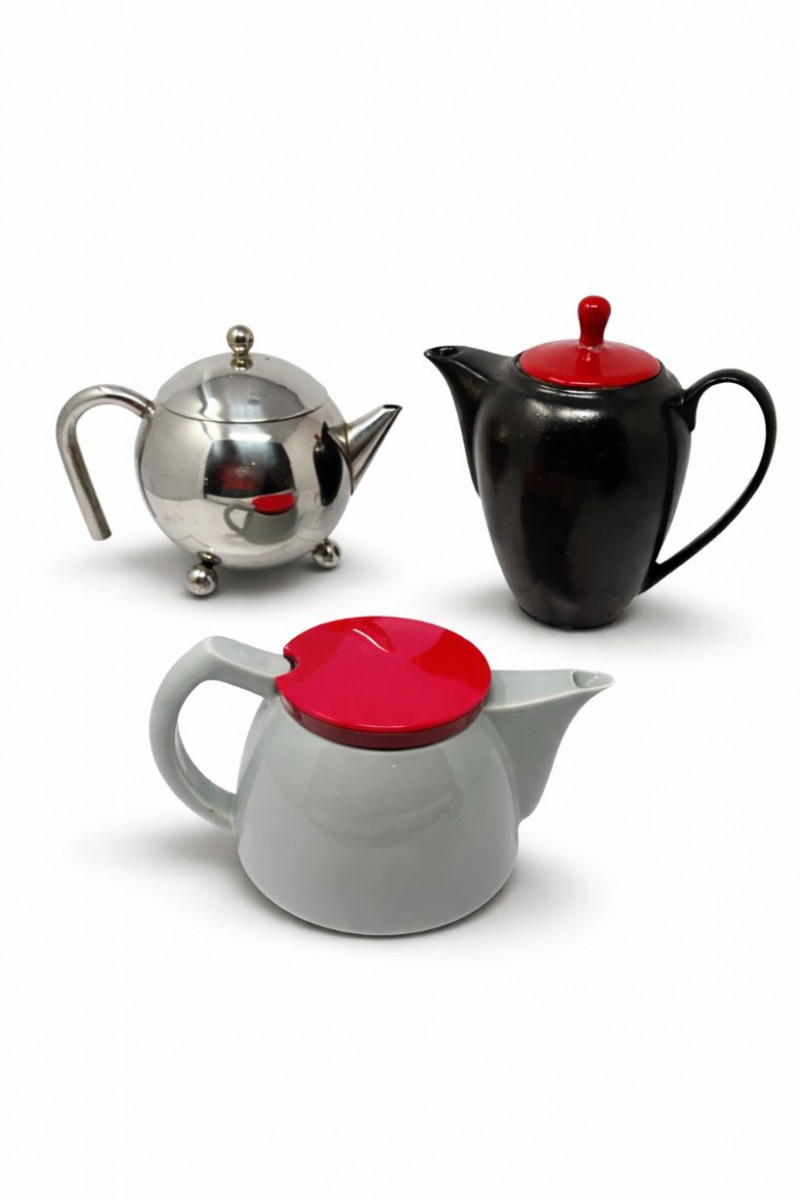 HAY Sowden, Tannex Mikado & Atomic Chrome Teapot Set Details: Collection of three distinctive designer teapots spanning mid-century modern and contemporary design, including examples in stainless steel and ceramic. The group features a polished atomic-style chrome teapot with spherical body and tripod ball feet, a form strongly associated with mid-century modern barware and tea service design. Also included is a Tannex “Mikado” ceramic teapot in black with a contrasting red lid, known for its minimalist Japanese-inspired modern aesthetic. Completing the set is a HAY Sowden teapot in grey, designed by renowned British designer George Sowden, featuring a bold red lid and a modern sculptural profile with integrated brewing filter. Together these pieces showcase the evolution of modern teapot design from playful atomic-age forms of the 1950s–60s to contemporary European industrial design. Measurements (Approximate): Condition: Very good overall condition with light surface wear consistent with use. Chrome teapot shows minor polishing marks typical for stainless steel. Ceramic examples appear free of major chips or cracks. Historical Note: Atomic-style chrome teapots became popular during the mid-century modern era, reflecting the futuristic design language of the 1950s space age. The Tannex Mikado series introduced a clean minimalist interpretation of traditional tea service in the late 20th century. More recently, designer George Sowden, a founding member of the influential Memphis design movement, created the Sowden teapot for Danish design company HAY, blending playful color with modern functional design. Estimated Value: $165