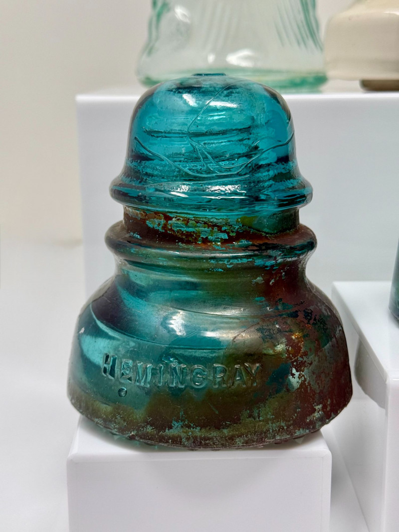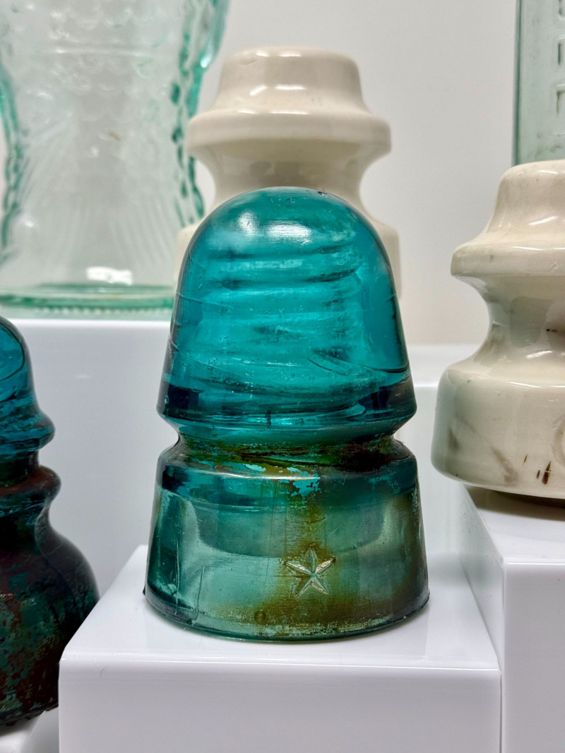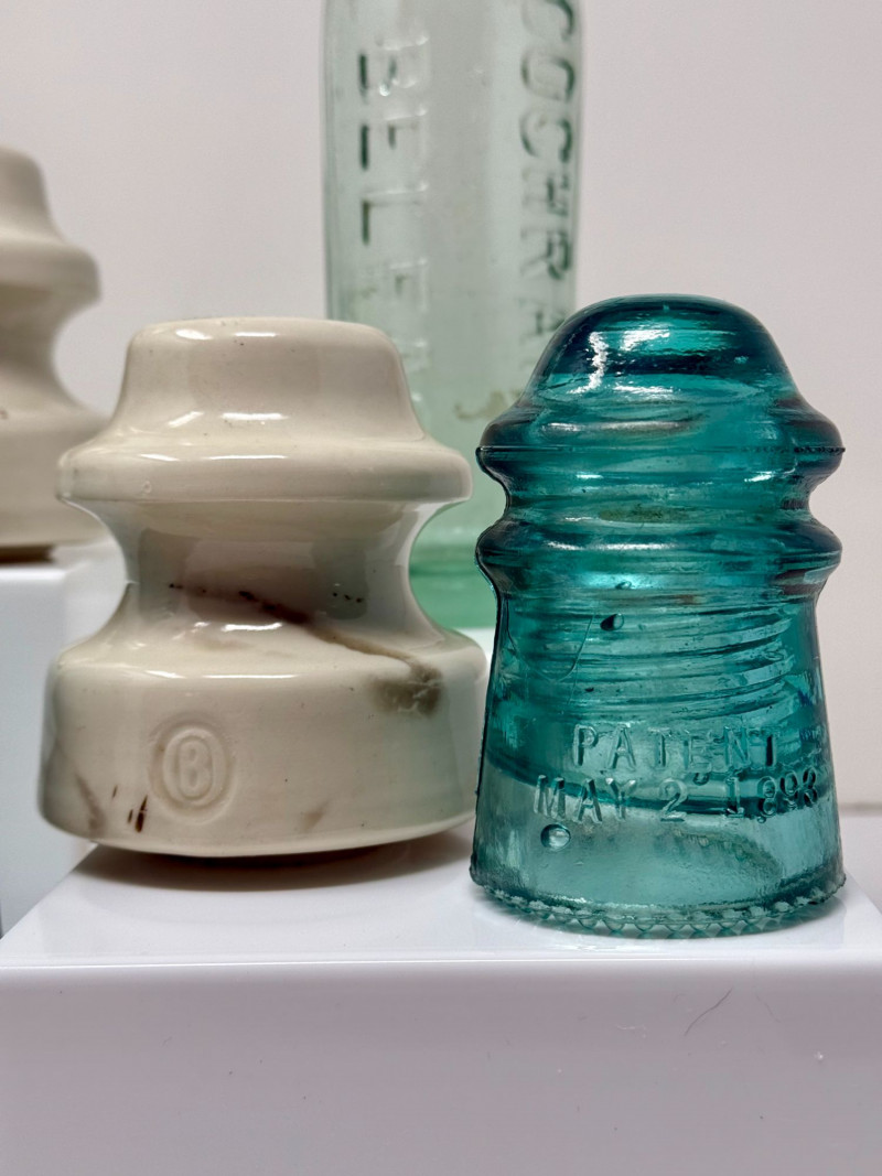 • Glass insulators: Originally used on telegraph and early electrical lines; their colors were often accidental, caused by mineral content in the glass.