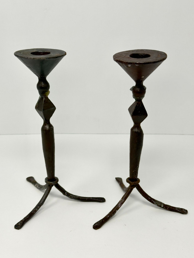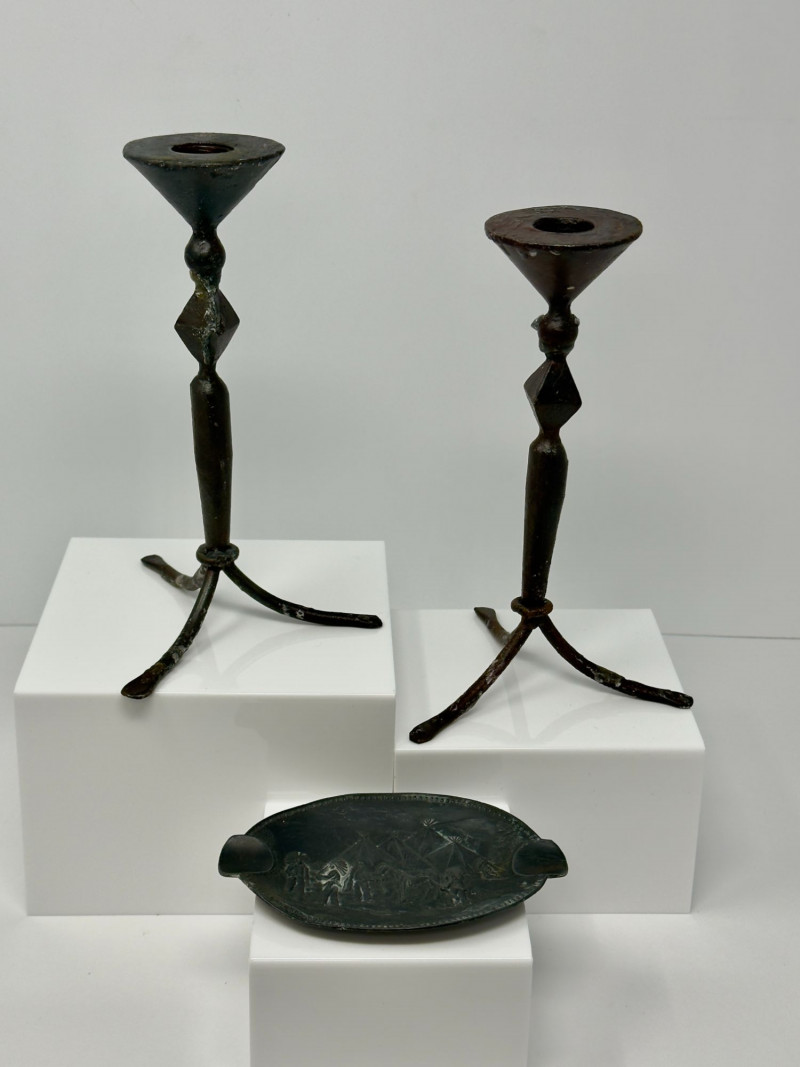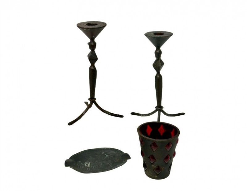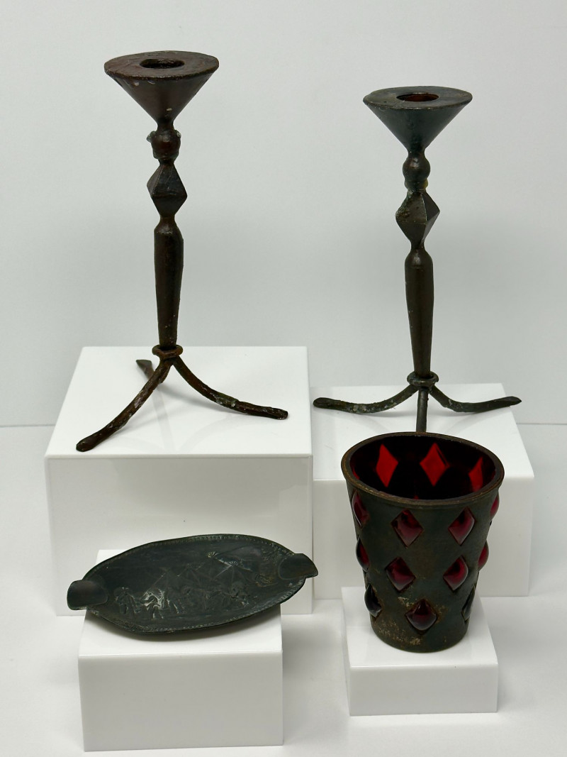 Vintage Brutalist & Wrought Iron Decorative Lot — Candlesticks, Ruby Glass Candle Holder & Cast Metal Tray A curated decorative lot featuring sculptural wrought iron candlesticks, a ruby red glass and metal candle holder, and a cast metal tray with engraved figural detail. This grouping blends Brutalist, rustic, and hand-forged aesthetics, ideal for collectors of mid-century and artisan metalwork décor. Dimensions: Varied sizes; candlesticks approx. 11–13" H; ruby glass candle holder approx. 5" H; tray approx. 7" W (see photos for scale). What’s Included: Pair of wrought iron candlesticks with hand-forged tripod bases; ruby red glass and metal candle holder with diamond-cut openings; cast metal tray with engraved figural scene and beaded rim. Historical Notes: Hand-forged wrought iron candlesticks were traditionally made in small workshops, giving each piece subtle variations that make them uniquely individual. Ruby red glass achieves its color through gold chloride, a centuries-old glassmaking technique prized for its deep jewel tone when illuminated. Cast metal trays with engraved imagery were popular mid-century as both functional ashtrays and sculptural décor, often featuring symbolic or folk-inspired scenes. The combination of raw metal and colored glass reflects Brutalist and MCM design principles focused on texture, contrast, and honest materials.