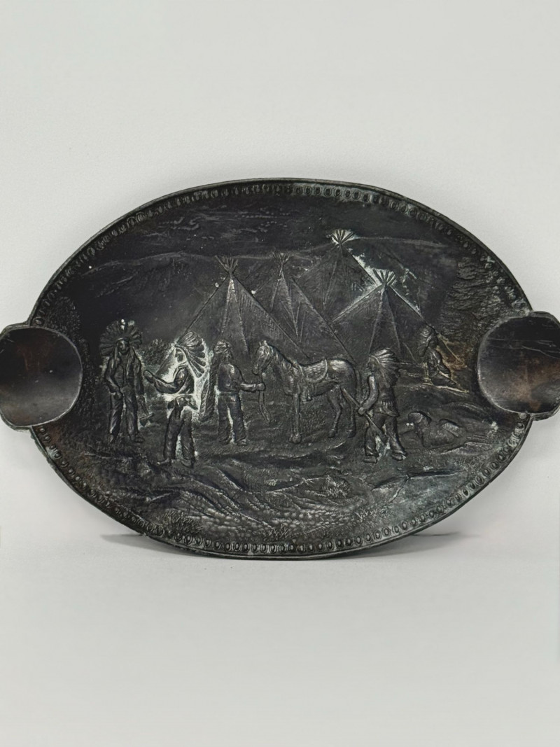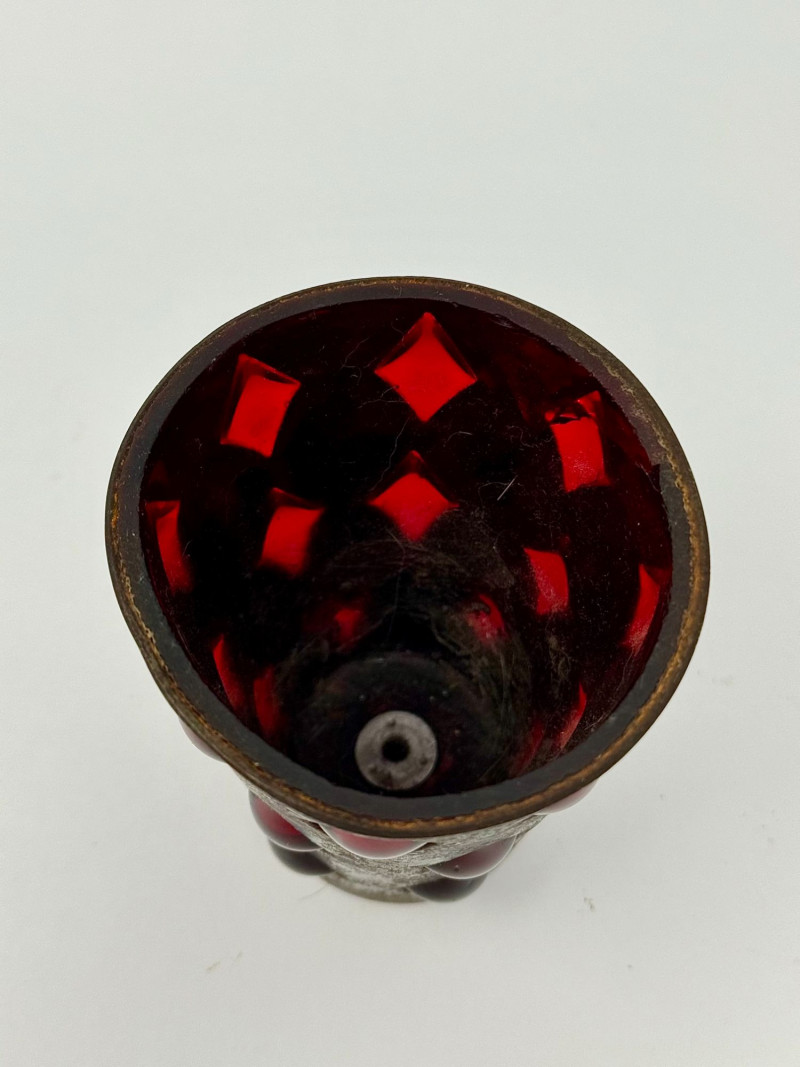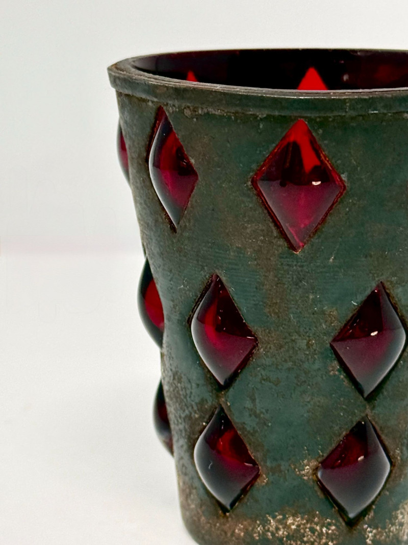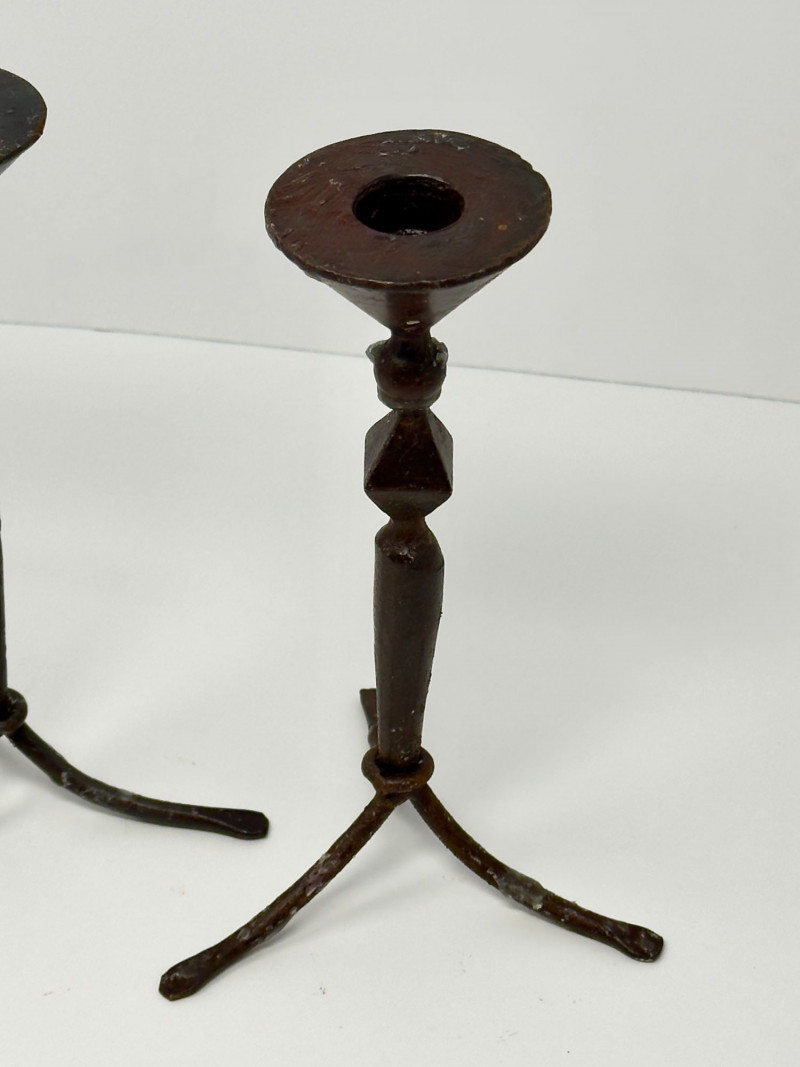 Vintage Brutalist & Wrought Iron Decorative Lot — Candlesticks, Ruby Glass Candle Holder & Cast Metal Tray A curated decorative lot featuring sculptural wrought iron candlesticks, a ruby red glass and metal candle holder, and a cast metal tray with engraved figural detail. This grouping blends Brutalist, rustic, and hand-forged aesthetics, ideal for collectors of mid-century and artisan metalwork décor. Dimensions: Varied sizes; candlesticks approx. 11–13" H; ruby glass candle holder approx. 5" H; tray approx. 7" W (see photos for scale). What’s Included: Pair of wrought iron candlesticks with hand-forged tripod bases; ruby red glass and metal candle holder with diamond-cut openings; cast metal tray with engraved figural scene and beaded rim. Historical Notes: Hand-forged wrought iron candlesticks were traditionally made in small workshops, giving each piece subtle variations that make them uniquely individual. Ruby red glass achieves its color through gold chloride, a centuries-old glassmaking technique prized for its deep jewel tone when illuminated. Cast metal trays with engraved imagery were popular mid-century as both functional ashtrays and sculptural décor, often featuring symbolic or folk-inspired scenes. The combination of raw metal and colored glass reflects Brutalist and MCM design principles focused on texture, contrast, and honest materials.