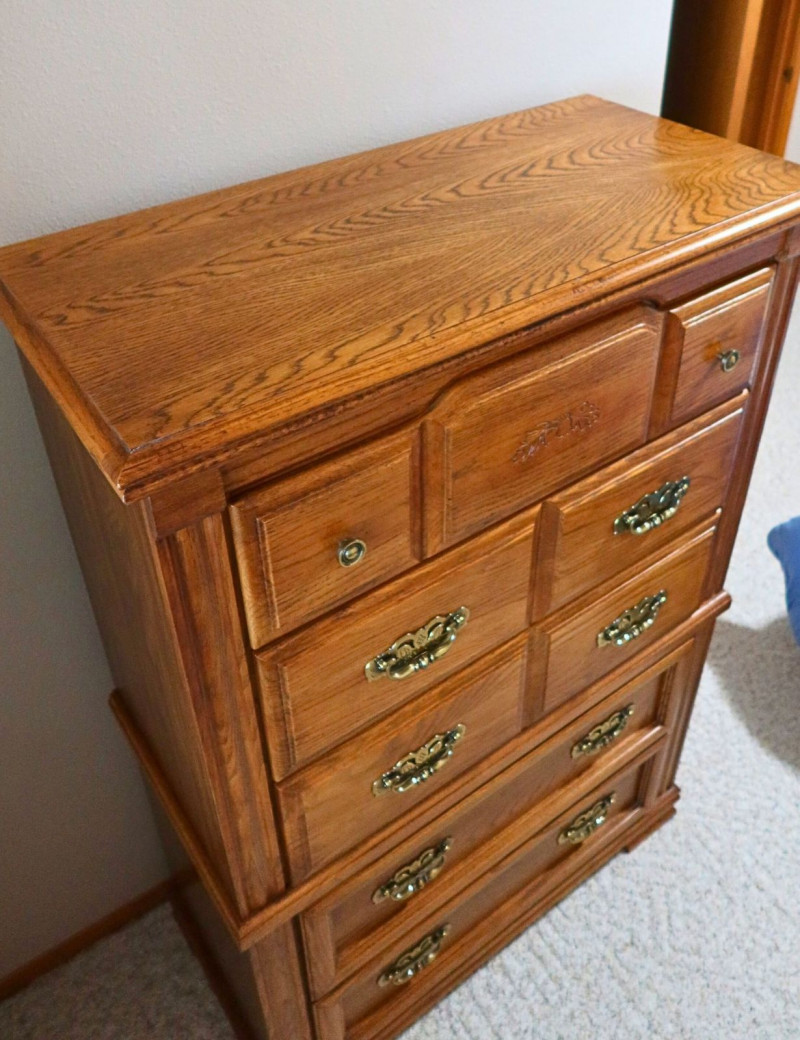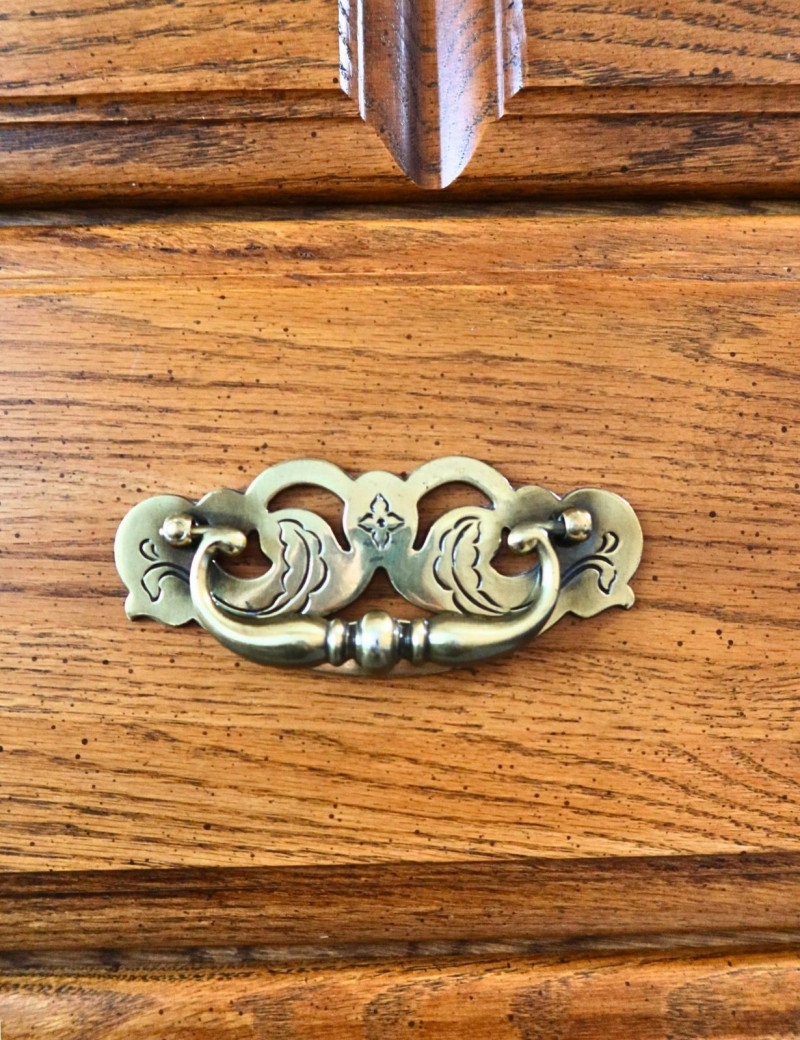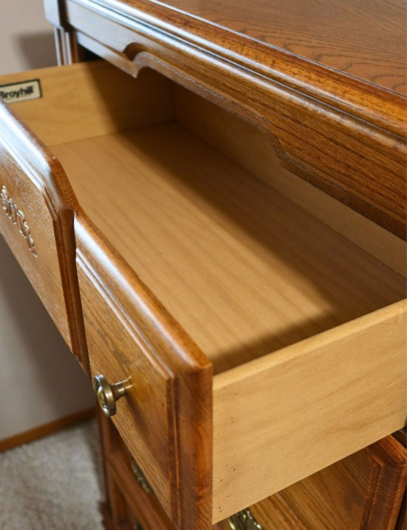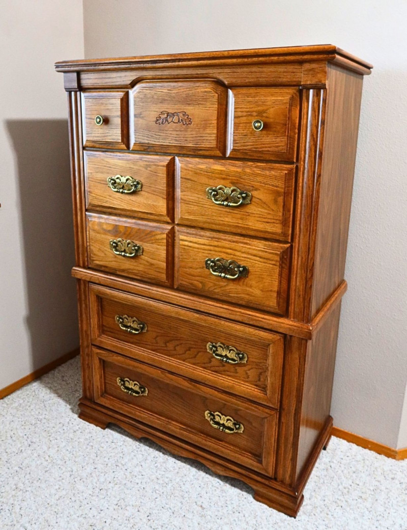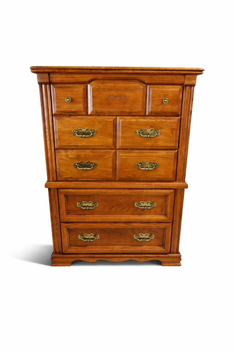 Historical Note: The term “highboy” dates back to early American furniture design in the 18th century, referring to tall chest-on-chest storage pieces that elevated clothing above floor level in colonial homes. By the late 20th century, oak highboy dressers like this became popular again during the 1970s–1990s revival of traditional American furniture, prized for their durability and classic appearance.