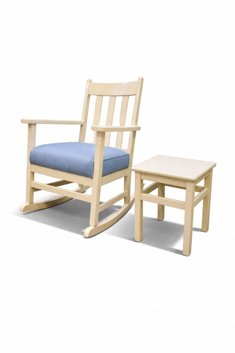 A charming vintage wooden rocking chair paired with its matching footstool, featuring a classic slat-back design and gently curved rocking base. Finished in a soft cream paint with a comfortable blue upholstered seat, this cozy set is ideal for a nursery, reading corner, or cottage-style interior.