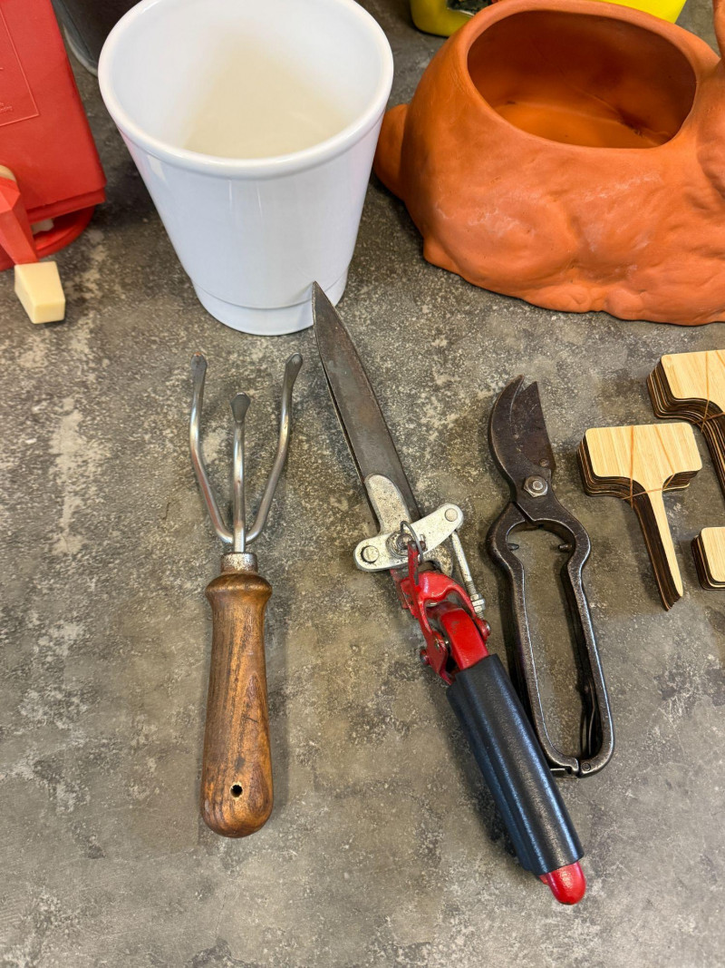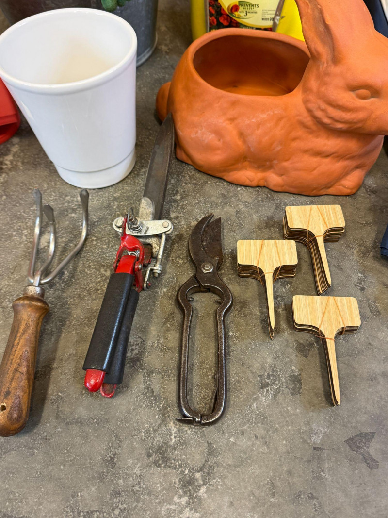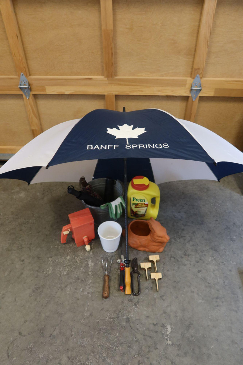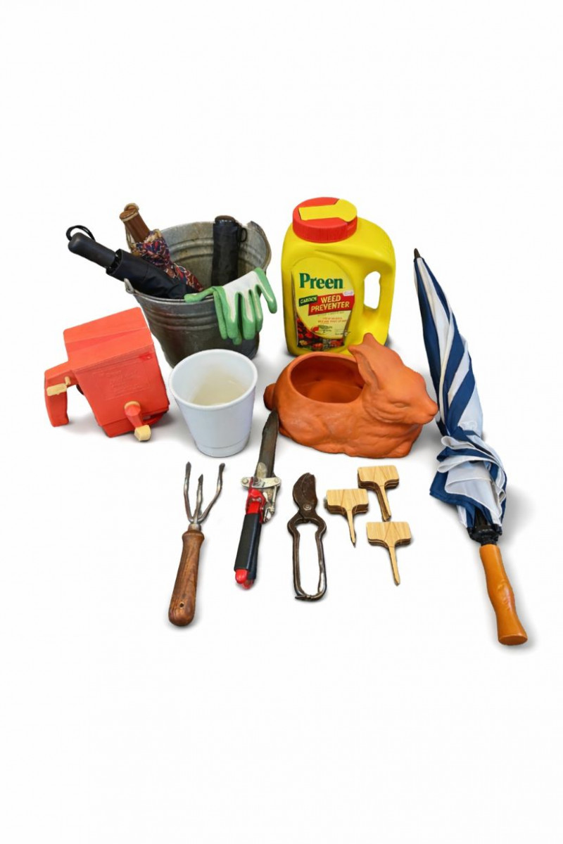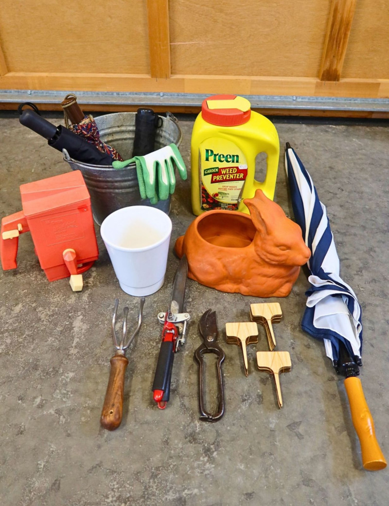 Garden Tools & Outdoor Accessories Lot — Planters, Tools, Umbrella & Decor A charming assortment of garden tools and outdoor accessories perfect for gardening enthusiasts or patio décor. This mixed lot includes practical planting tools along with decorative pieces and outdoor essentials, making it ideal for both garden maintenance and decorative use. The grouping features hand gardening tools, pruning shears, a cultivator, plant markers, a metal bucket with gloves, a terracotta rabbit planter, small planter pot, outdoor umbrella, and additional garden accessories. Items like the classic terracotta planter and vintage-style beverage dispenser add a decorative touch to patios, garden beds, or potting areas. Features: Measurements: Style: Condition: Historical Note: Estimated Value: