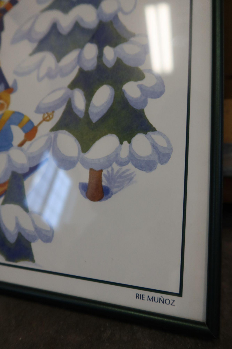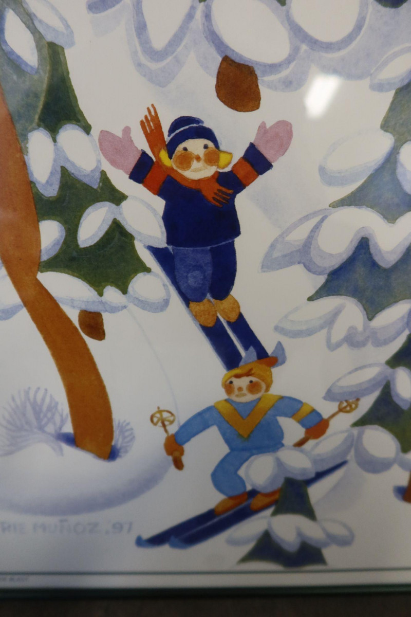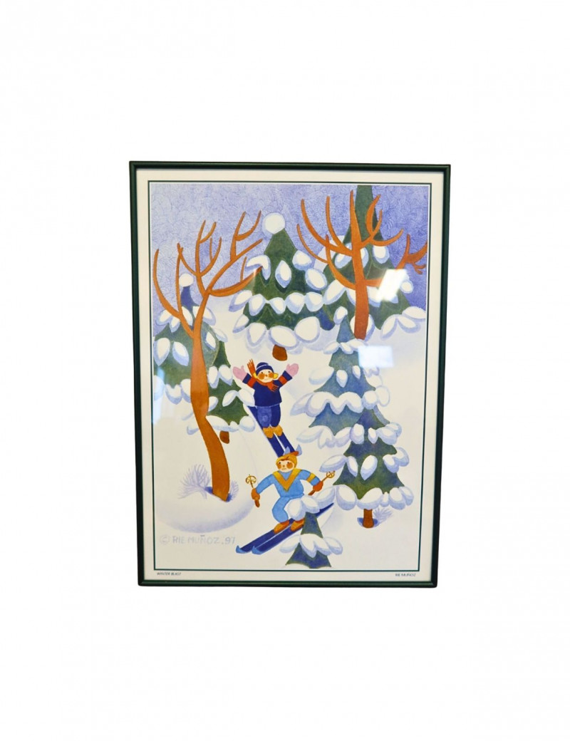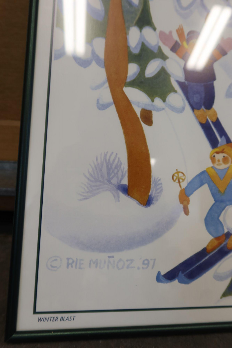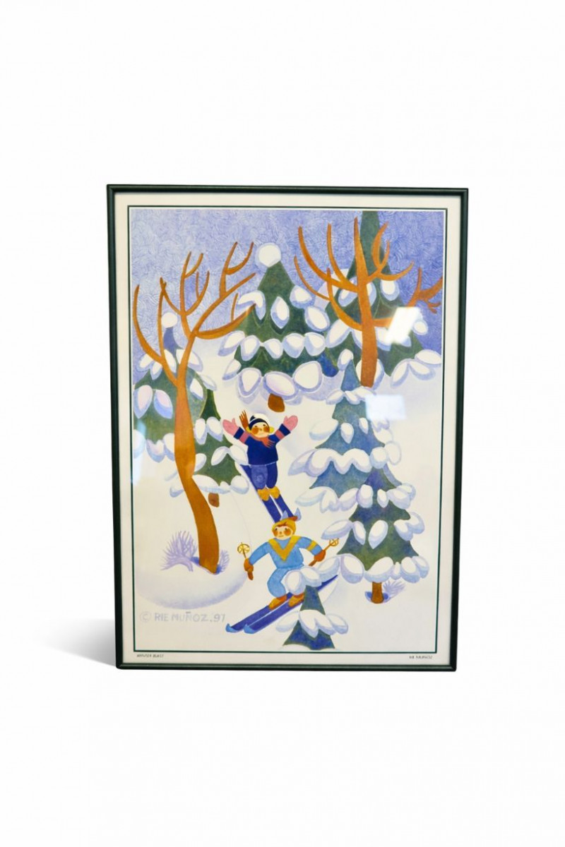 Charming framed print titled “Winter Blast” by noted Alaskan artist Rie Muñoz, dated 1997. This whimsical winter scene features playful skiers surrounded by snow-covered trees, illustrated in Muñoz’s recognizable folk-art style known for its soft watercolor palette and joyful storytelling.