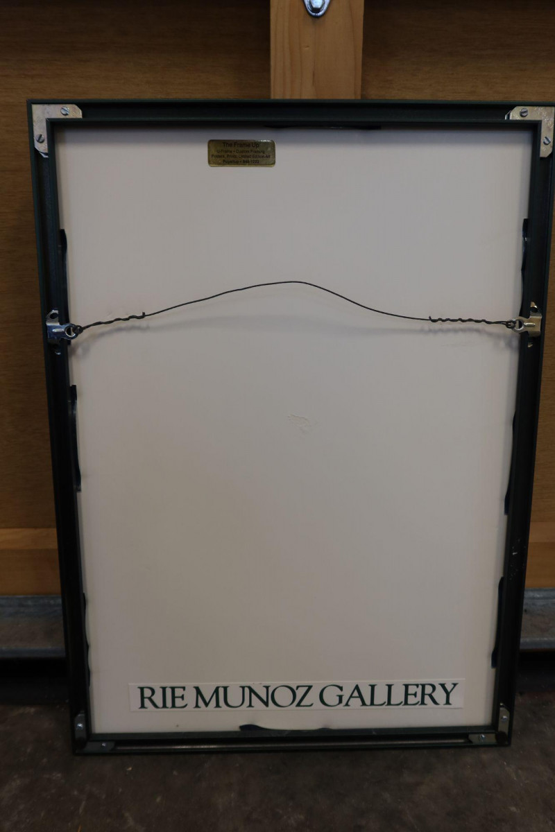 Back retains gallery labeling for Rie Muñoz Gallery and framing label from The Frame Up – Puyallup, WA.