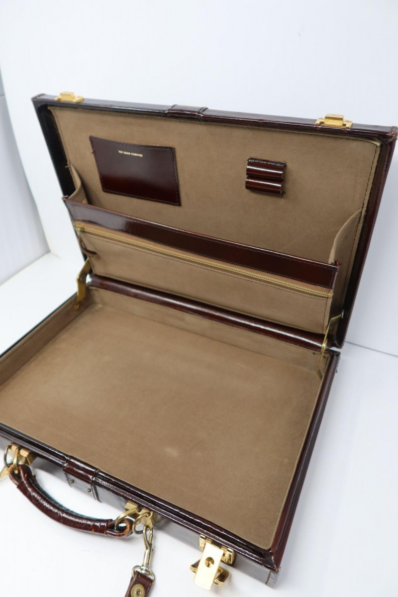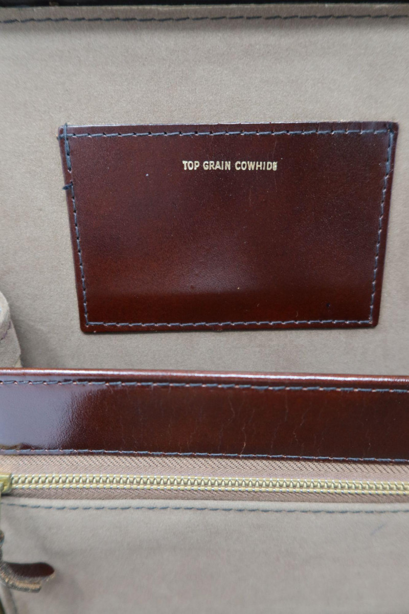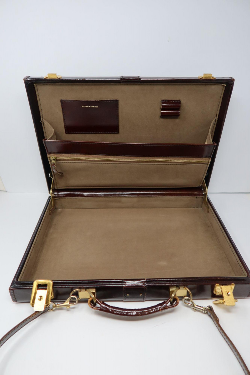 Vintage Top Grain Cowhide Leather Briefcase w/ Strap Classic vintage leather briefcase crafted from top grain cowhide, featuring a rich dark brown finish and traditional structured design. The case includes polished brass-tone hardware, dual locking clasps, a sturdy top handle, and a removable shoulder strap for versatile carrying. Inside, the briefcase is lined in a soft tan suede-like material and includes a zippered document pocket, card pocket, and pen holders for organized storage. The interior leather panel is stamped “Top Grain Cowhide,” indicating quality leather construction. This style of briefcase was commonly used by professionals and travelers and remains a timeless accessory for work, display, or vintage fashion styling. Features Approximate Measurements Condition Estimated Auction Value