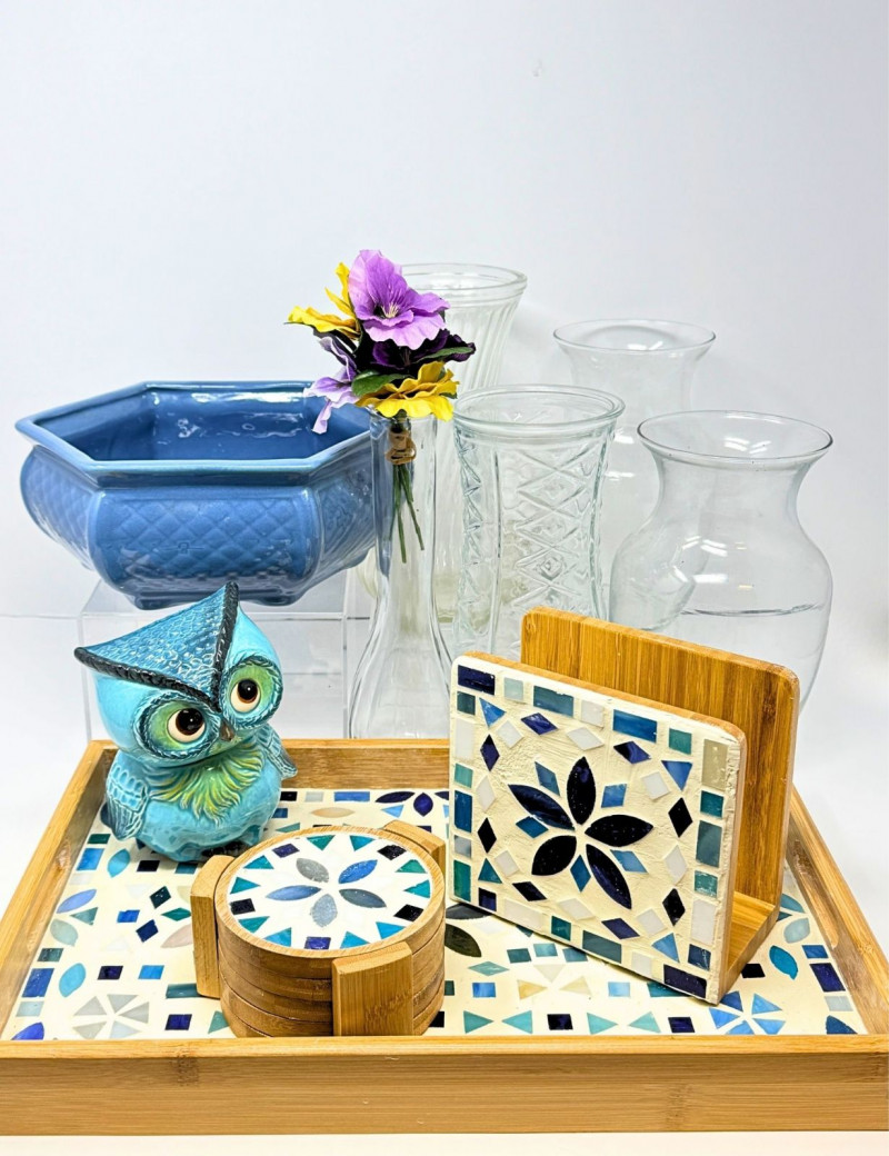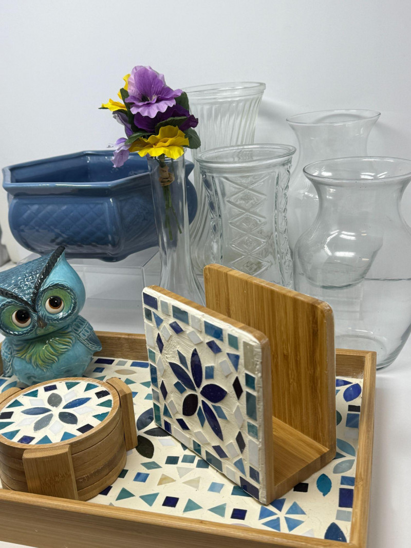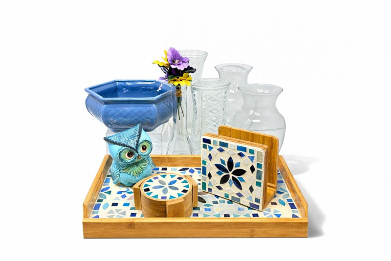 Decor Lot – Glass Vases, Mosaic Tray & Owl Coin Bank Charming mixed home décor collection featuring decorative glass vases, a mosaic bamboo serving tray with coordinating coasters, and a colorful owl figurine. This versatile grouping blends modern decorative pieces with functional serving and floral display items. The lot includes four clear glass vases in varying shapes and textures, ideal for floral arrangements or decorative display. Also included is a blue ceramic planter or bowl, a bamboo tray with blue mosaic tile design, matching mosaic coasters with holder, and a whimsical blue owl figurine. This assortment works well for table styling, entertaining, shelf décor, or resale in individual pieces. Includes Style Condition