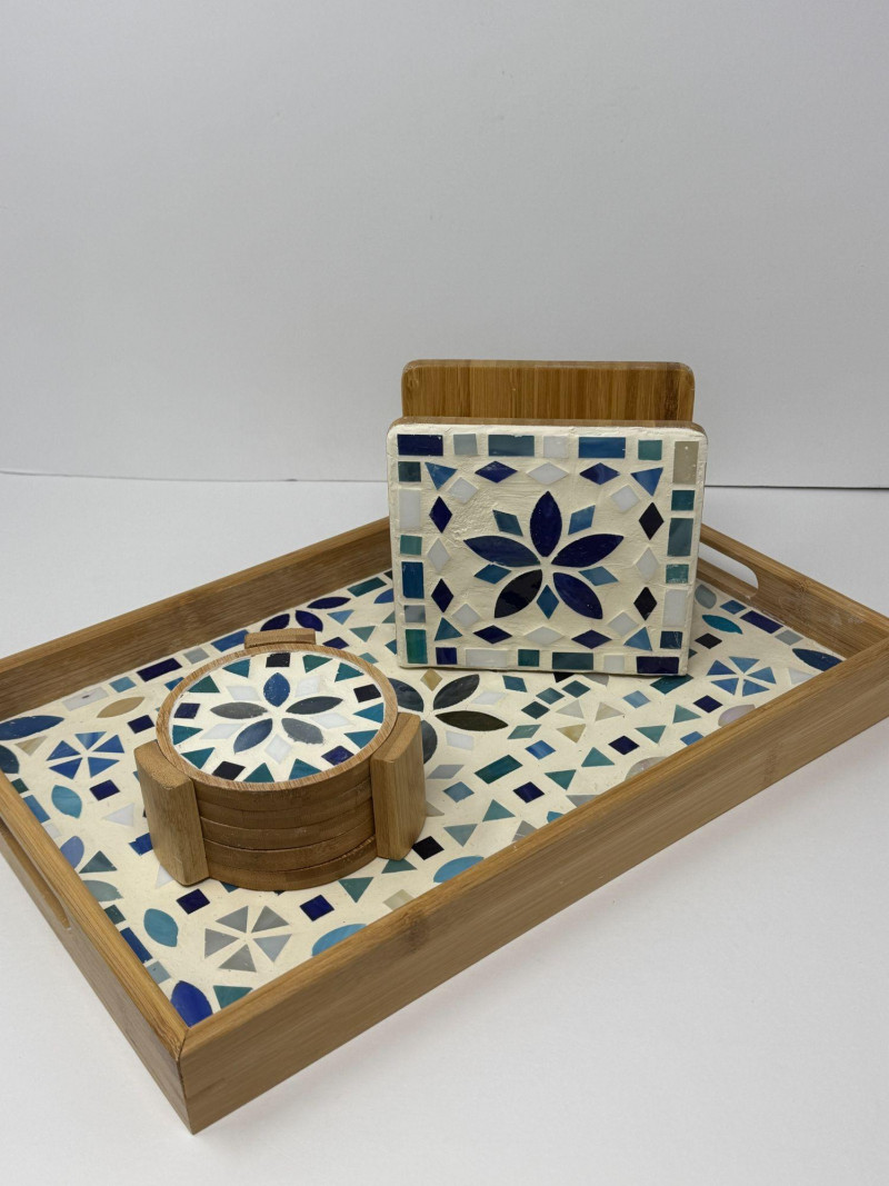 • Bamboo tray with blue mosaic tile inlay
