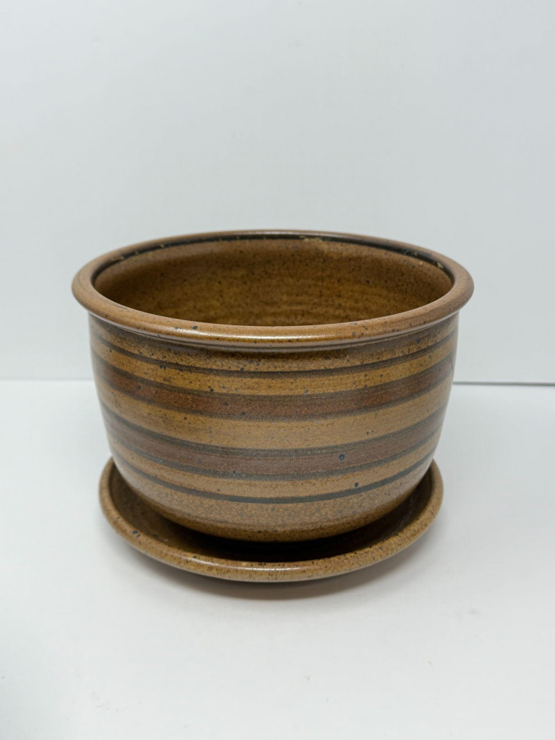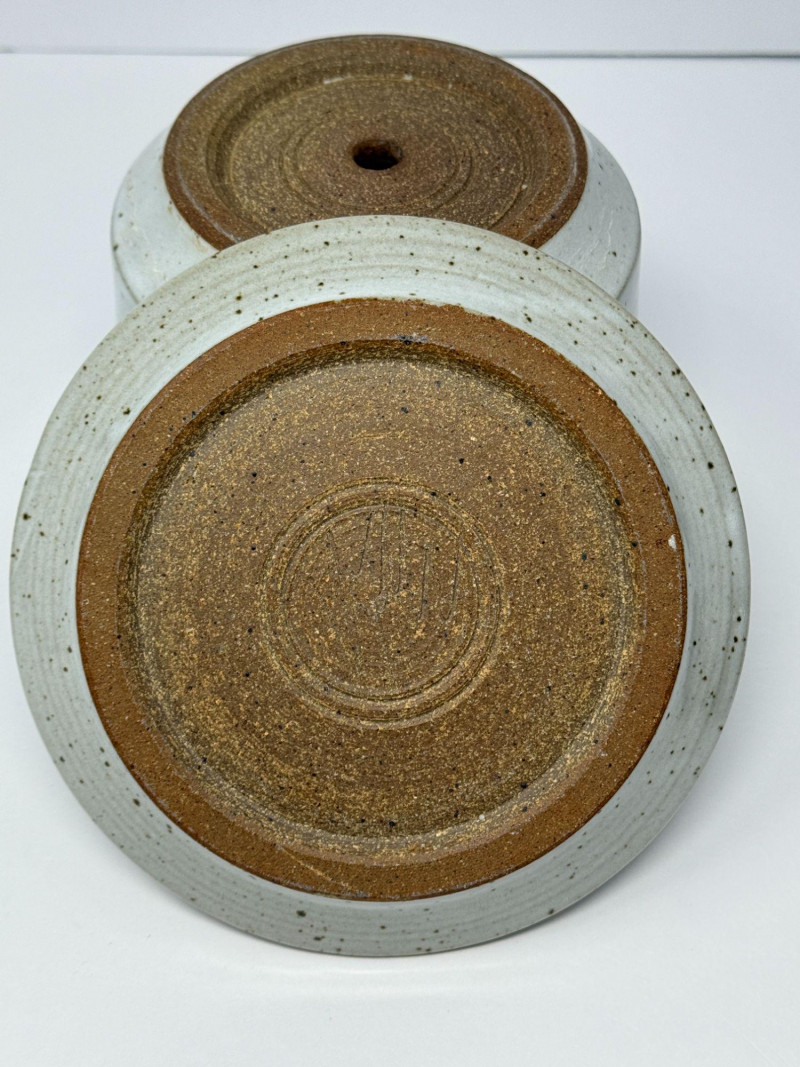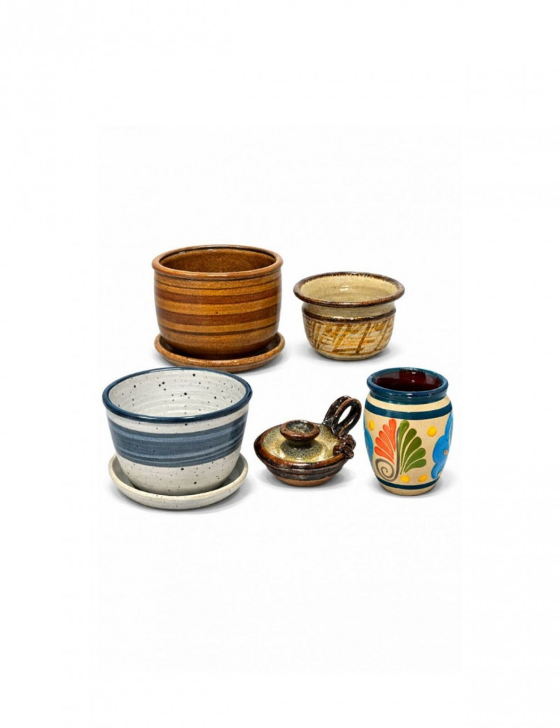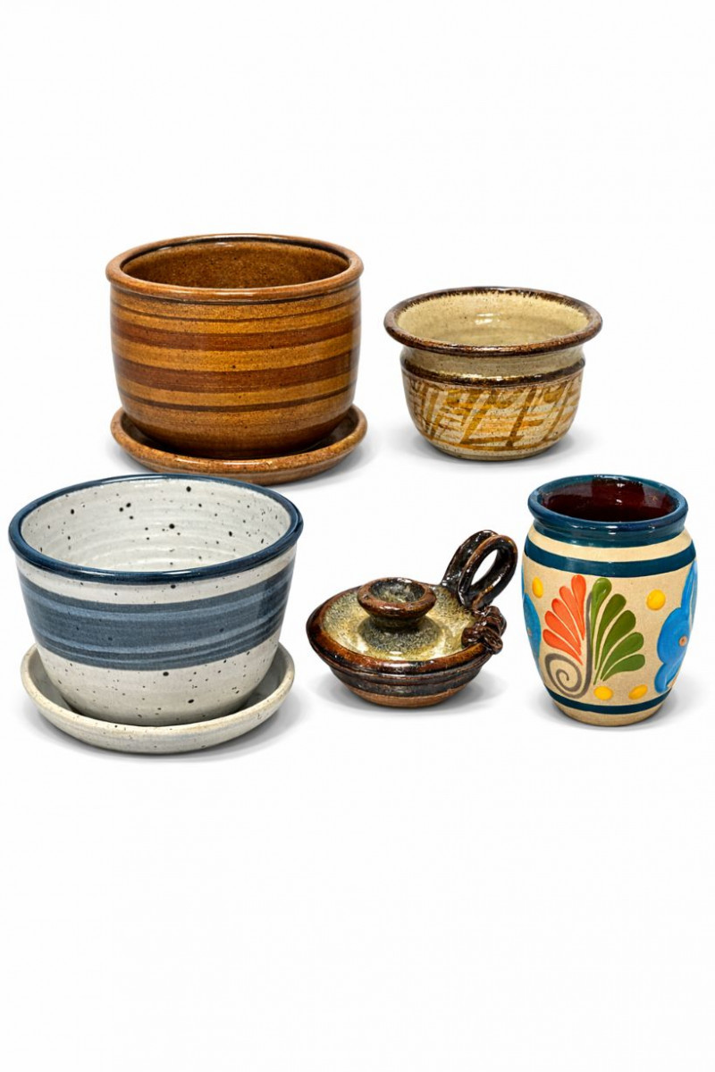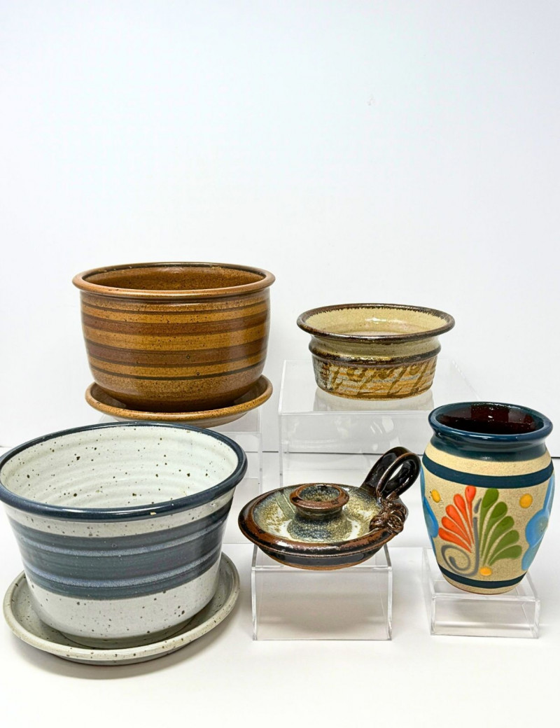 Signed Studio Pottery Lot Planters w/ Saucers Art Pottery Vase Candle Holder Nice collection of handcrafted studio pottery and art pottery pieces featuring earthy glazes, organic textures, and artisan finishes. The lot includes two signed stoneware planters with matching saucers, a signed pottery bowl, a hand-thrown candle holder, and a decorative floral art pottery vase. Both planters feature speckled stoneware clay bodies with horizontal banded glazes, drainage holes, and matching drip saucers. The bases are signed with a monogram stamp, indicating handmade studio pottery craftsmanship. Also included is a signed pottery bowl with earthy glaze pattern, a handcrafted stoneware candle holder with loop handle, and a colorful raised floral decorative vase with a folk-art style design. This grouping offers a variety of studio ceramics ideal for plants, rustic décor, or pottery collectors. Includes Condition
