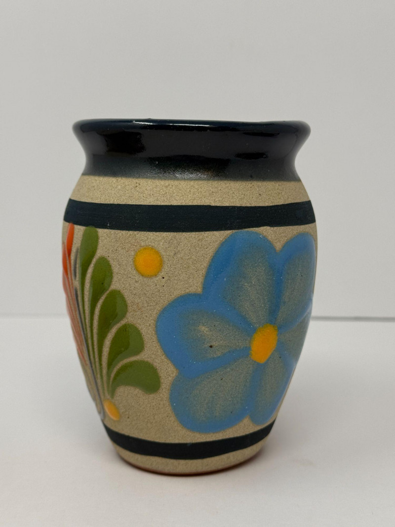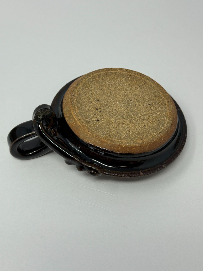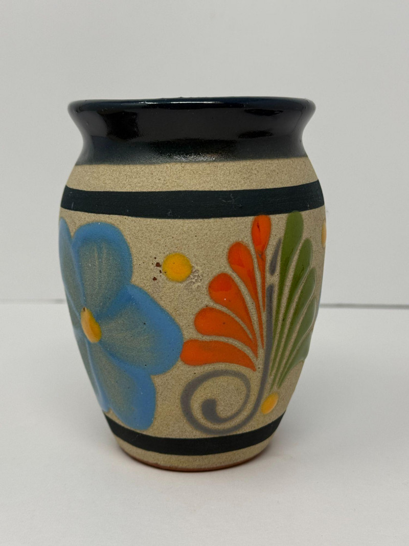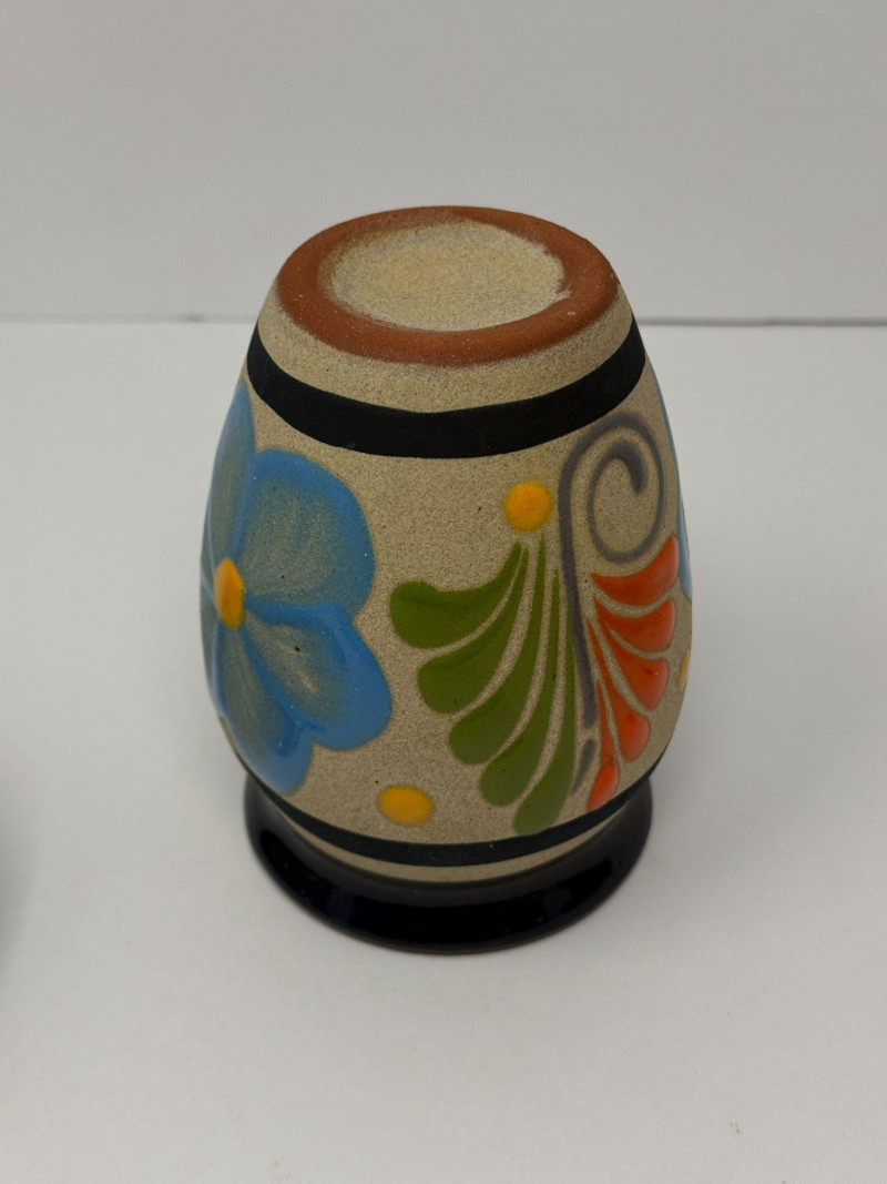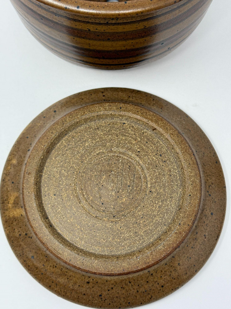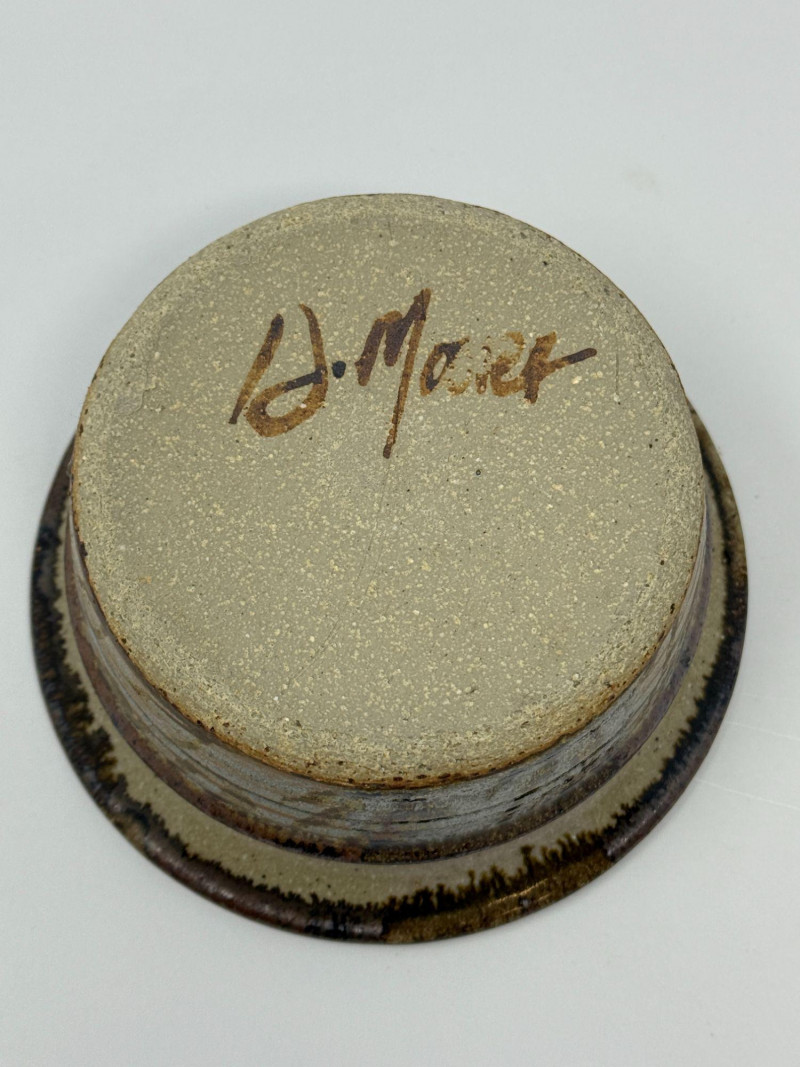 Signed Studio Pottery Lot Planters w/ Saucers Art Pottery Vase Candle Holder Nice collection of handcrafted studio pottery and art pottery pieces featuring earthy glazes, organic textures, and artisan finishes. The lot includes two signed stoneware planters with matching saucers, a signed pottery bowl, a hand-thrown candle holder, and a decorative floral art pottery vase. Both planters feature speckled stoneware clay bodies with horizontal banded glazes, drainage holes, and matching drip saucers. The bases are signed with a monogram stamp, indicating handmade studio pottery craftsmanship. Also included is a signed pottery bowl with earthy glaze pattern, a handcrafted stoneware candle holder with loop handle, and a colorful raised floral decorative vase with a folk-art style design. This grouping offers a variety of studio ceramics ideal for plants, rustic décor, or pottery collectors. Includes Condition