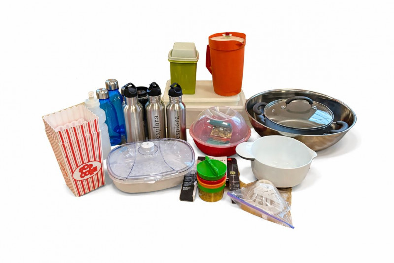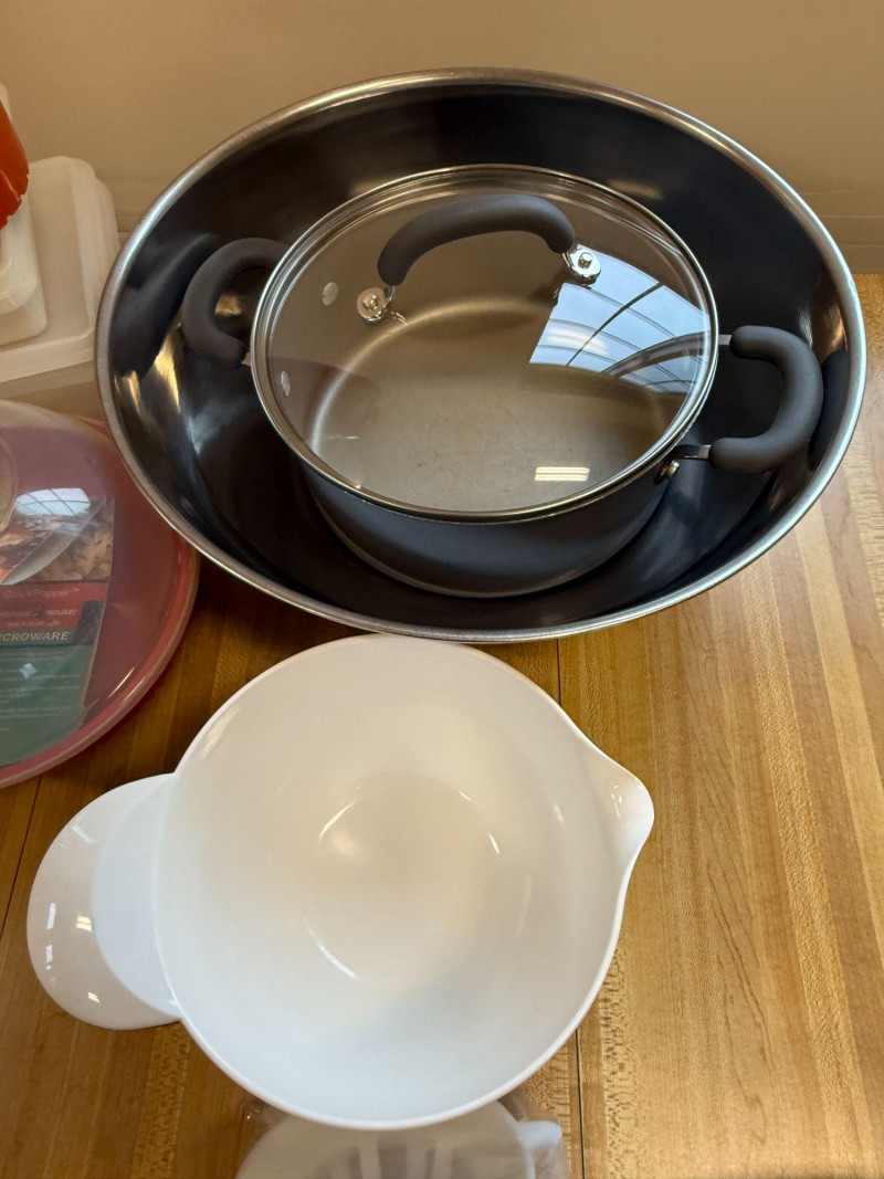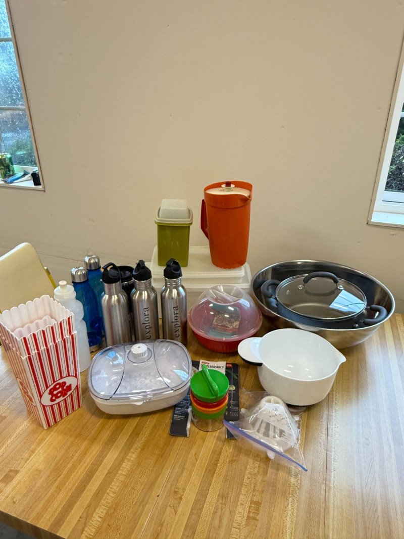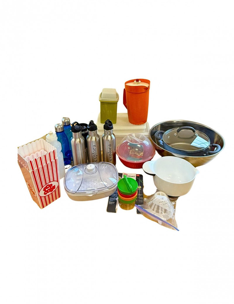 Mixed Kitchenware Lot Cookware Bottles Containers Popcorn Bowl OXO Spiralizer Assorted mixed kitchenware and household lot featuring a variety of cookware, drink bottles, storage containers, and kitchen tools. This grouping includes practical everyday items useful for cooking, food prep, and storage. The lot includes a stainless steel pot with lid and large stainless mixing bowl, along with a white mixing bowl with handle for baking or food preparation. A microwave popcorn bowl with vented lid is also included. Also included are several reusable drink bottles, including stainless steel “Explora” bottles, along with additional plastic water bottles. Kitchen prep items include an OXO SoftWorks handheld spiralizer and assorted small kitchen accessories and containers. Additional items include plastic storage containers with lids, a vintage style plastic pitcher, popcorn serving containers, and a few miscellaneous kitchen tools and accessories. A useful mixed kitchen starter lot with a variety of practical items for cooking, food prep, storage, and everyday use. Includes Condition