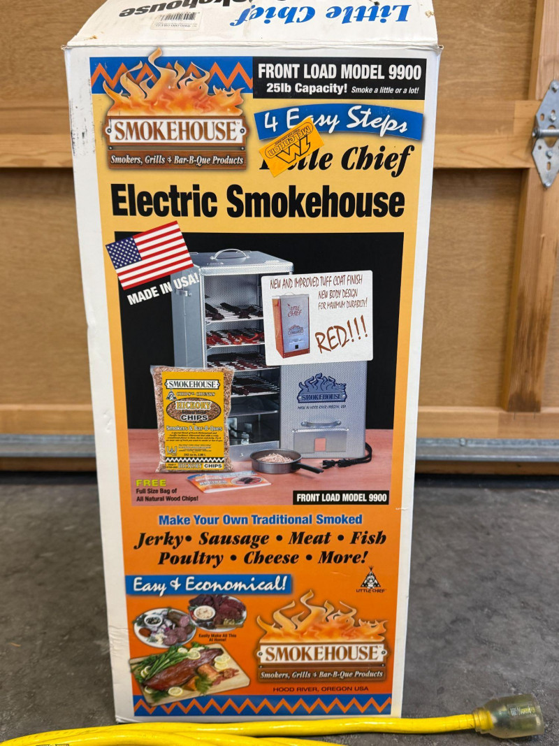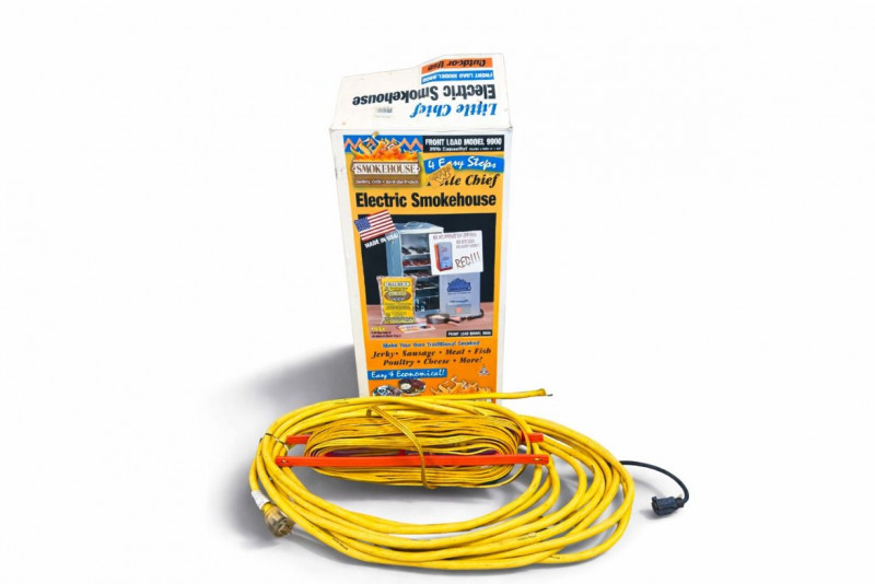 Little Chief Electric Smoker & Extension Cords Smokehouse Products Little Chief Electric Smokehouse, Front Load Model 9900, made in Hood River, Oregon, USA, offered together with two heavy-duty Yellow Jacket extension cords. This compact electric smoker is designed for smoking jerky, sausage, fish, poultry, cheese, and other foods using natural wood chips. The lot includes the smoker unit, interior racks, heating element pan, original product box, recipe and operating instruction booklet, and two industrial-grade Yellow Jacket extension cords, one mounted on a cord reel and one loose coil. These durable cords are commonly used for outdoor equipment, workshops, and job sites. Little Chief smokers are well known among outdoor cooking enthusiasts for their consistent low-temperature smoking and durable aluminum cabinet construction. The included instruction booklet provides over 50 recipes and operating guidance, making it easy to prepare traditional smoked meats and fish. Comparable Little Chief electric smokers typically sell in the $80–$150 range depending on condition, while heavy-duty Yellow Jacket extension cords can retail $50–$100 each depending on length and gauge, giving this lot an estimated combined value of approximately $180–$300.