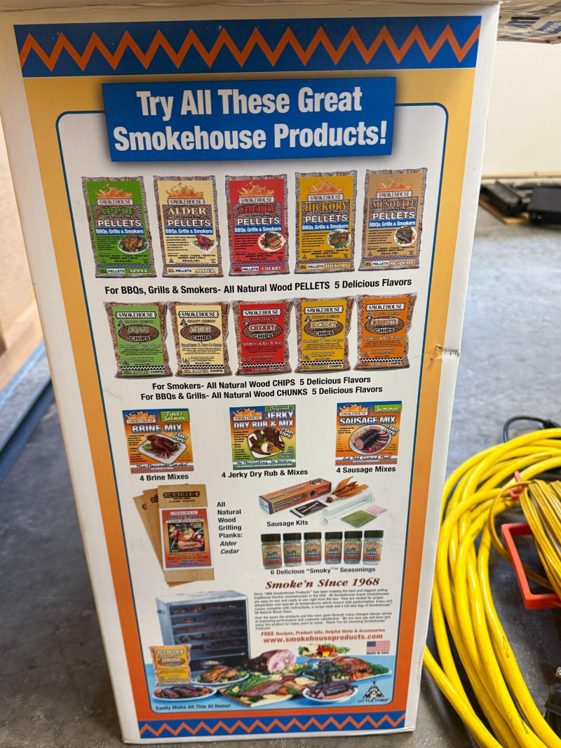 Pre-owned condition. Smoker shows normal interior residue consistent with prior food smoking use. Exterior cabinet appears in good overall condition. Original box shows storage wear. Extension cords show typical cosmetic wear from use but appear intact. Untested at time of cataloging.