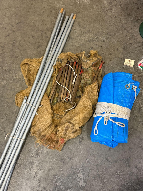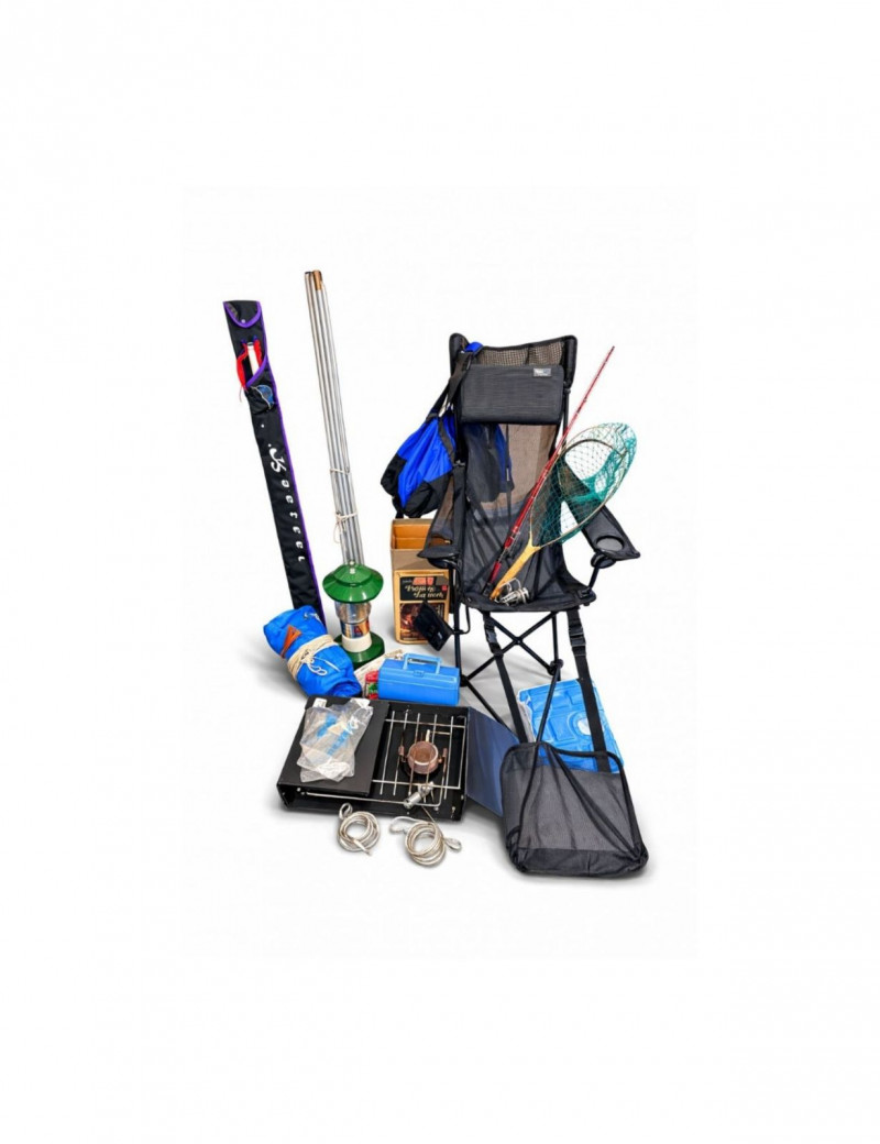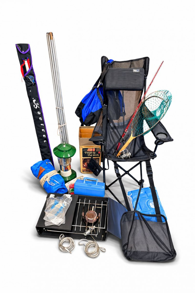 Assorted outdoor recreation lot featuring fishing and camping equipment. This grouping includes a fishing rod with spinning reel, landing net, portable propane camp stove, Coleman propane lantern with box, folding camp chair with footrest, and additional camping accessories. Also included are tent poles, a tarp, rope, water pouches, and a fishing rod carrying case. A practical mixed lot for camping, fishing trips, or general outdoor use.